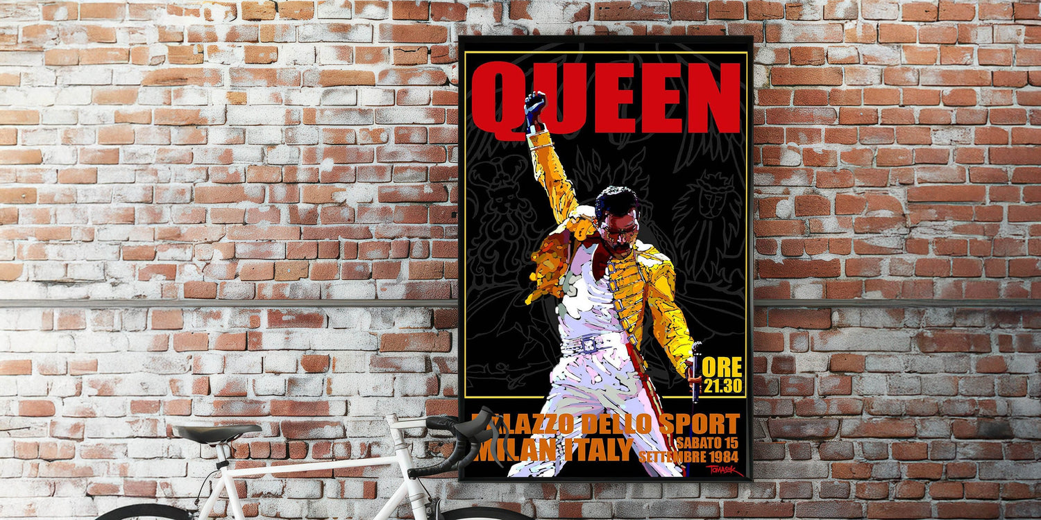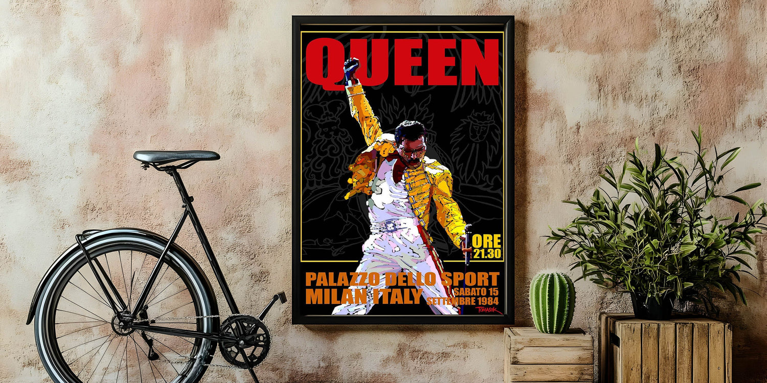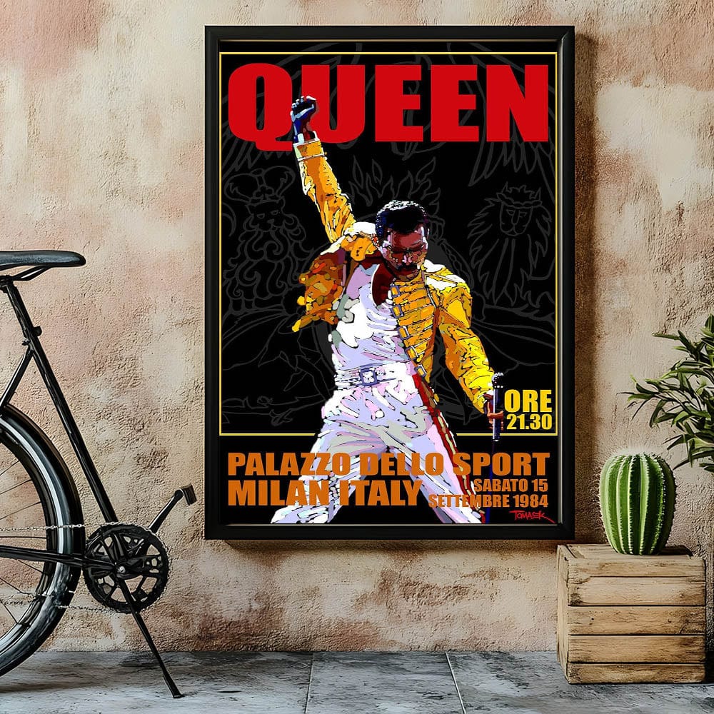 This vibrant poster immortalizes one of Queen’s most memorable performances in Italy. Add it to your collection and enjoy a piece of music history that showcases the iconic Freddie Mercury and the band in their prime.