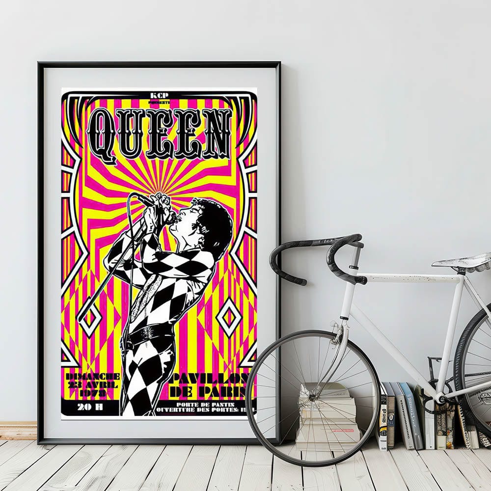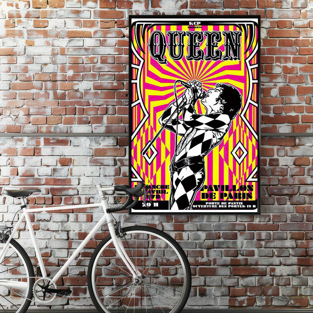 Add a burst of color and energy to your space with this vibrant Queen retro poster art. Featuring an iconic image of Freddie Mercury in a bold, graphic design, this poster perfectly captures the essence of 1970s concert culture. The striking yellow and pink rays, paired with the black and white diamond pattern, bring a nostalgic vibe that celebrates Queen's timeless impact on music and pop culture.