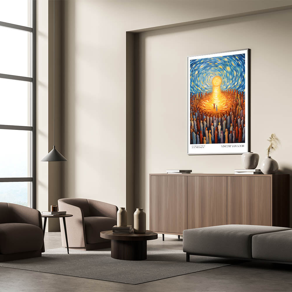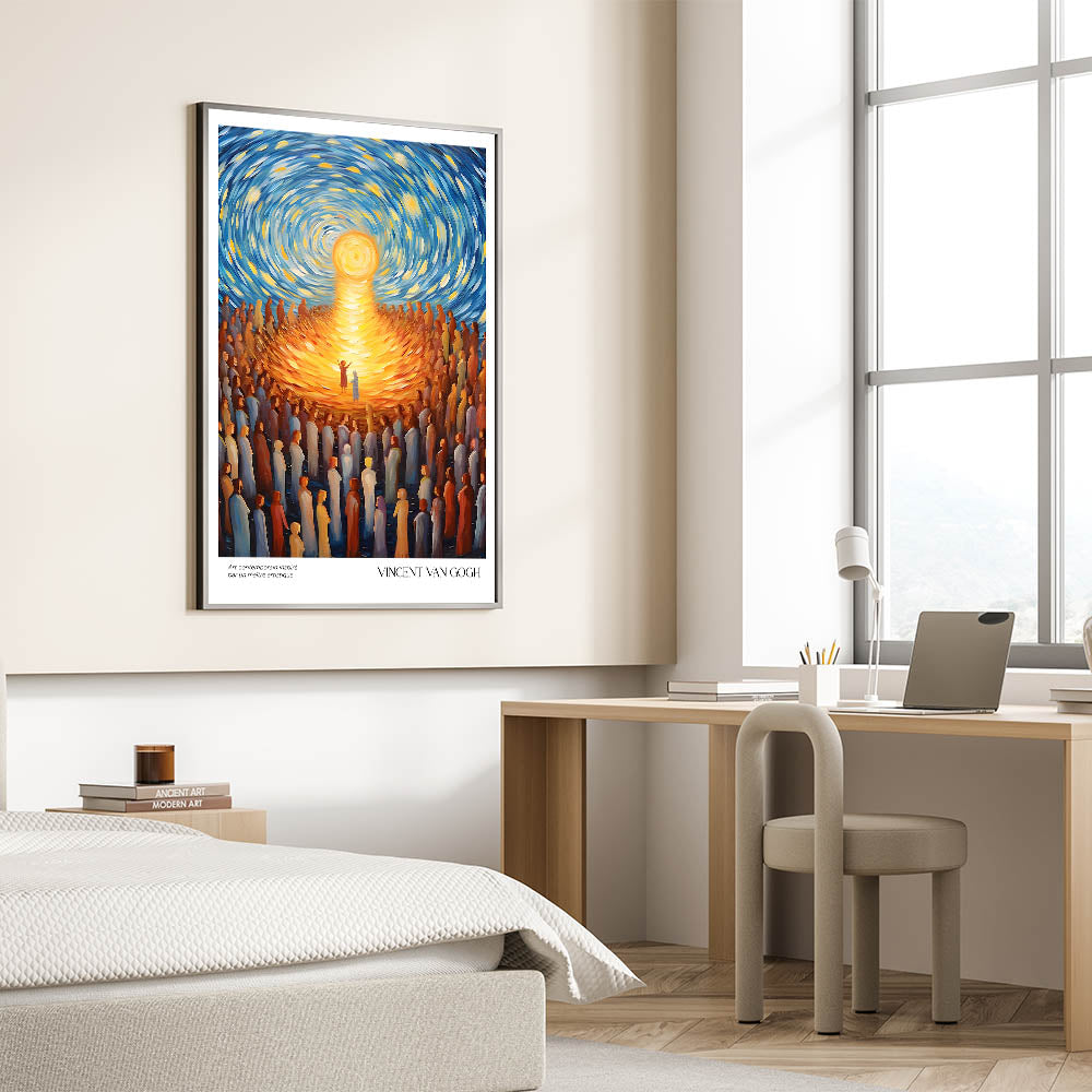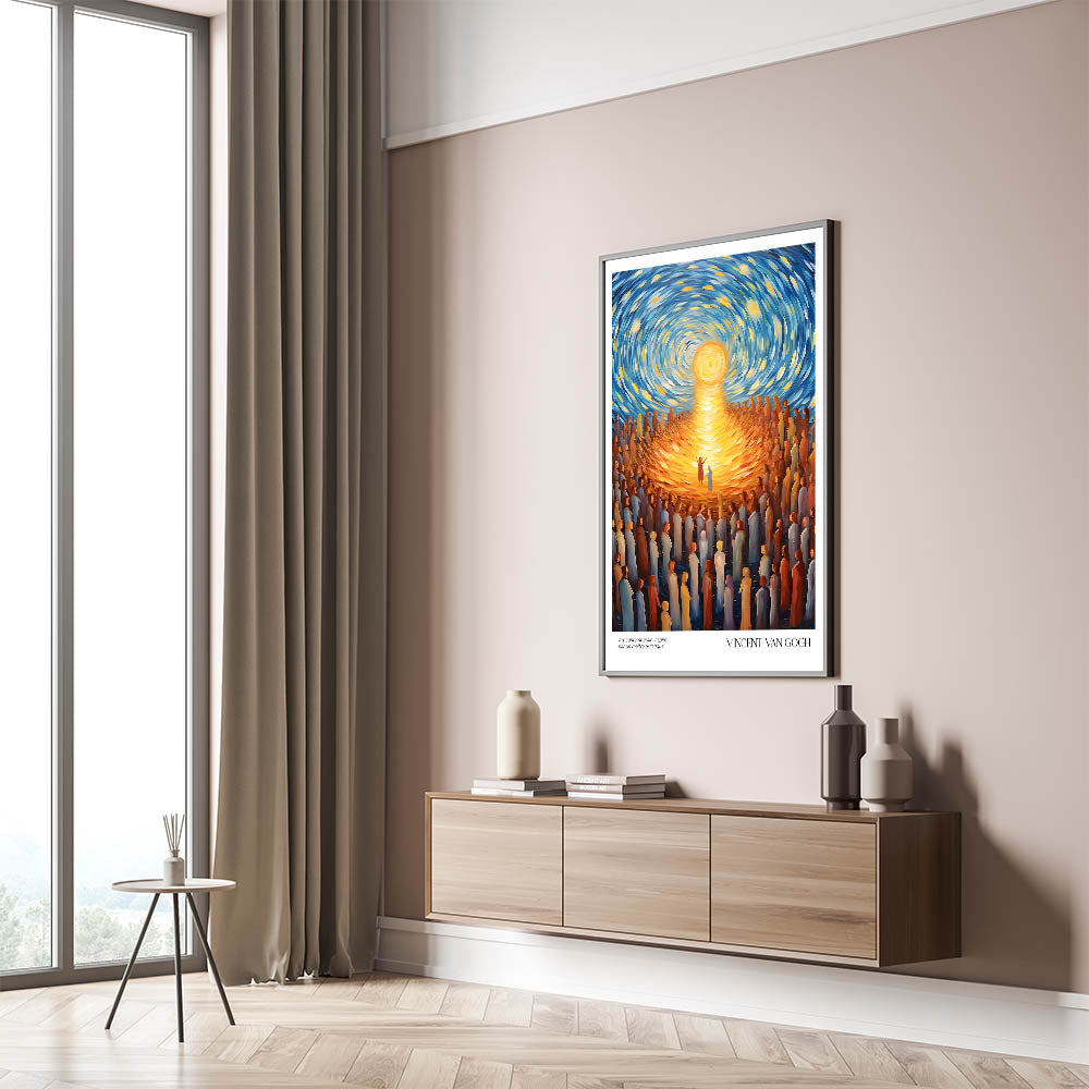 Celebrate the vibrancy of life with Vincent van Gogh’s Radiant Gathering Under Sunlight, a dynamic artwork that captures the brilliance of community and connection. With its swirling skies, glowing sun, and a sea of figures drawn towards the light, this Van Gogh canvas print combines movement, emotion, and a radiant palette of gold and blue. This stunning piece is perfect for uplifting any space with its timeless message of unity and warmth.