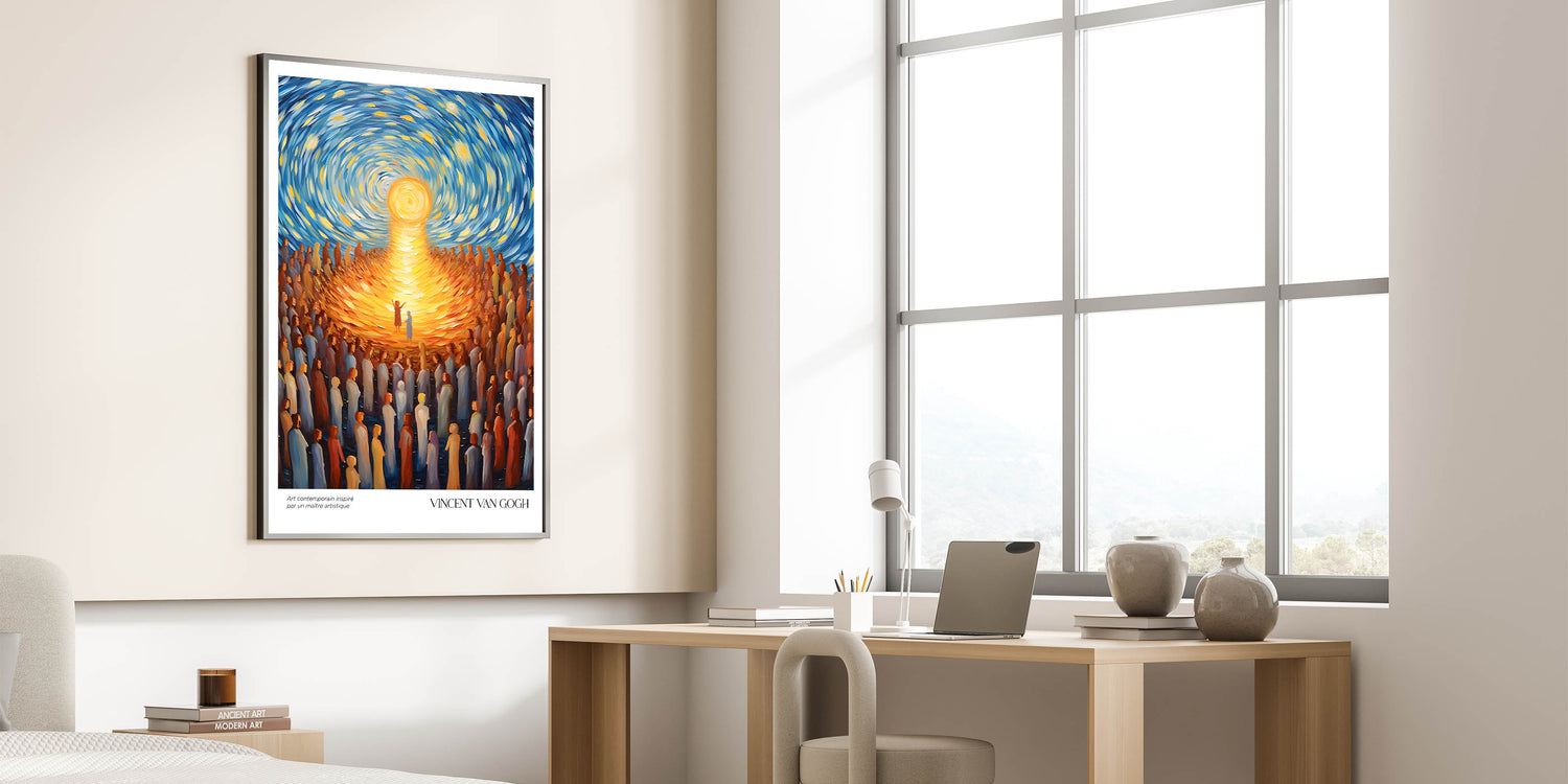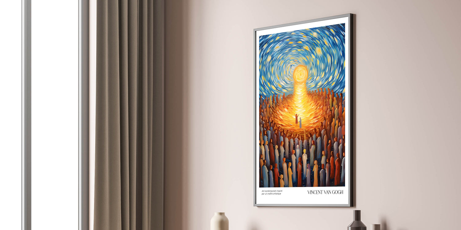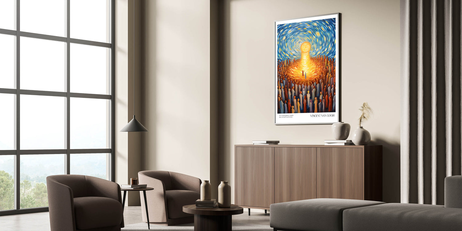 Celebrate the vibrancy of life with Vincent van Gogh’s Radiant Gathering Under Sunlight, a dynamic artwork that captures the brilliance of community and connection. With its swirling skies, glowing sun, and a sea of figures drawn towards the light, this Van Gogh canvas print combines movement, emotion, and a radiant palette of gold and blue. This stunning piece is perfect for uplifting any space with its timeless message of unity and warmth.