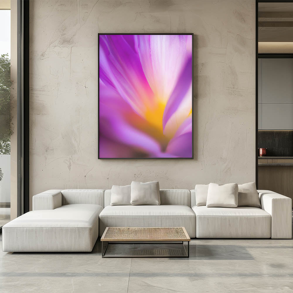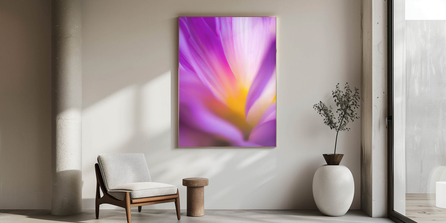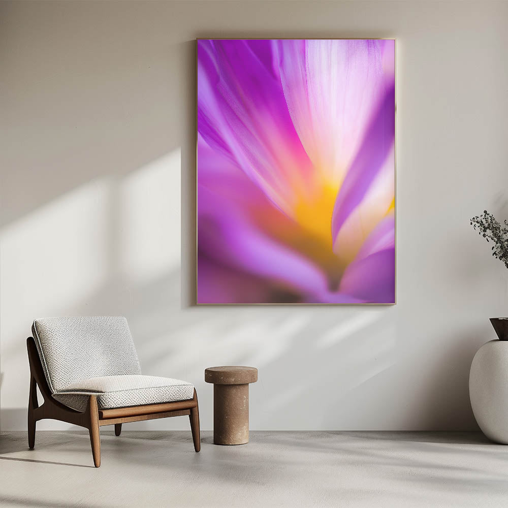 Illuminate your space with the vivid energy of this captivating piece of dynamic wall art. A close-up floral bloom bursts with fuchsia, lavender, and golden light, captured through expressive movement photography. The soft blur and radiant center create an atmosphere of warmth, energy, and gentle abstraction.