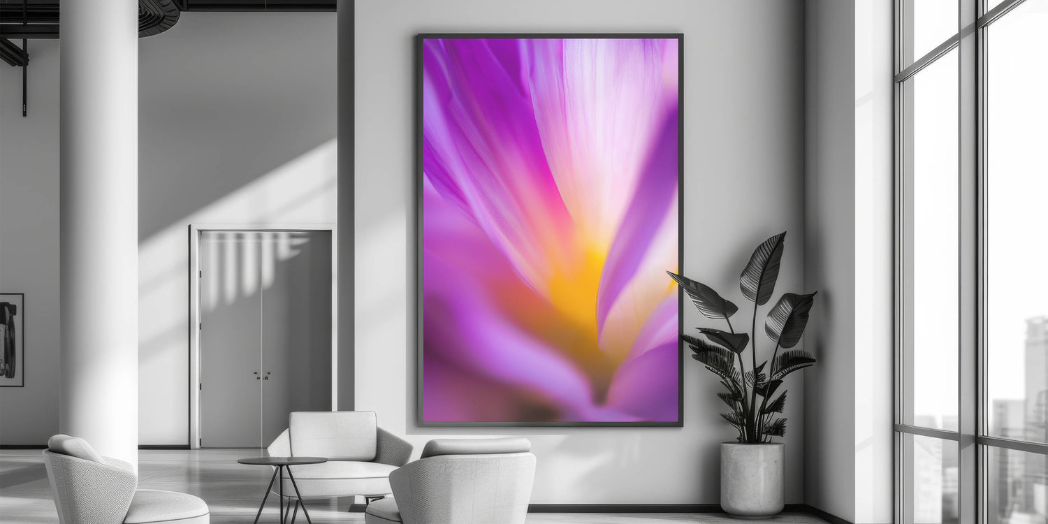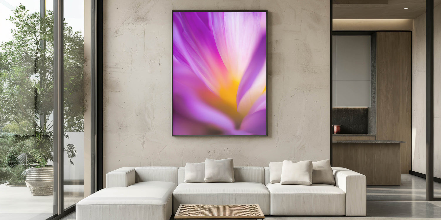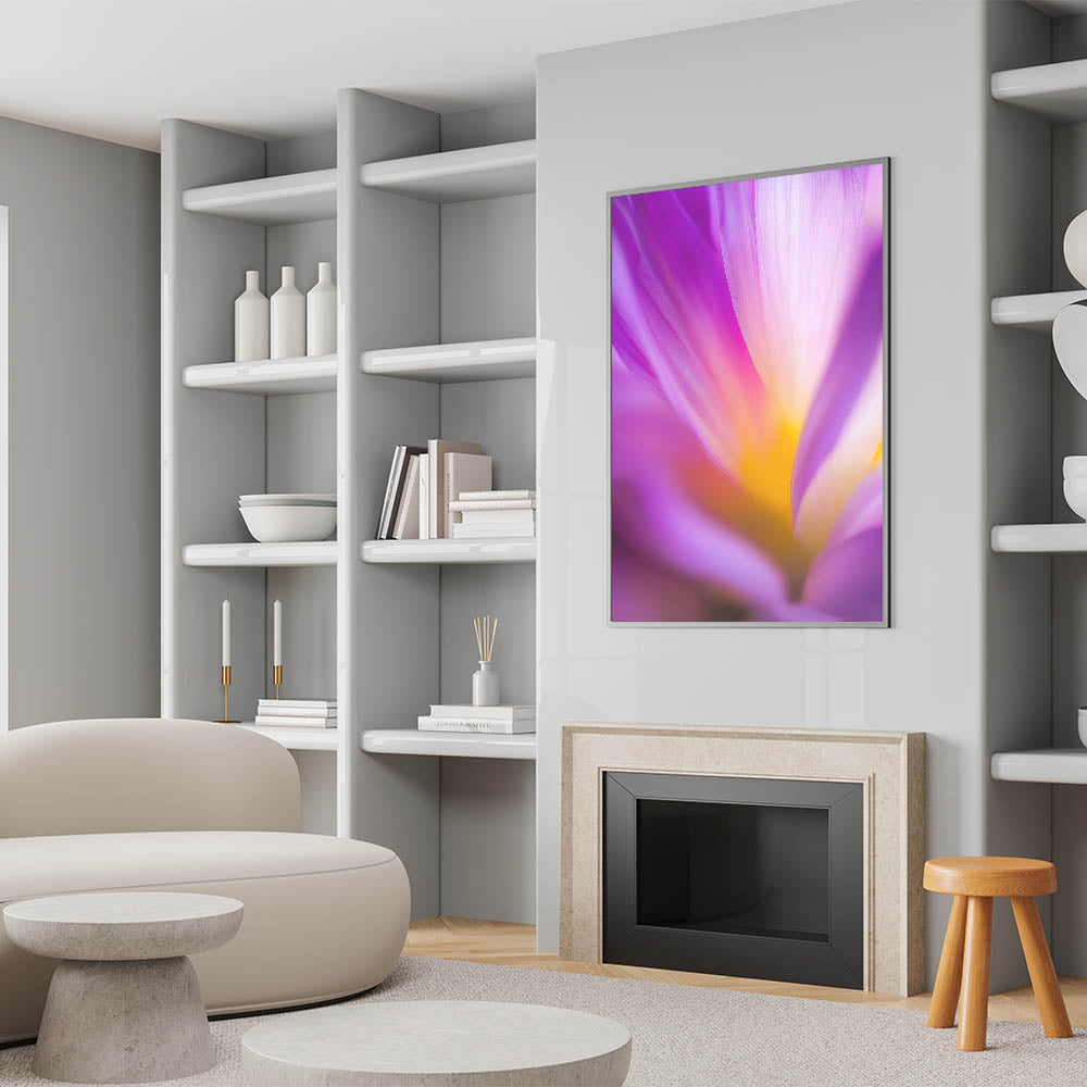 Illuminate your space with the vivid energy of this captivating piece of dynamic wall art. A close-up floral bloom bursts with fuchsia, lavender, and golden light, captured through expressive movement photography. The soft blur and radiant center create an atmosphere of warmth, energy, and gentle abstraction.