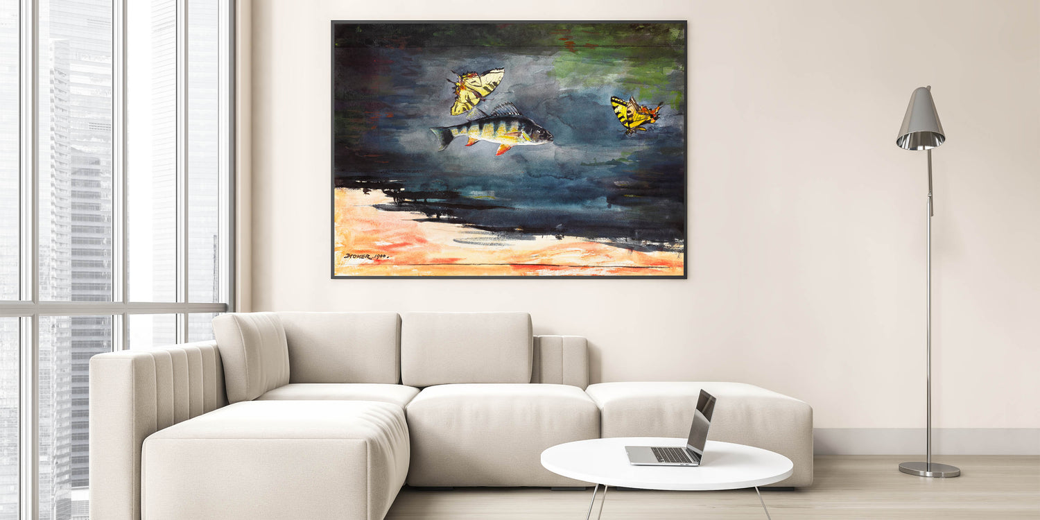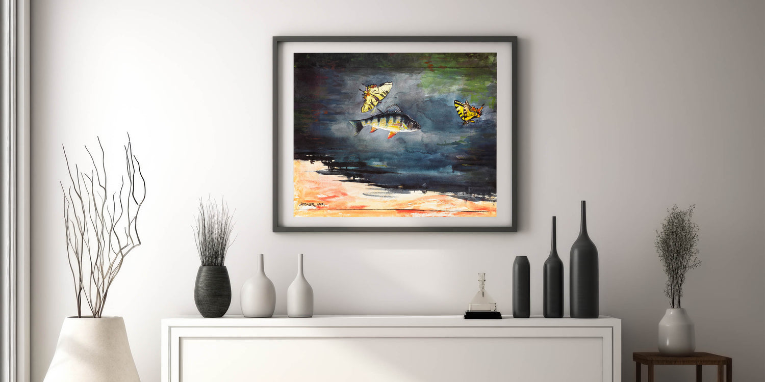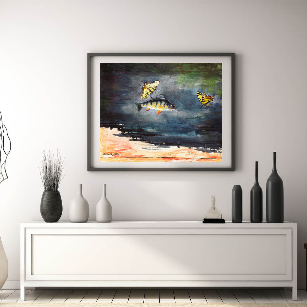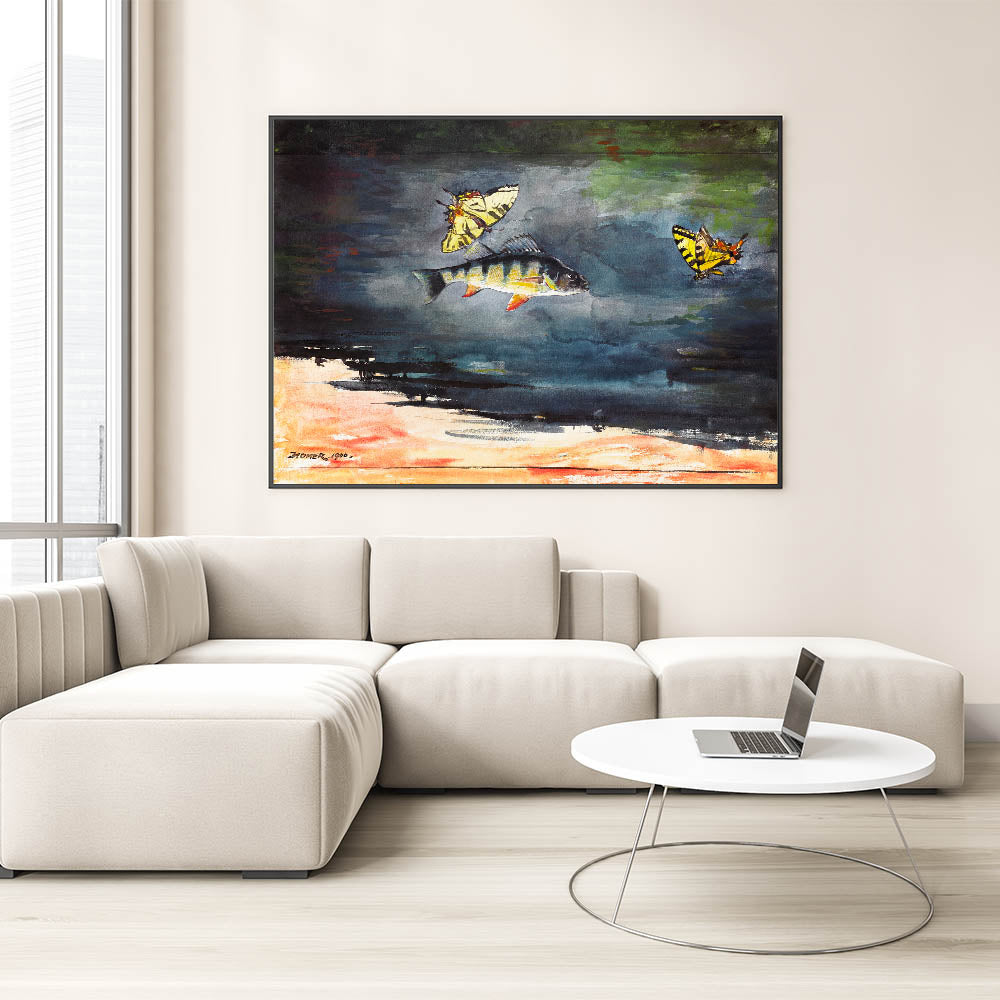 This beautiful realism art print, "Fish and Butterflies" by Winslow Homer, depicts an enchanting underwater scene where a fish and vibrant butterflies coexist in serene harmony. With rich, deep blues and bright yellow accents, this piece captures the beauty of nature in a unique and captivating way. The contrast between the delicate butterflies and the fish against a fluid water background creates an ethereal atmosphere, perfect for enhancing any space with a touch of the natural world. This artwork is ideal for nature lovers or anyone looking to bring a calming yet colorful focal point to their decor.