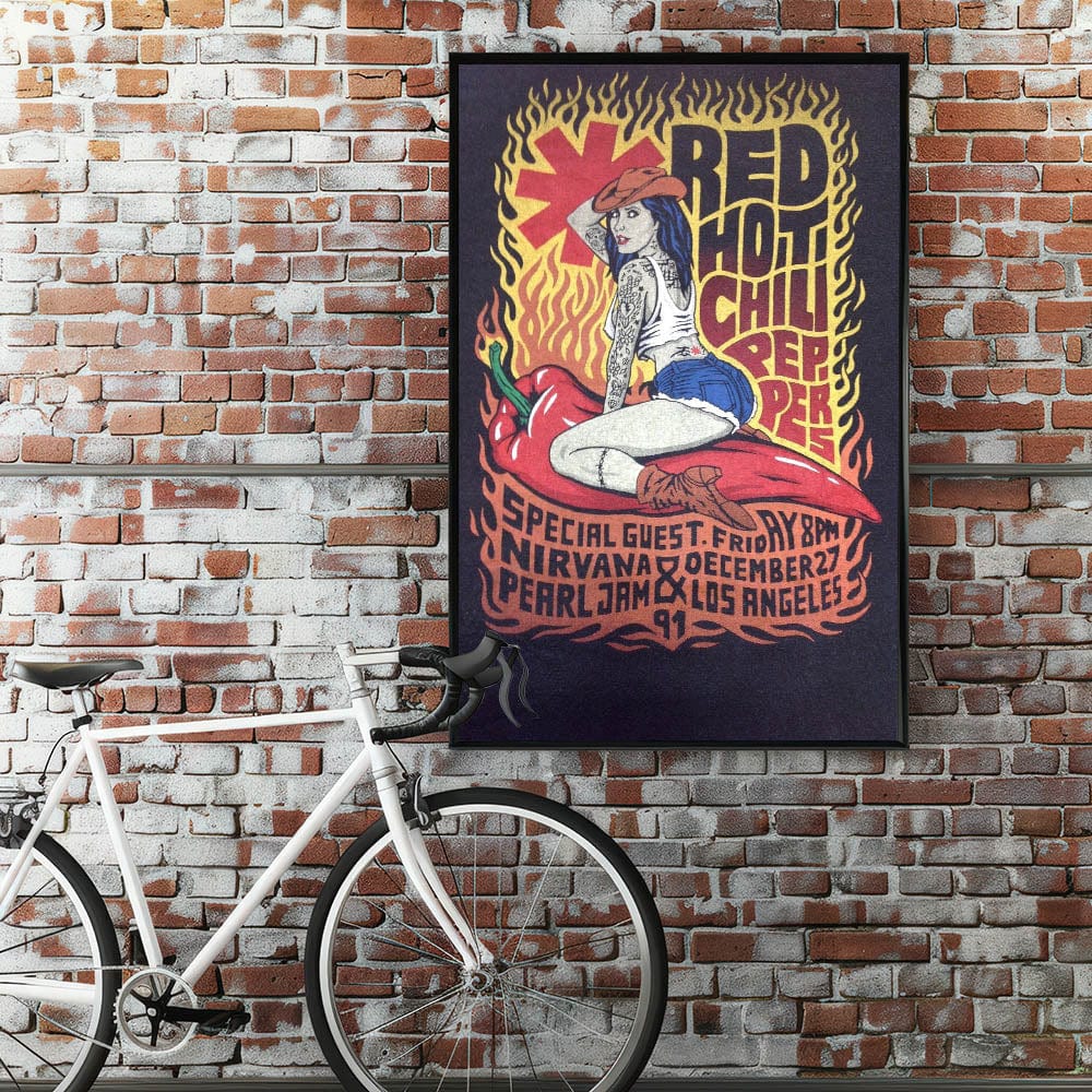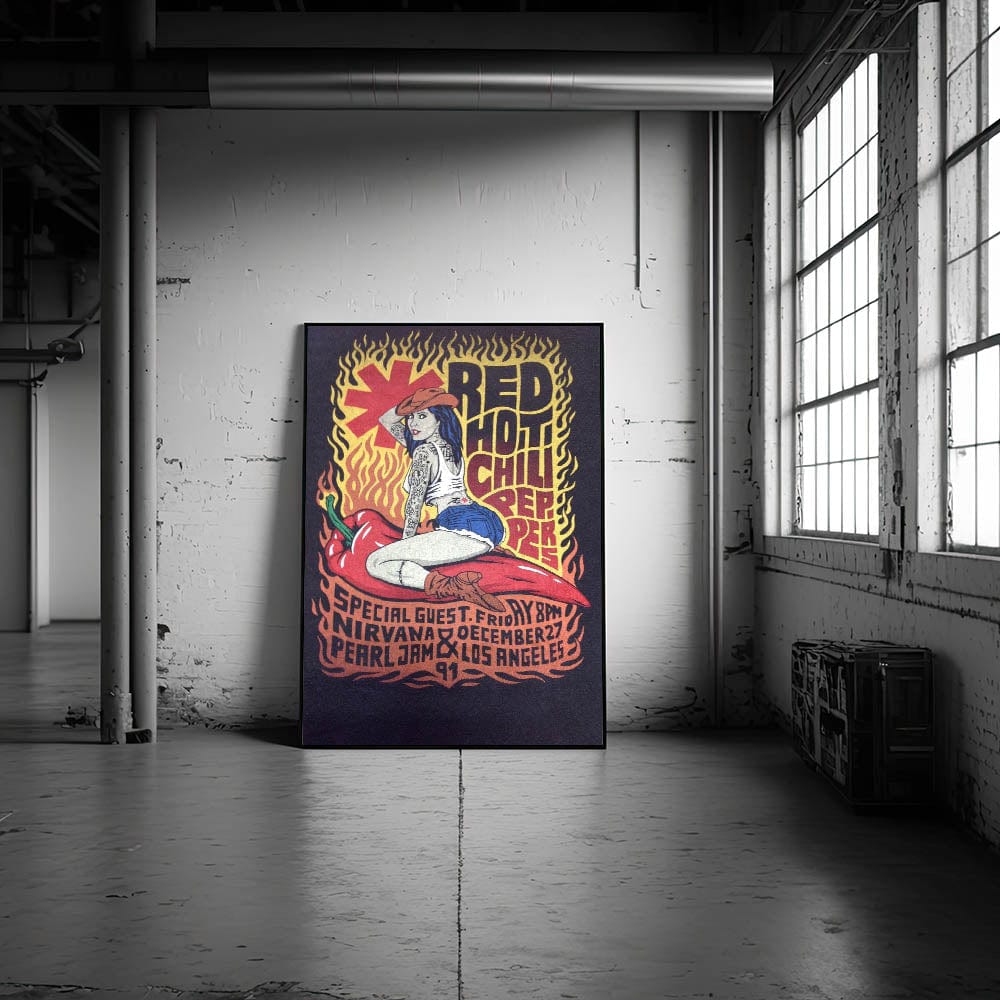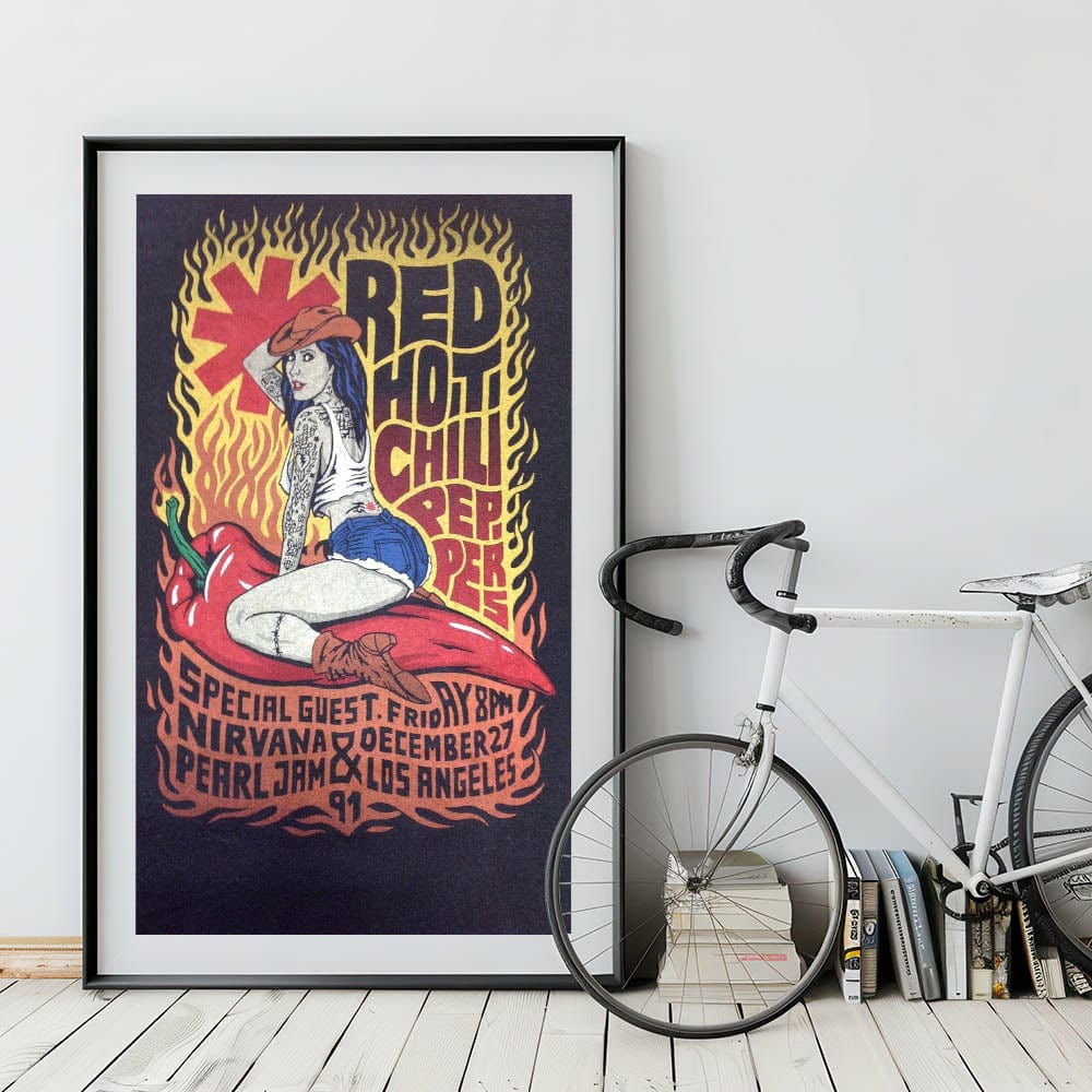 Get a taste of the ‘90s with this bold Red Hot Chili Peppers concert poster from their 1991 performance in Los Angeles, featuring special guests Nirvana and Pearl Jam. The fiery design, with a tattooed woman lounging on a chili pepper, brings together the iconic imagery of the band, their unforgettable performance, and the raw energy of the grunge era. The color palette of red, yellow, and black makes this vintage print a standout piece for any rock music enthusiast.