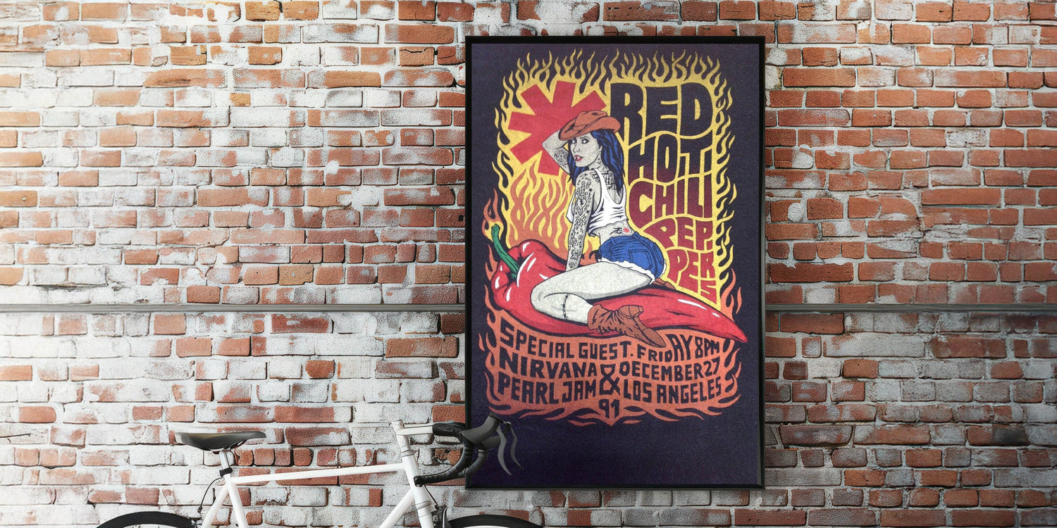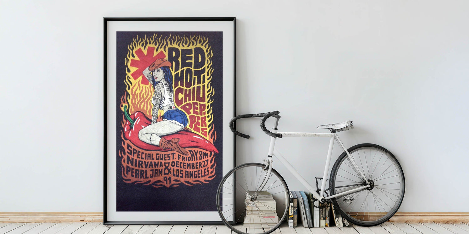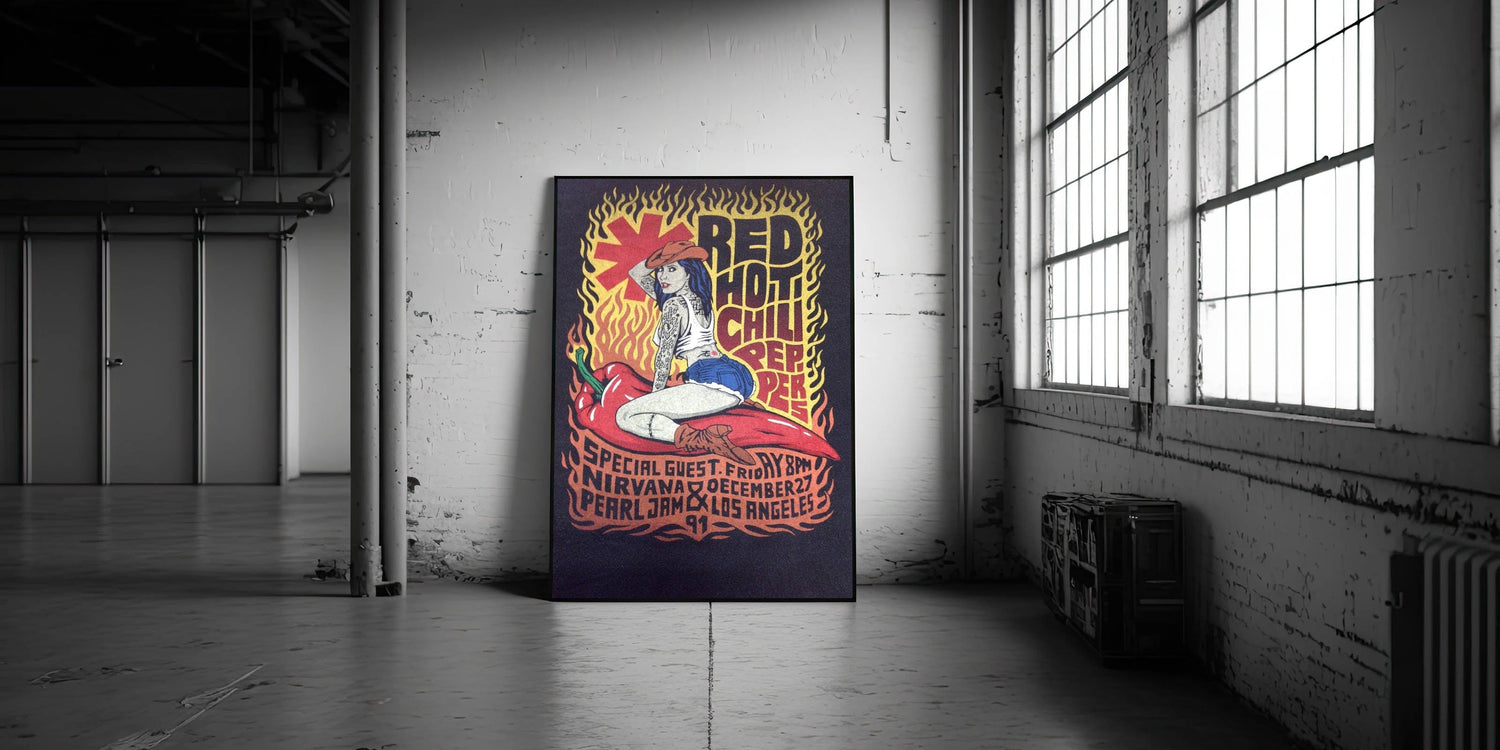 Get a taste of the ‘90s with this bold Red Hot Chili Peppers concert poster from their 1991 performance in Los Angeles, featuring special guests Nirvana and Pearl Jam. The fiery design, with a tattooed woman lounging on a chili pepper, brings together the iconic imagery of the band, their unforgettable performance, and the raw energy of the grunge era. The color palette of red, yellow, and black makes this vintage print a standout piece for any rock music enthusiast.