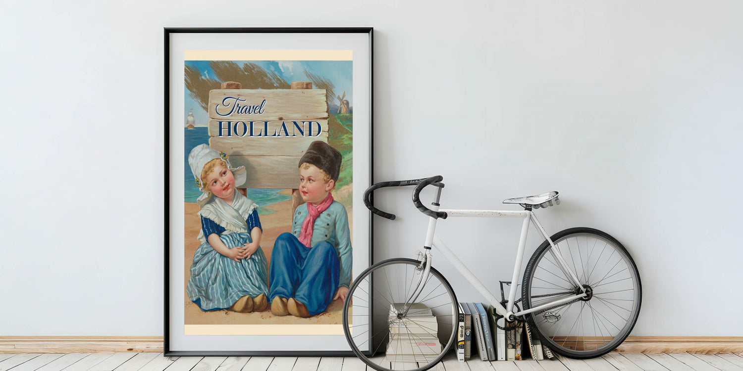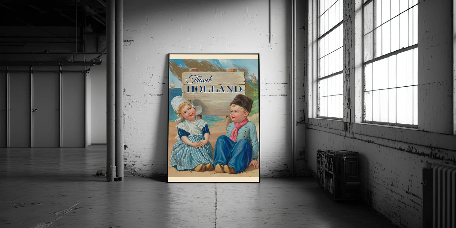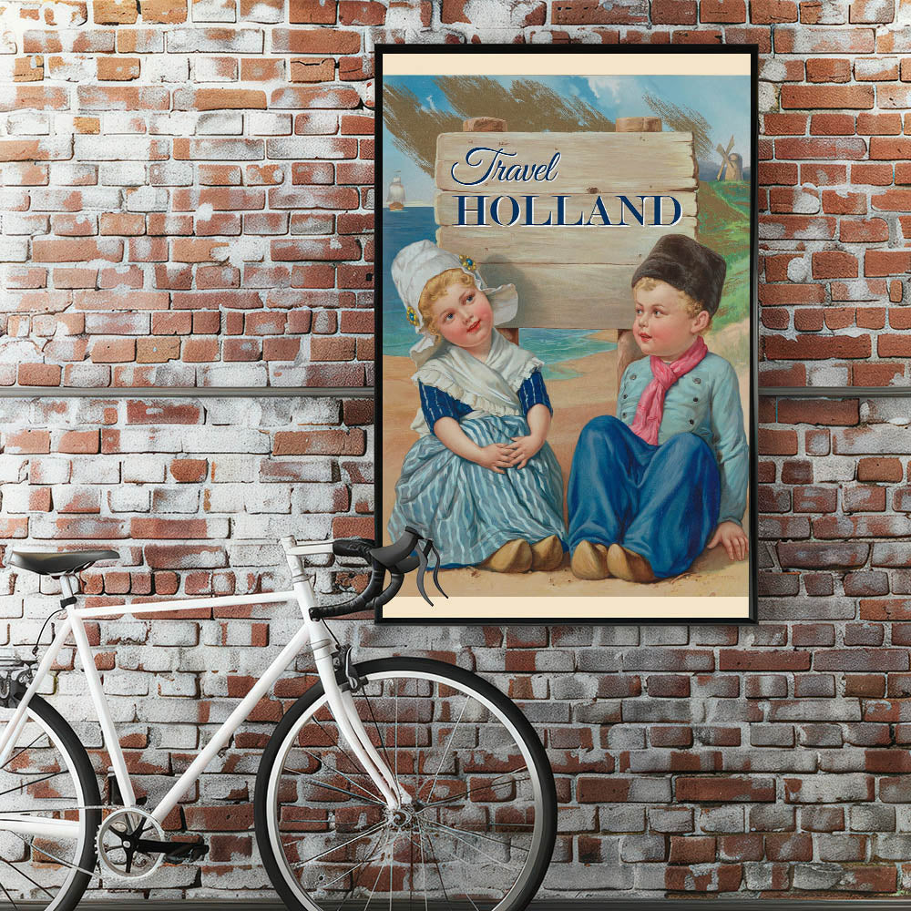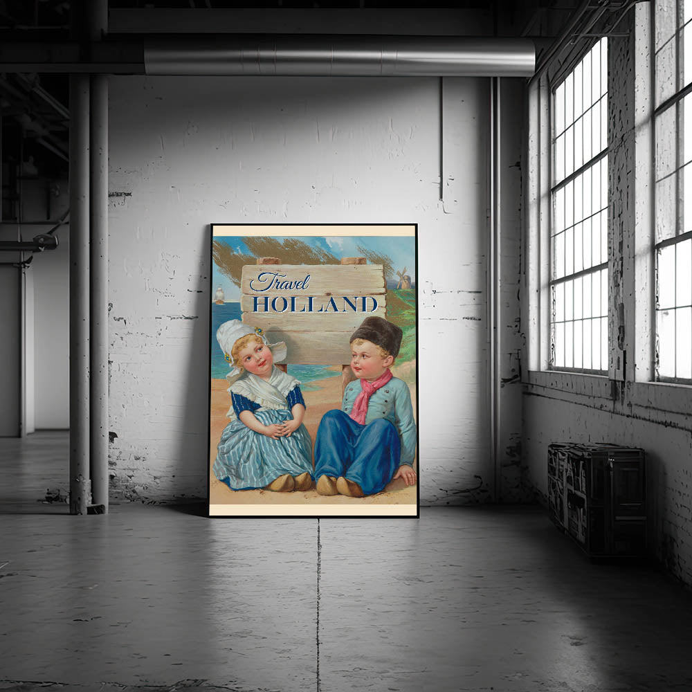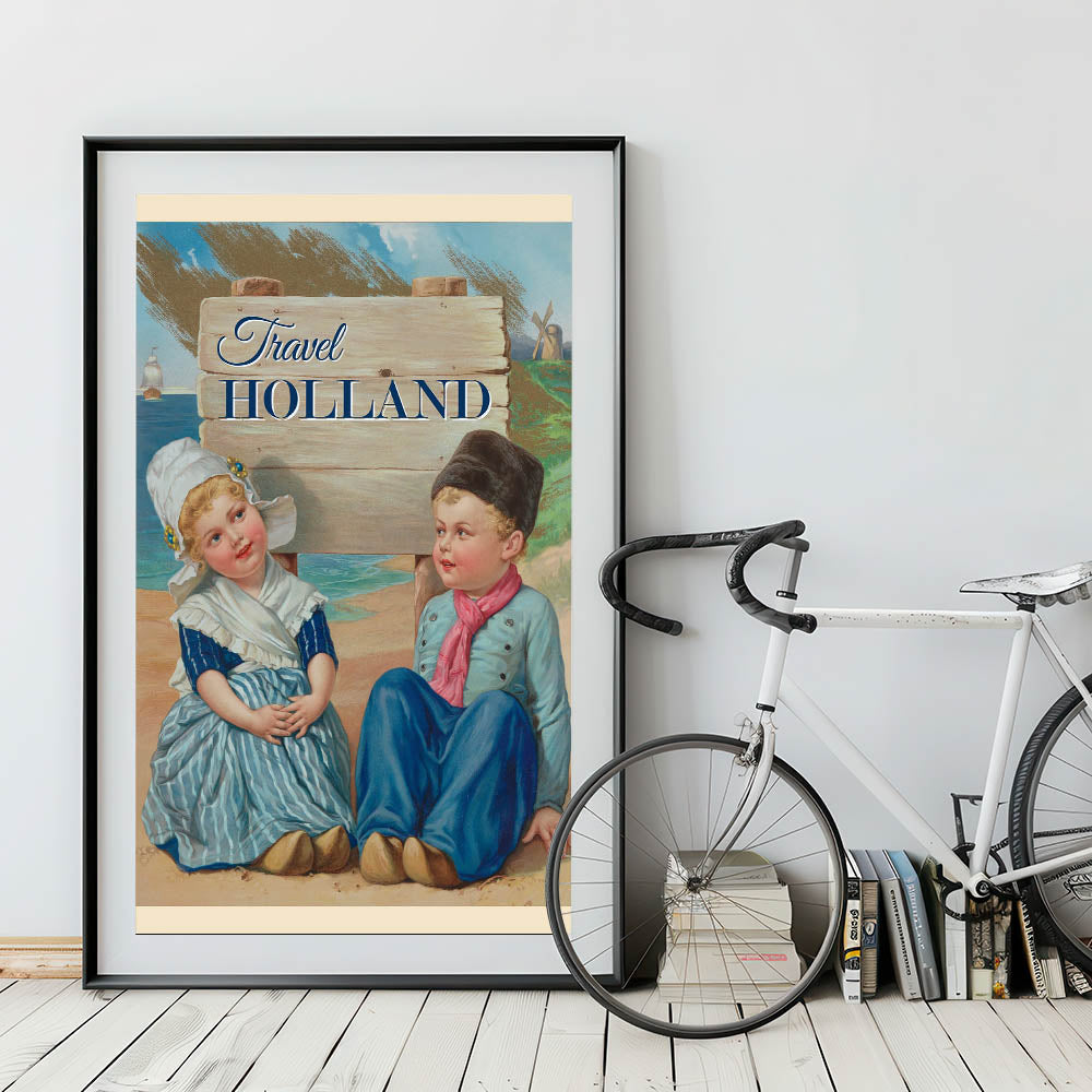 Step into the charm of Holland with this Retro Travel Poster, showcasing a delightful scene of two young Dutch children in traditional attire. Surrounded by a picturesque landscape with windmills and sailing ships, the vibrant colors and nostalgic design bring to life the essence of a classic Dutch vacation. The bold "Travel Holland" text captures the spirit of wanderlust, making this print a perfect addition for lovers of vintage travel posters or those with a special connection to the Netherlands.