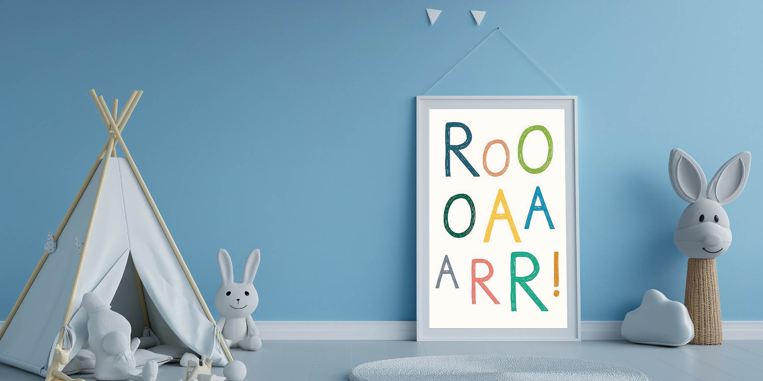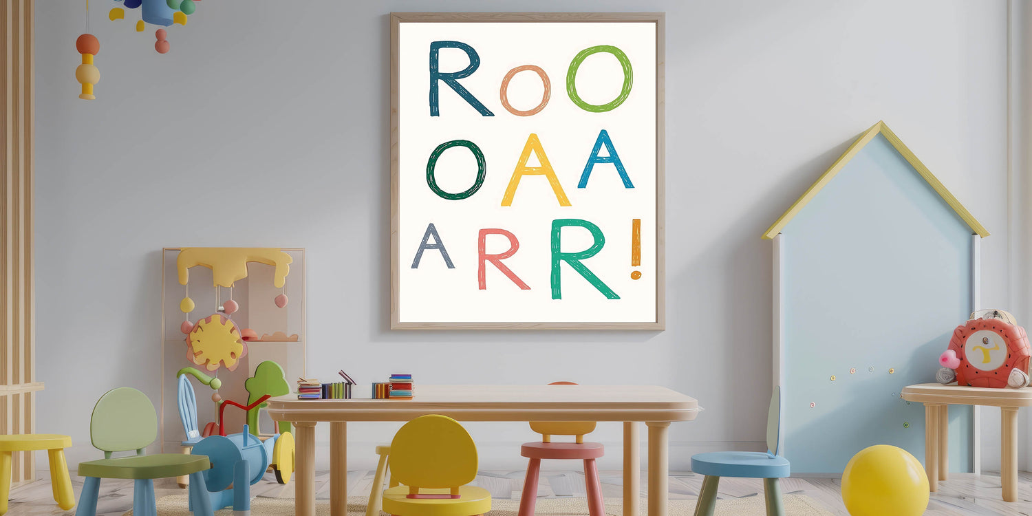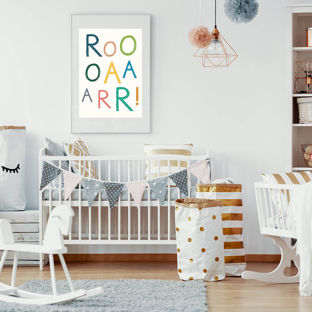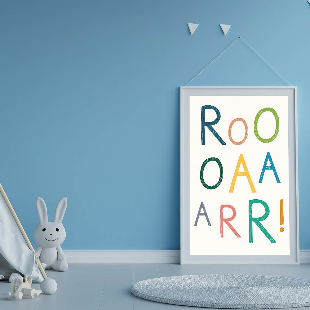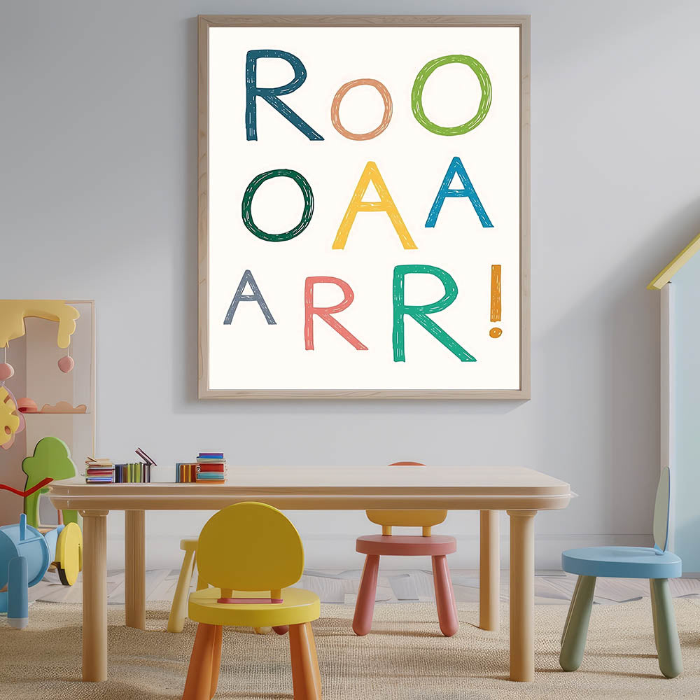 Inspire adventure and creativity with this ROAR! dinosaur-themed nursery wall art. Featuring bold, playful typography in a variety of vibrant colors, this artwork is perfect for baby room decor, children's wall art, and kids' room art prints. Designed with a hand-drawn style, this fun and dynamic print brings energy and excitement to any nursery, playroom, or toddler’s bedroom.