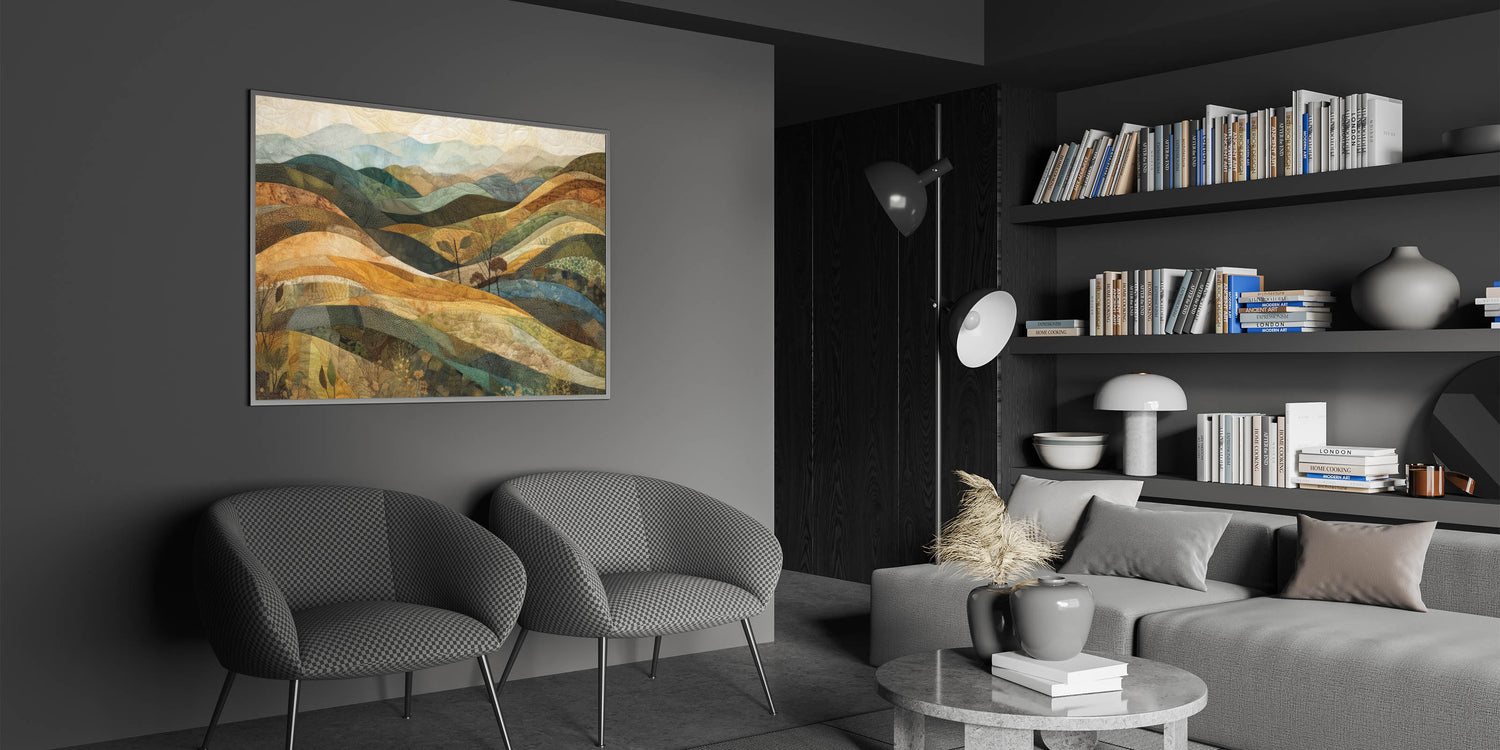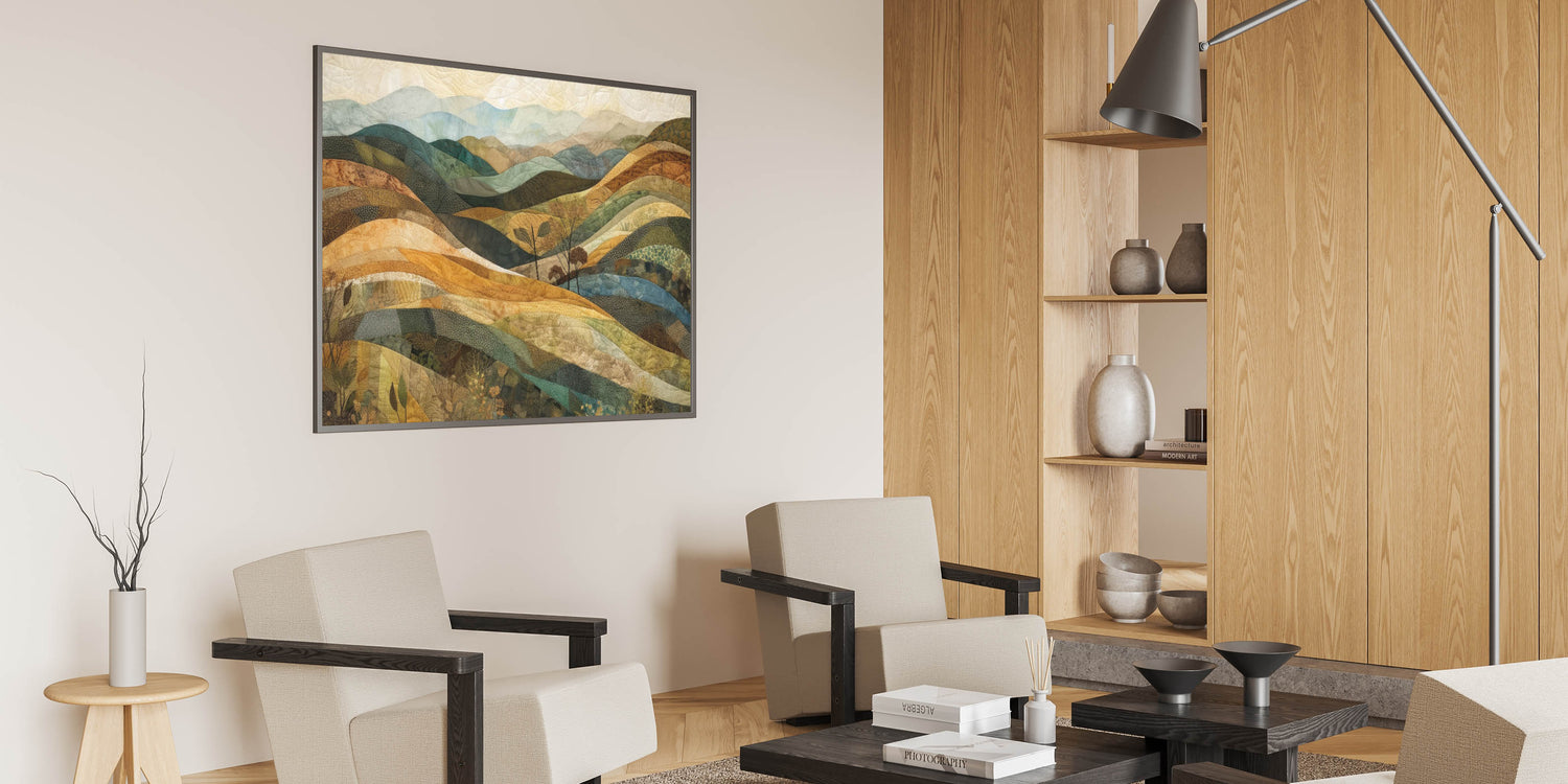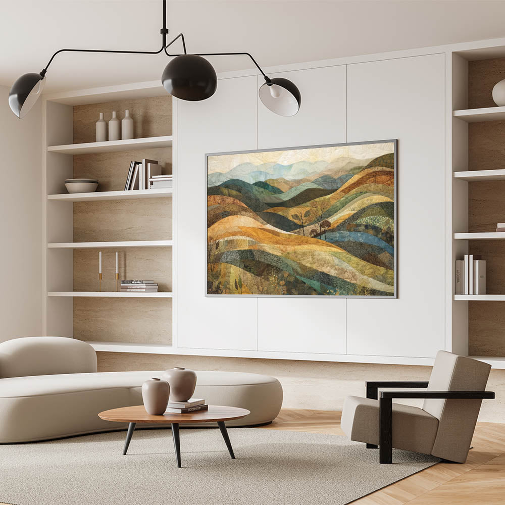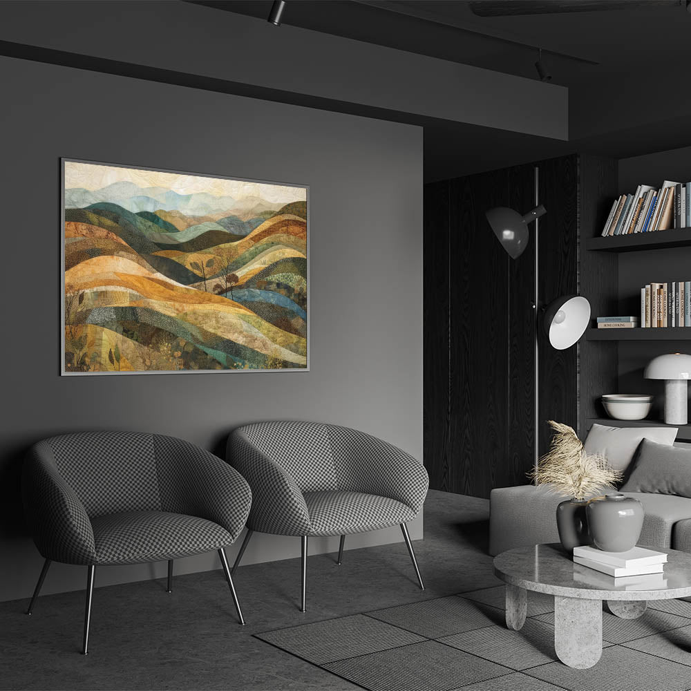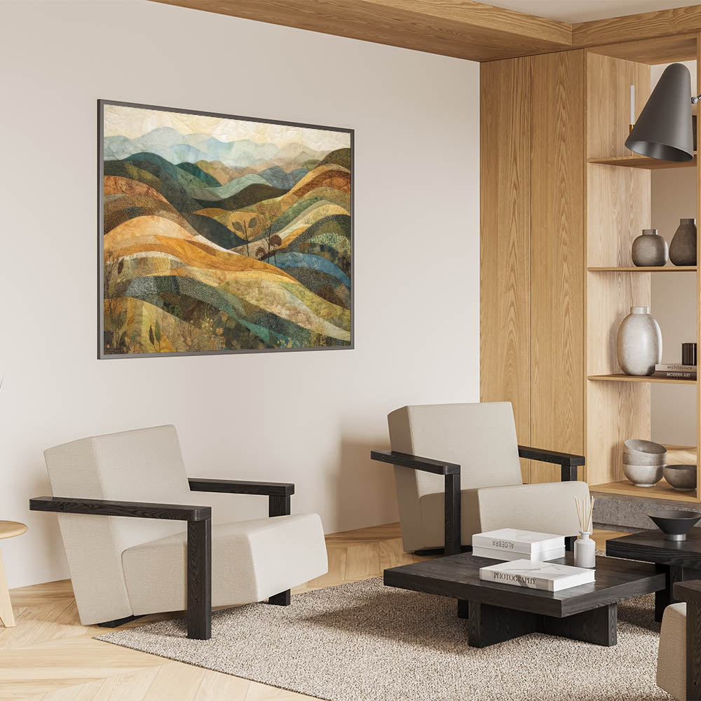 Immerse yourself in the beauty of the autumn countryside with this stunning rolling hills landscape wall art. Featuring a harmonious blend of olive green, mustard yellow, and deep brown, this piece captures the serene essence of fall. The detailed textures and layered patterns create a sense of movement, showcasing the gentle curves of the landscape as it transitions into the harvest season.