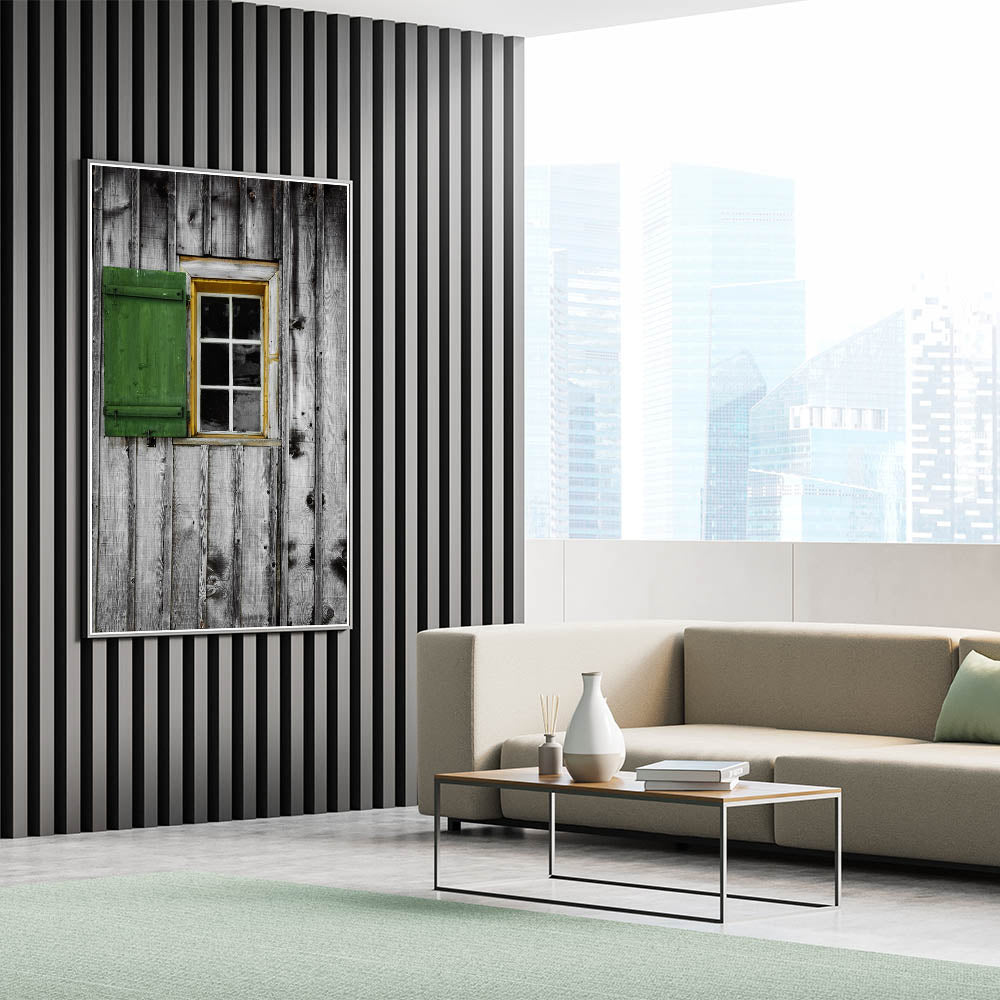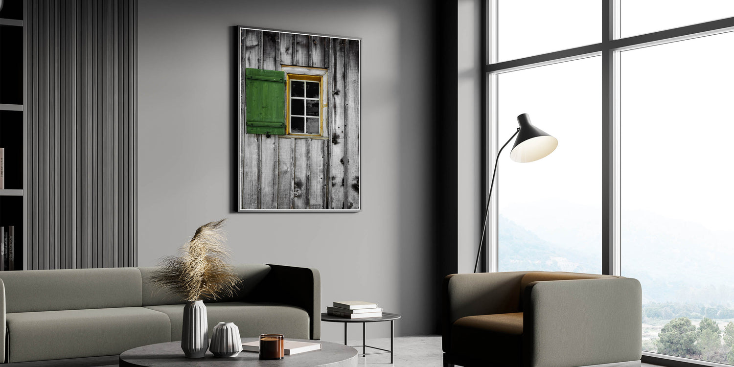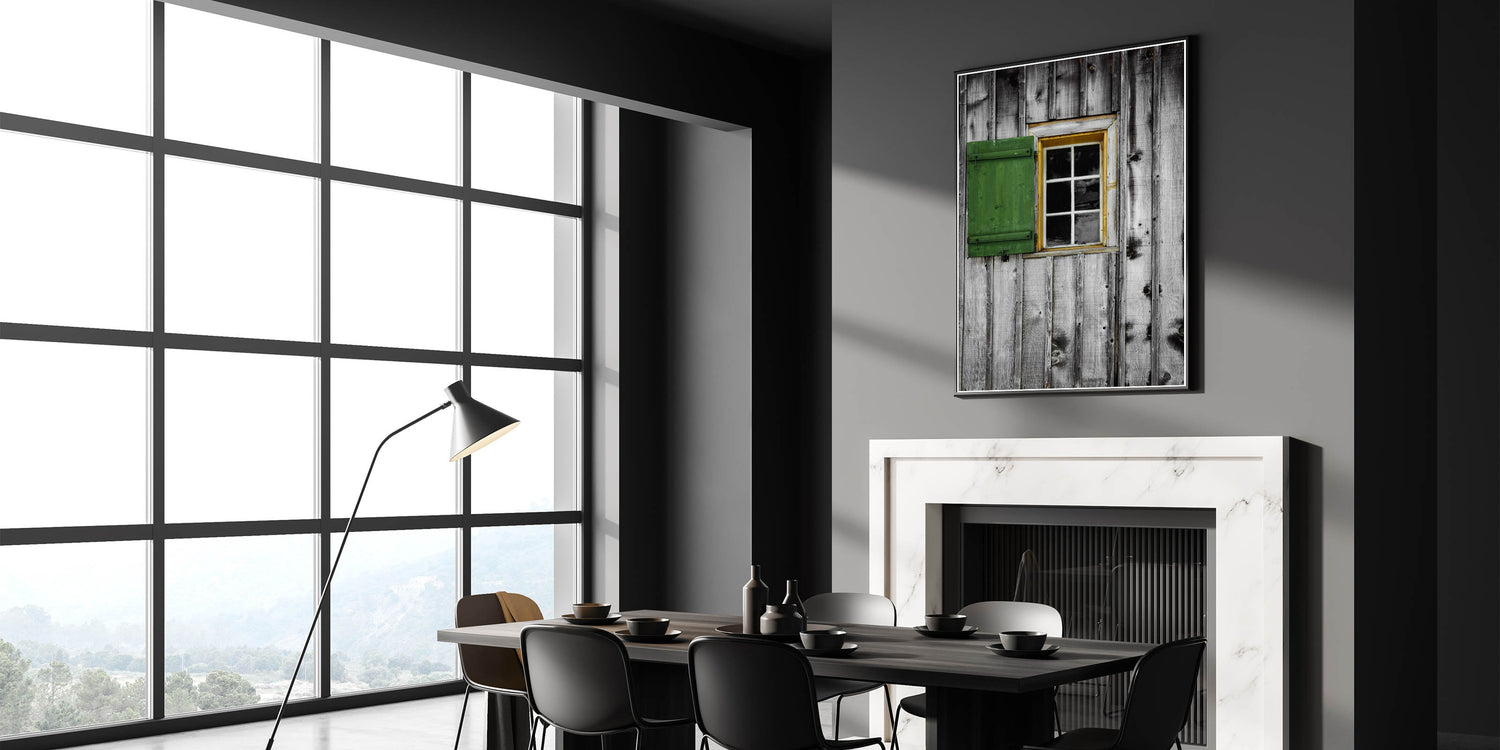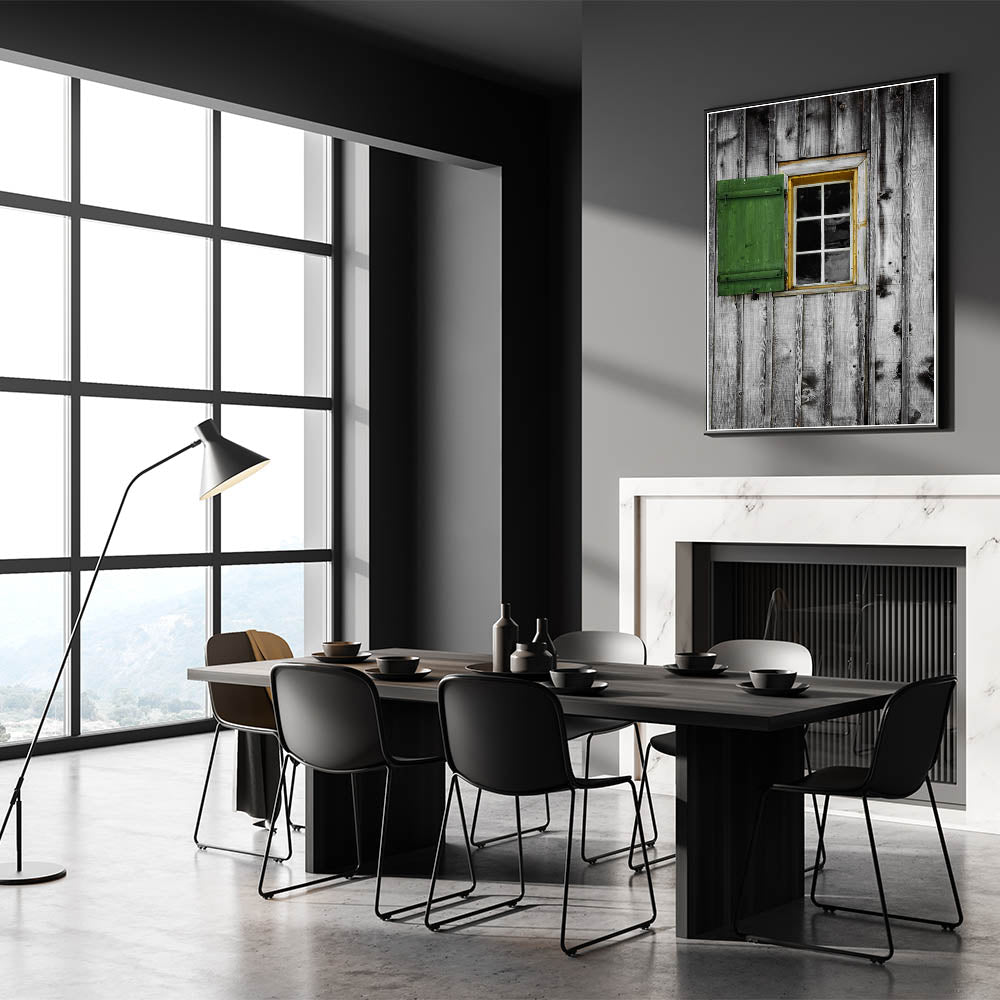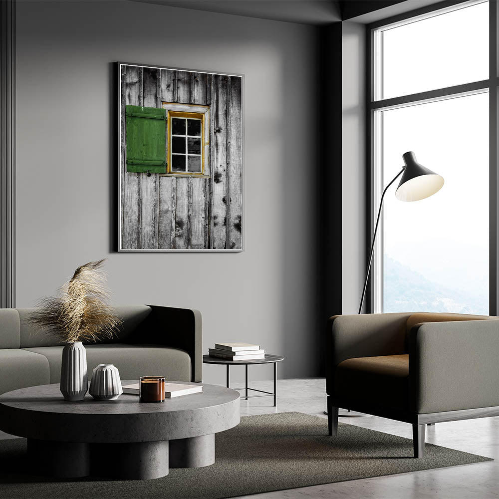 Rustic Cabin Window" art piece beautifully captures the essence of a weathered wooden cabin adorned with a charming green shutter and a yellow-framed window. This artwork highlights the textural contrasts and rich, muted colors that evoke a sense of nostalgia and timeless tranquility.
