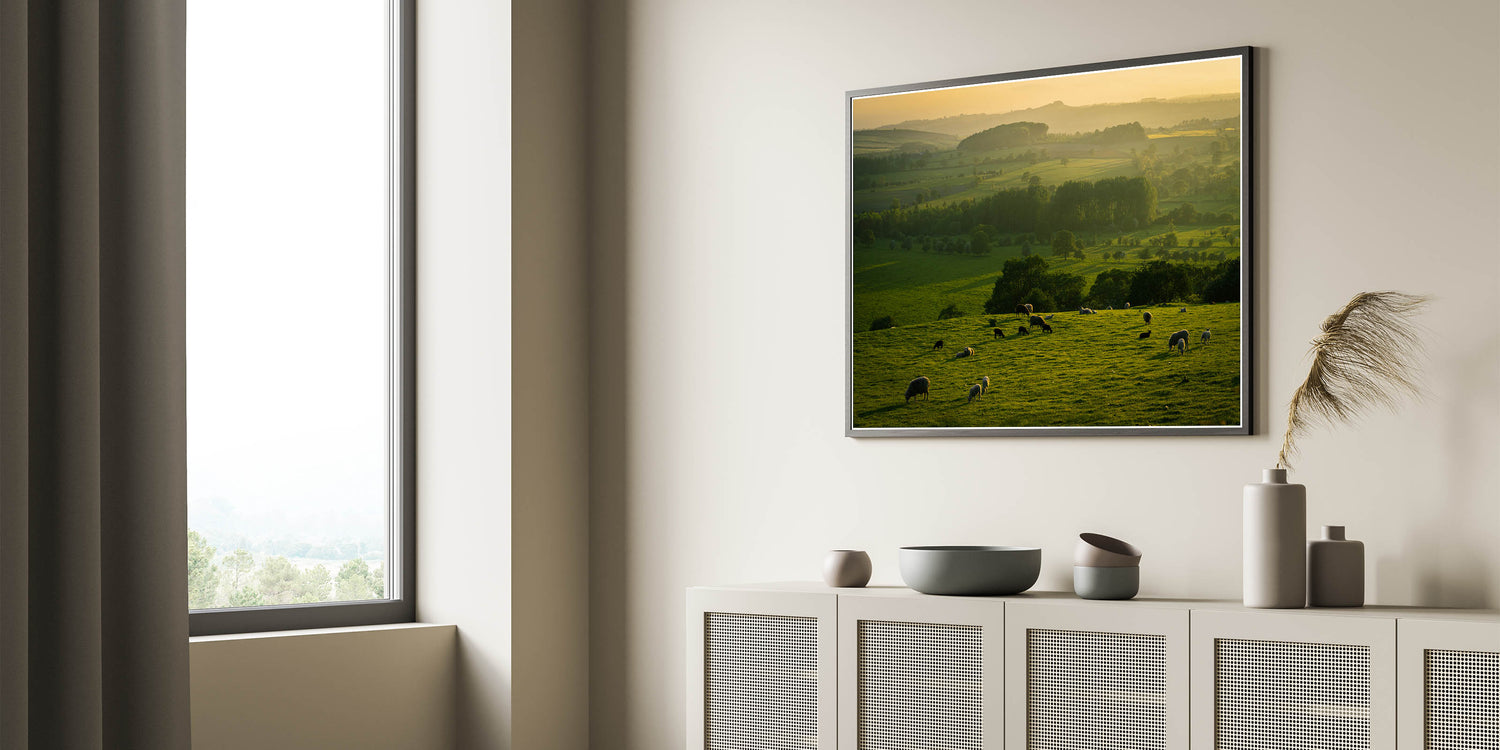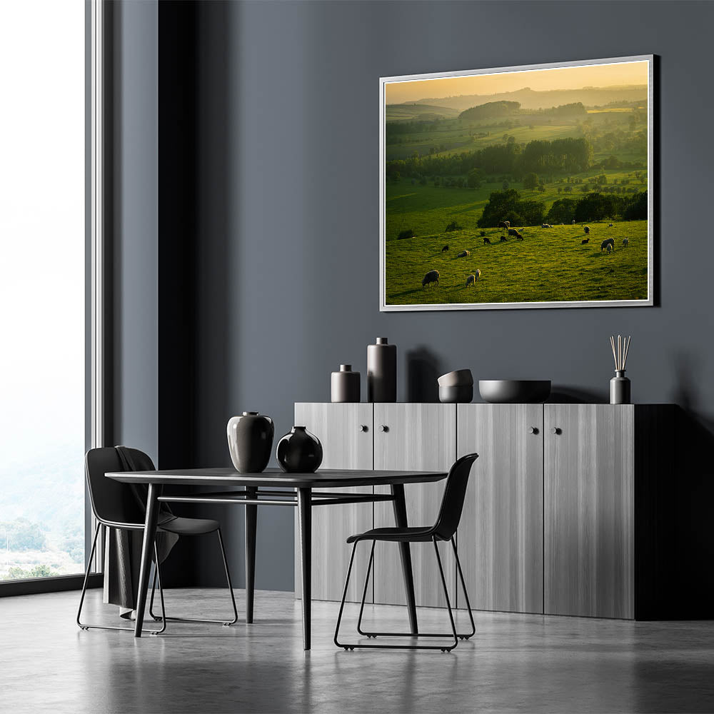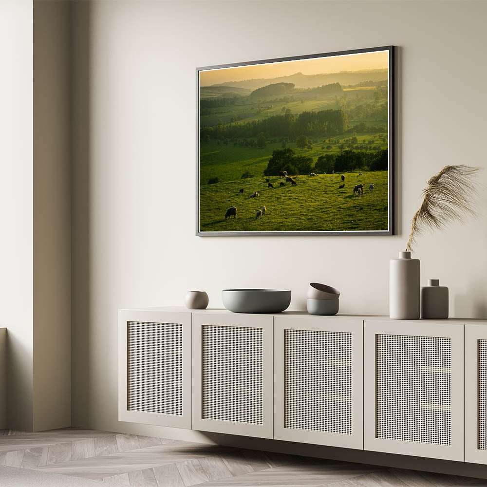 Capture the essence of a peaceful countryside at sunset with this beautiful rustic wall art. The soft, golden hues of the setting sun illuminate the rolling hills, creating a tranquil scene filled with grazing sheep and lush greenery. This stunning artwork is perfect for those looking to add a touch of nature to their home, while embracing a farmhouse or rustic decor theme.