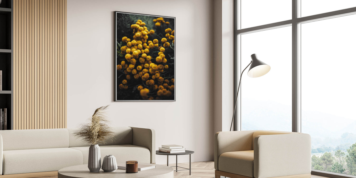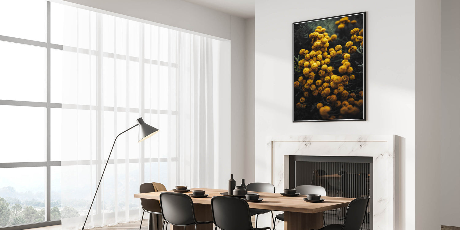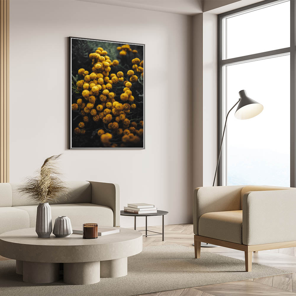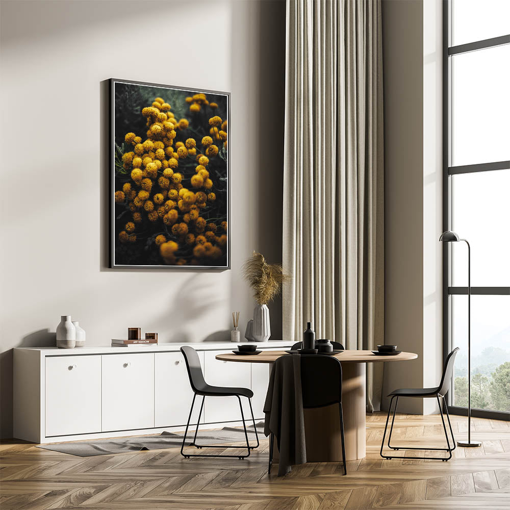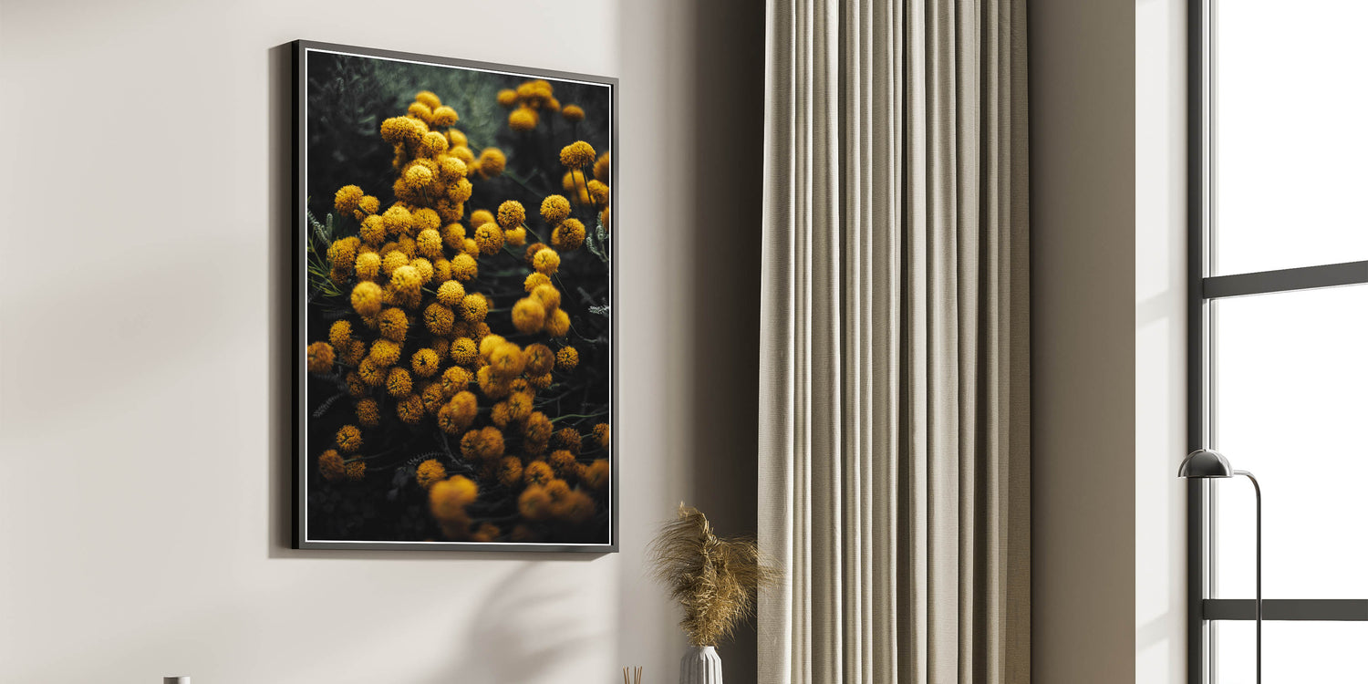 Bring the warmth and charm of autumn into your home with this vibrant rustic yellow flower wall art. The golden yellow blooms pop against the moody dark background, creating a stunning contrast that captures the essence of fall. This piece is perfect for adding a burst of color and natural elegance to any room, whether you are looking to enhance your farmhouse-style decor or add a touch of nature to your living space.