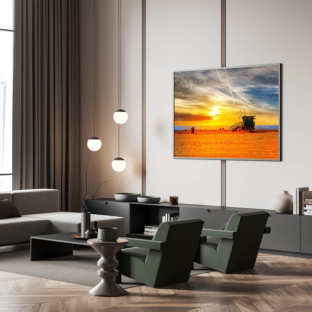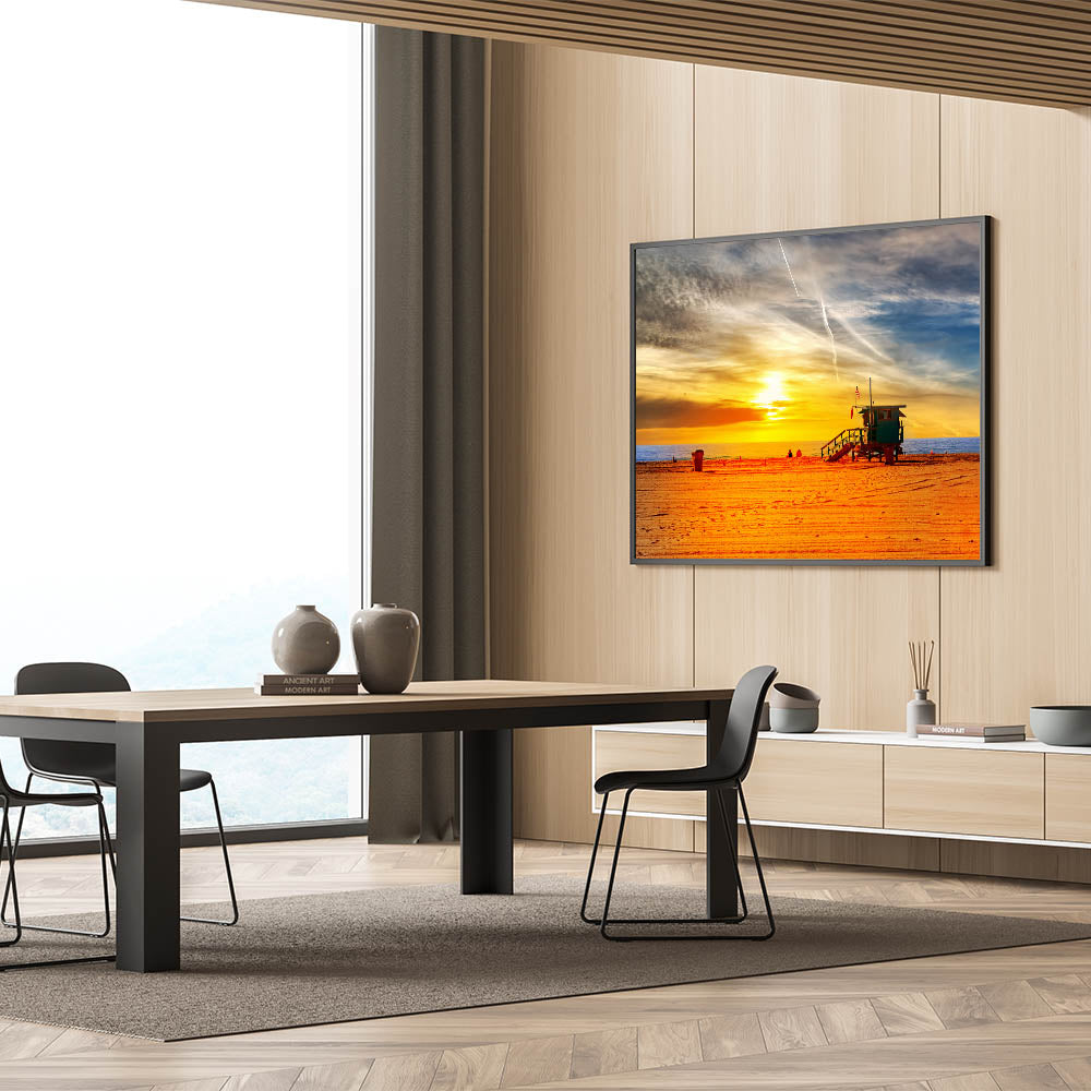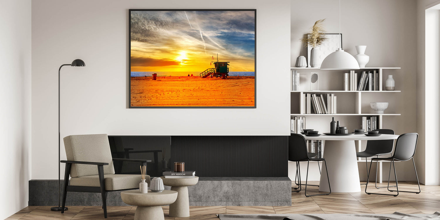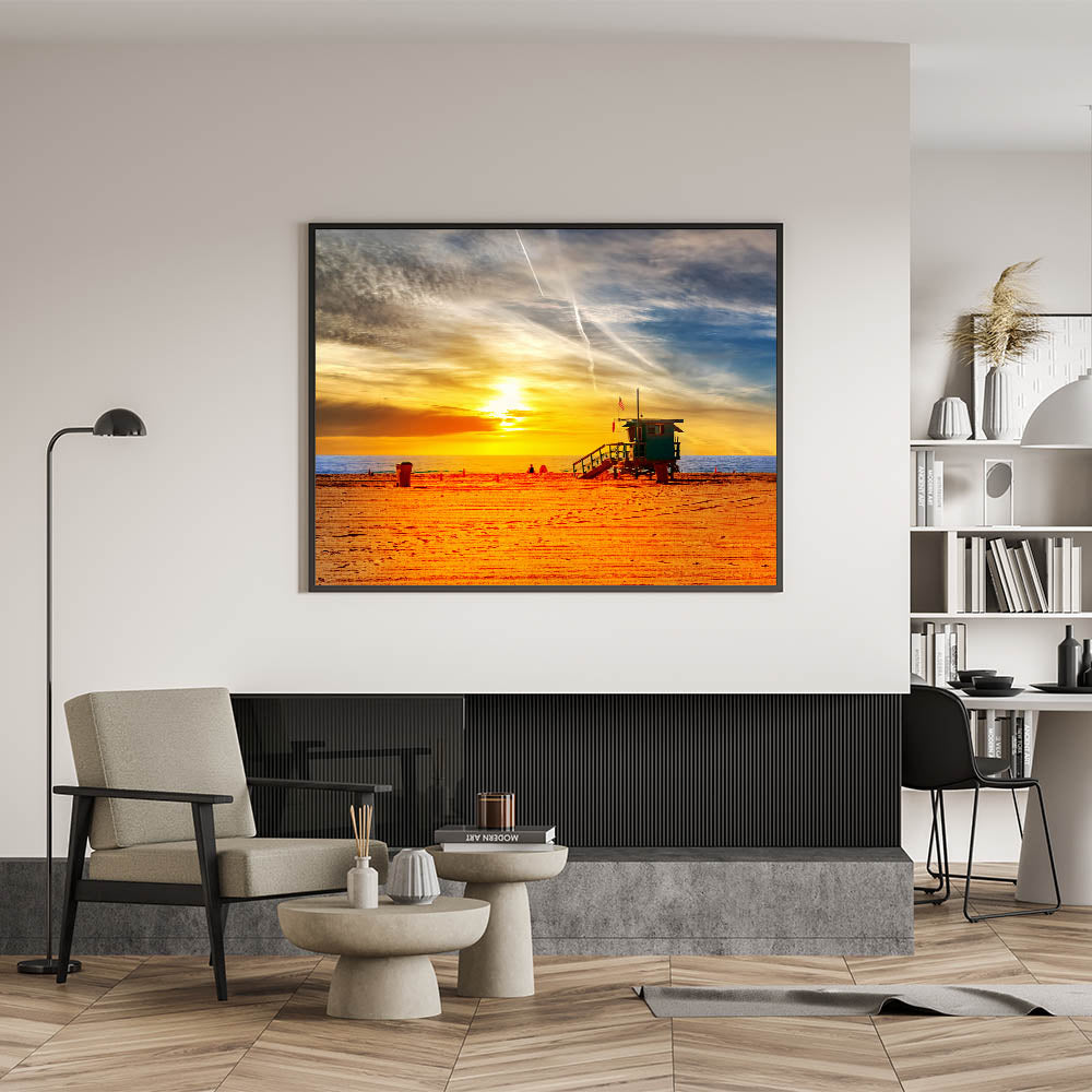 Capture the radiant beauty of Santa Monica with this vibrant sunset beach scene featuring an iconic lifeguard tower. The intense colors of the sky and the glowing orange sand create a mesmerizing display of nature’s brilliance, making this artwork a stunning addition to any room. The lifeguard tower adds a touch of California’s coastal charm, standing tall against the glowing backdrop of the Pacific Ocean.