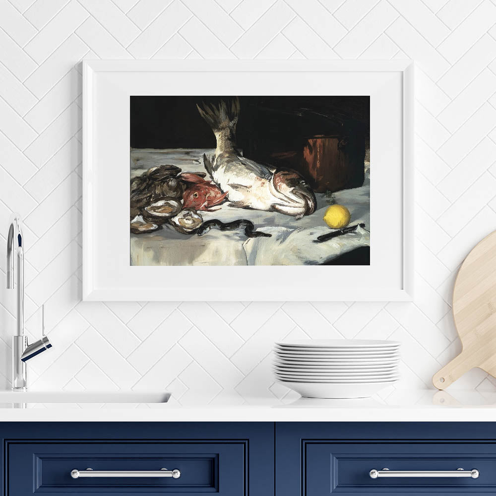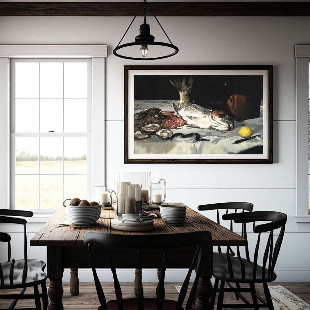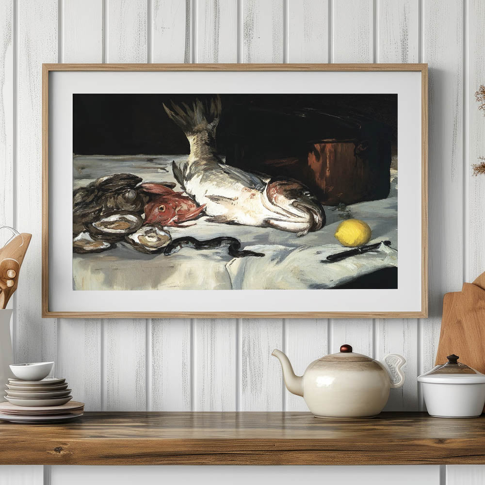 Elevate your kitchen or dining space with this elegant Seafood Still Life Dishes Wall Art. This stunning Culinary Canvas Art features a classic depiction of fresh fish, oysters, and a bright lemon on a table, capturing timeless sophistication and artistry. Perfect for seafood lovers, this Kitchen Wall Decor creates a captivating focal point for any room.