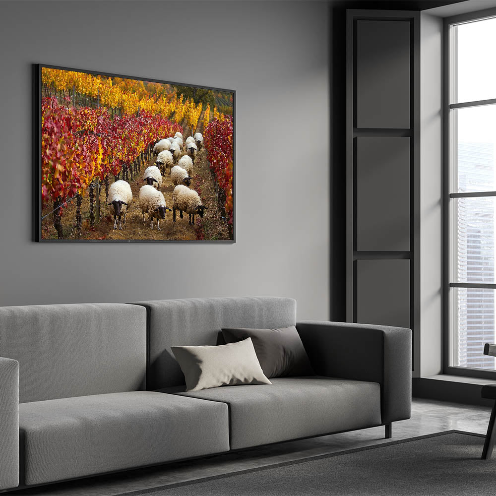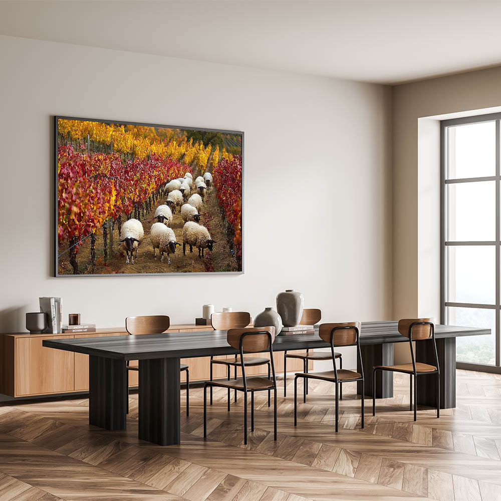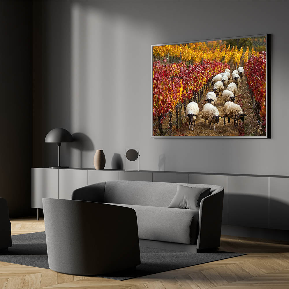 Celebrate the charm of rural life with this vibrant countryside wall art. Featuring a flock of sheep wandering through a vineyard adorned with autumn hues of red, orange, and gold, this artwork beautifully captures the essence of pastoral tranquility and seasonal beauty. Perfect for rustic farmhouse decor or nature-inspired interiors, it brings warmth and character to any space.
