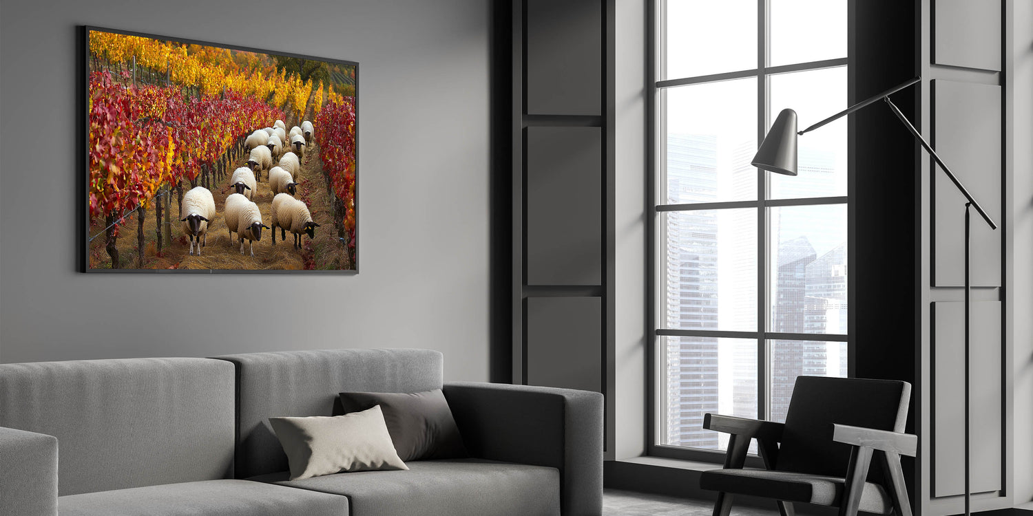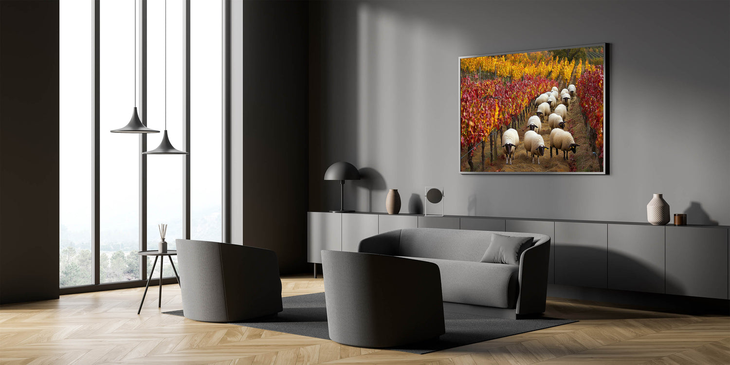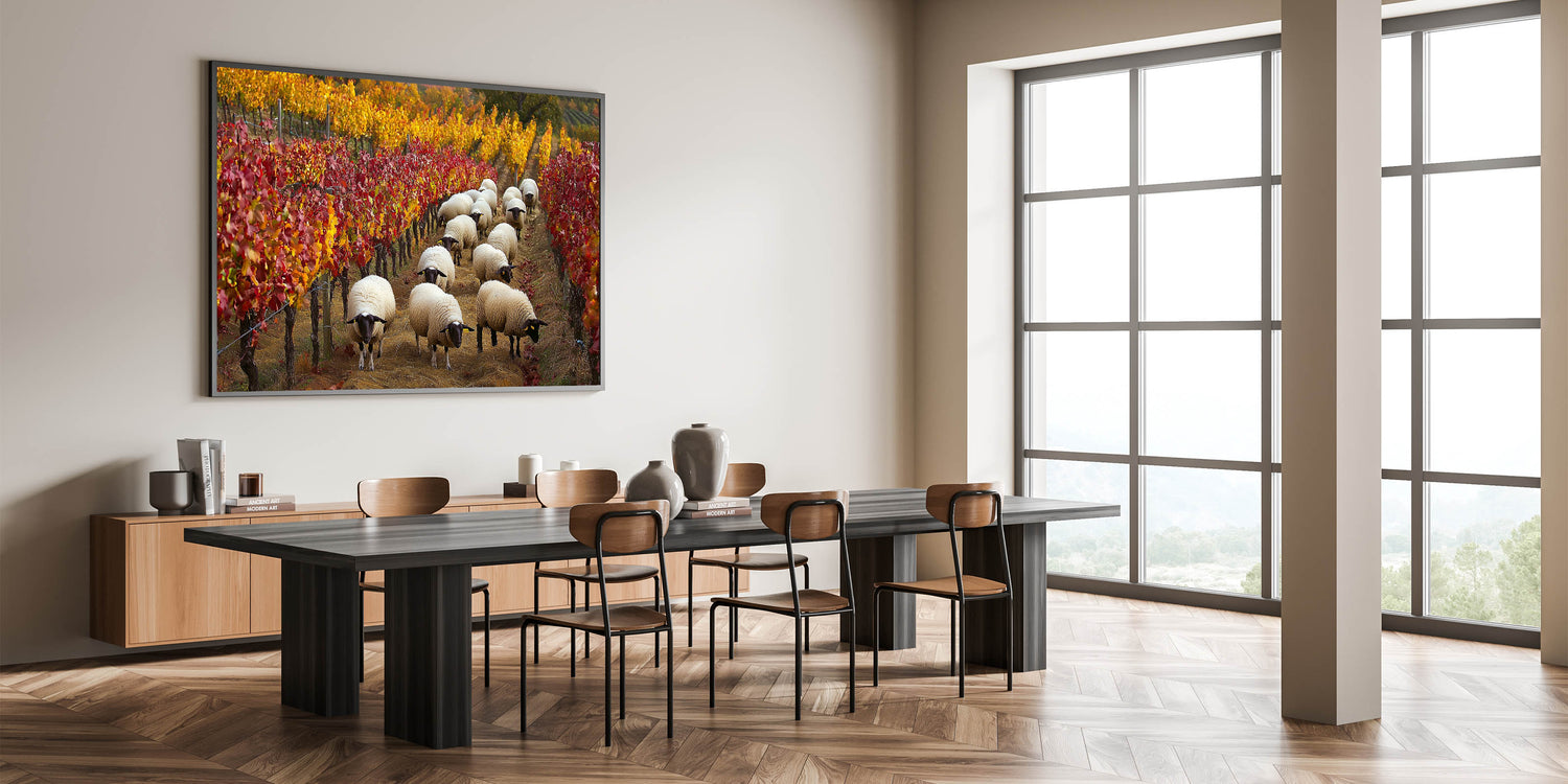 Celebrate the charm of rural life with this vibrant countryside wall art. Featuring a flock of sheep wandering through a vineyard adorned with autumn hues of red, orange, and gold, this artwork beautifully captures the essence of pastoral tranquility and seasonal beauty. Perfect for rustic farmhouse decor or nature-inspired interiors, it brings warmth and character to any space.