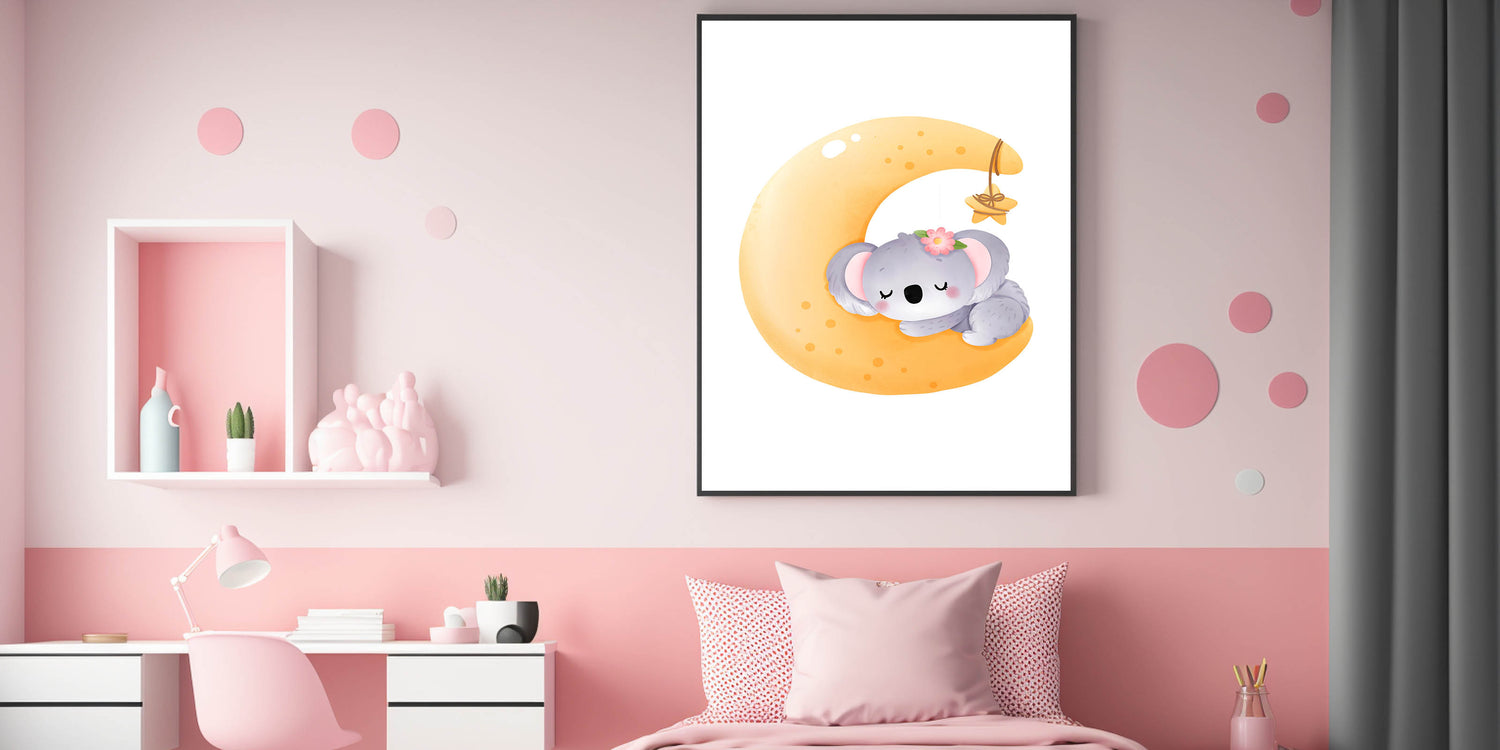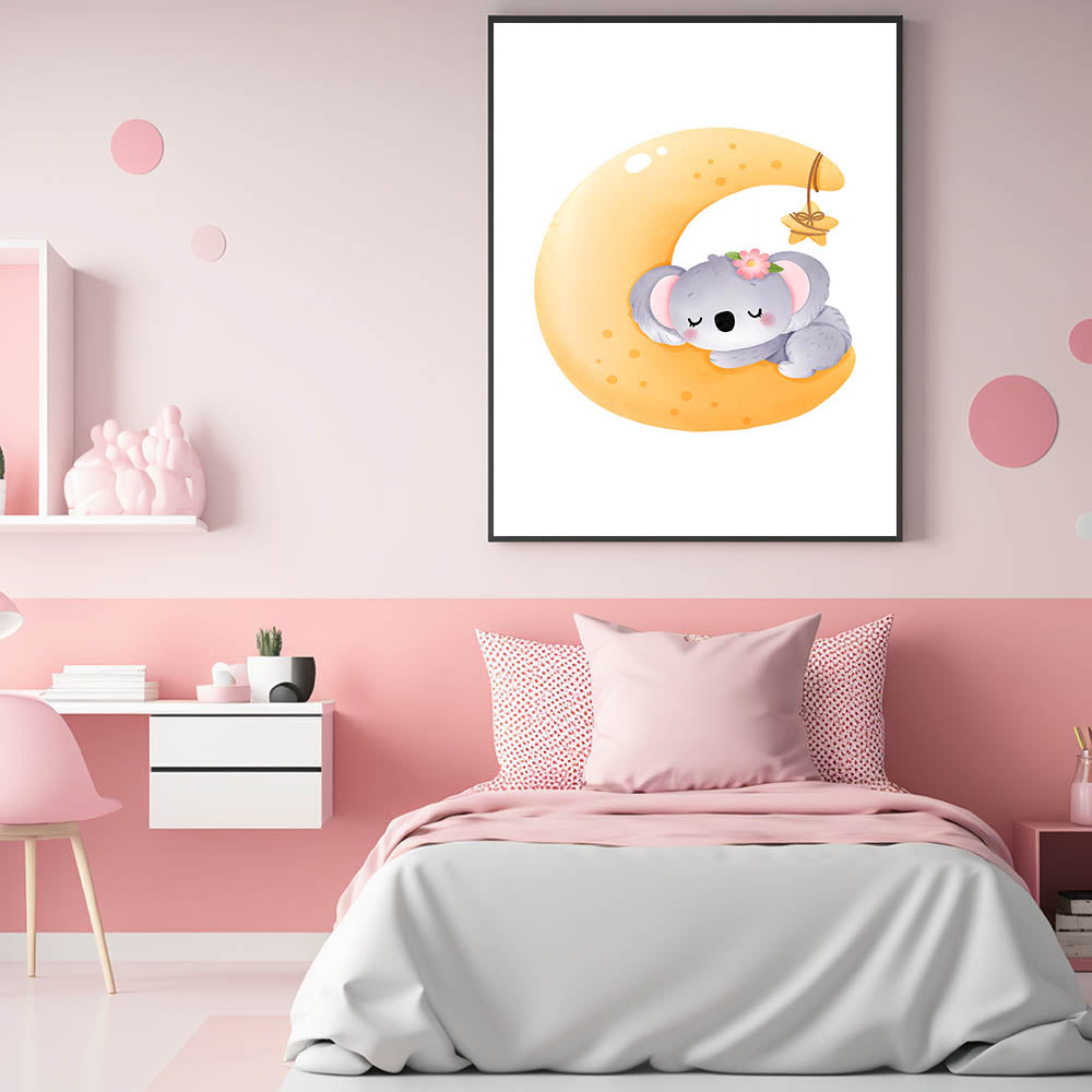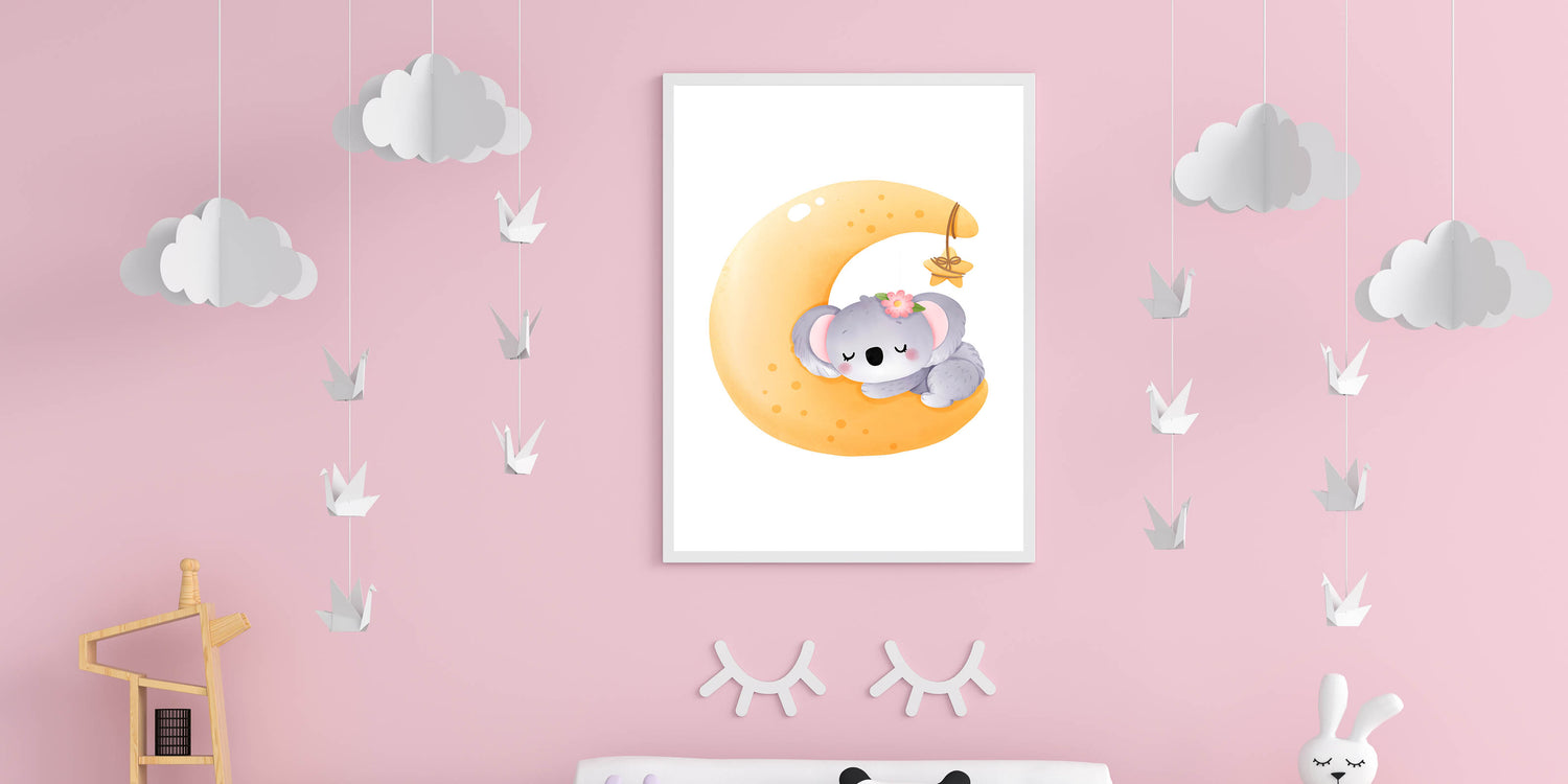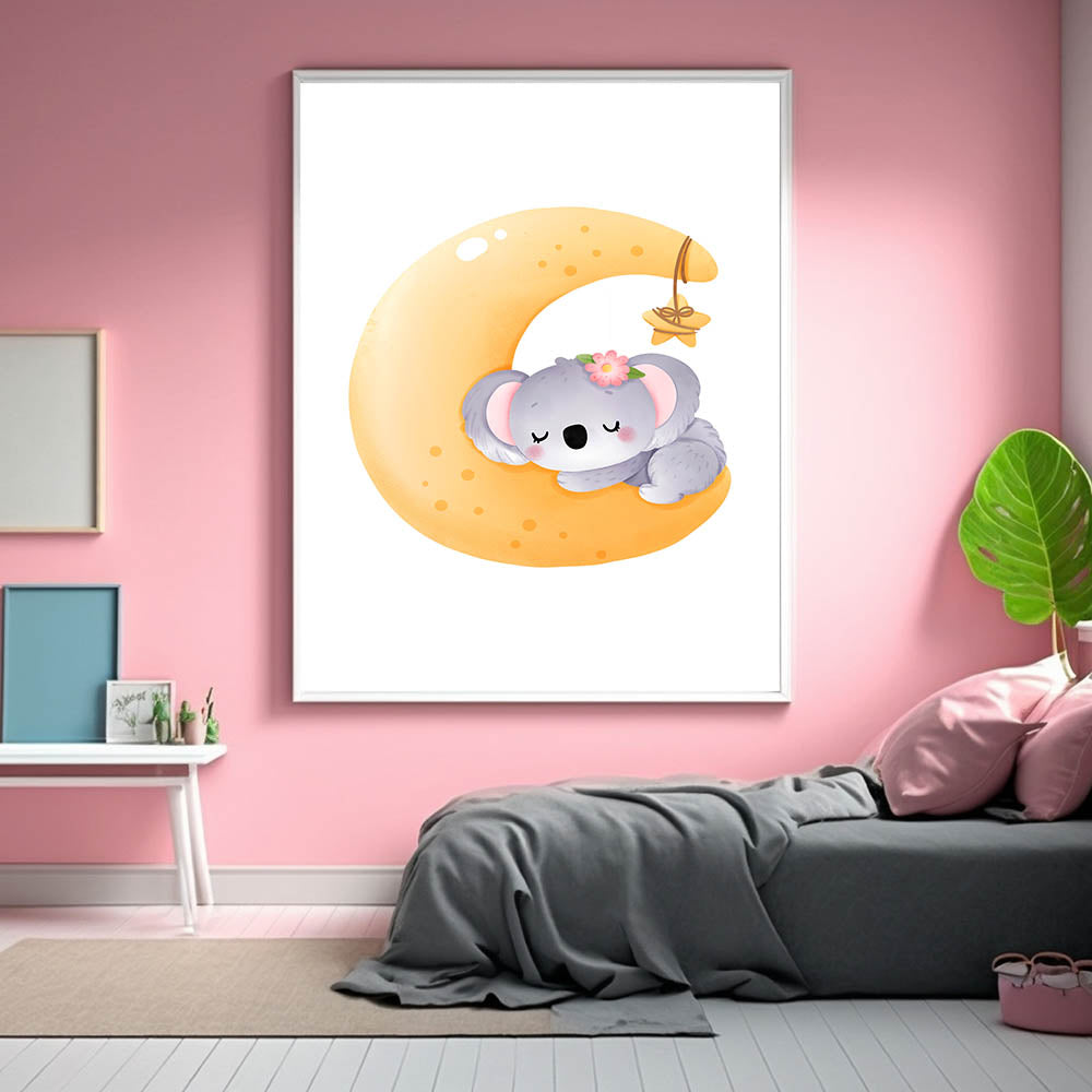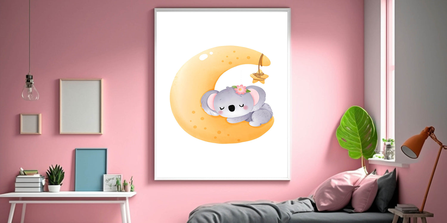 Create a peaceful and dreamy atmosphere with this Sleeping Koala on Moon Kids Room Print, perfect for nurseries and playrooms. Featuring an adorable koala curled up on a glowing crescent moon, this charming artwork brings warmth, comfort, and a magical bedtime feel to your child’s space.