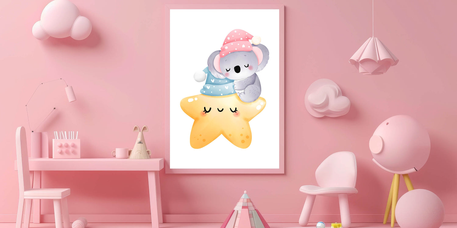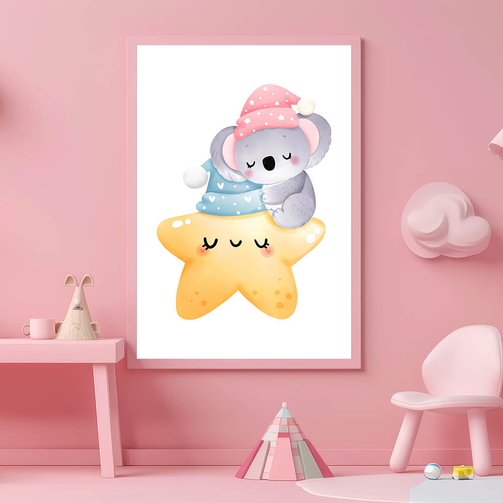 Create a cozy and dreamy atmosphere with this adorable Sleeping Koala & Star Kids Room Print, perfect for nurseries and playrooms. Featuring a sleepy koala cuddling a glowing star, this heartwarming artwork brings warmth, comfort, and a sense of serenity to your child’s space.