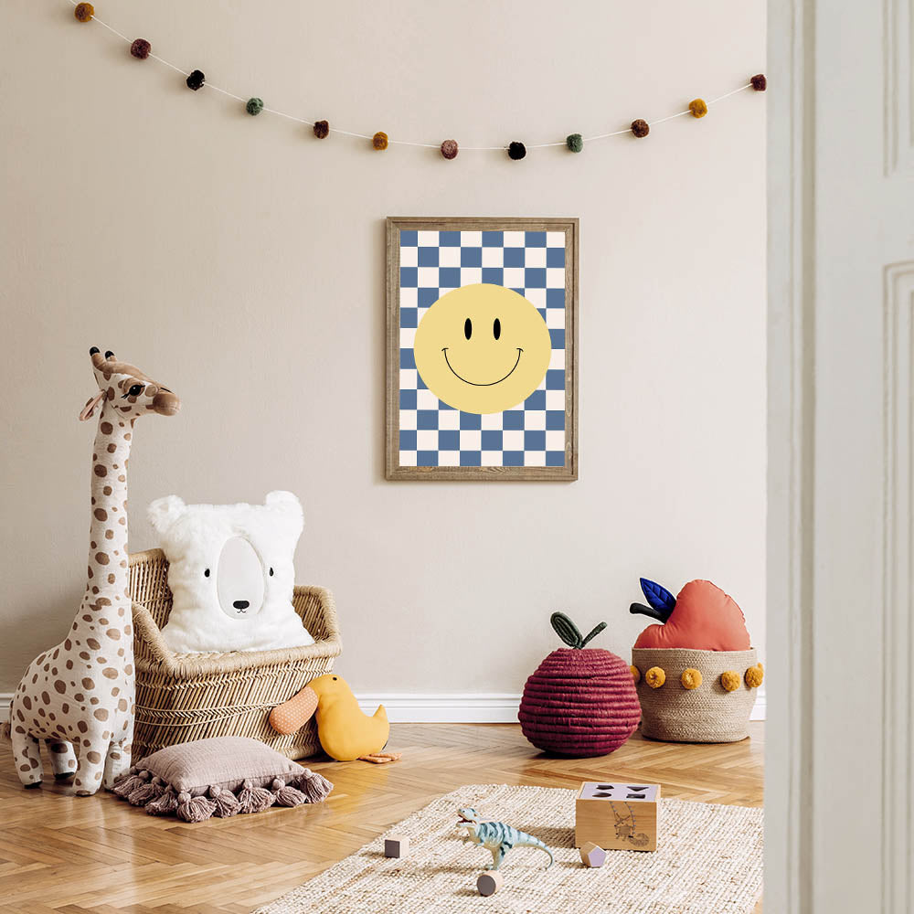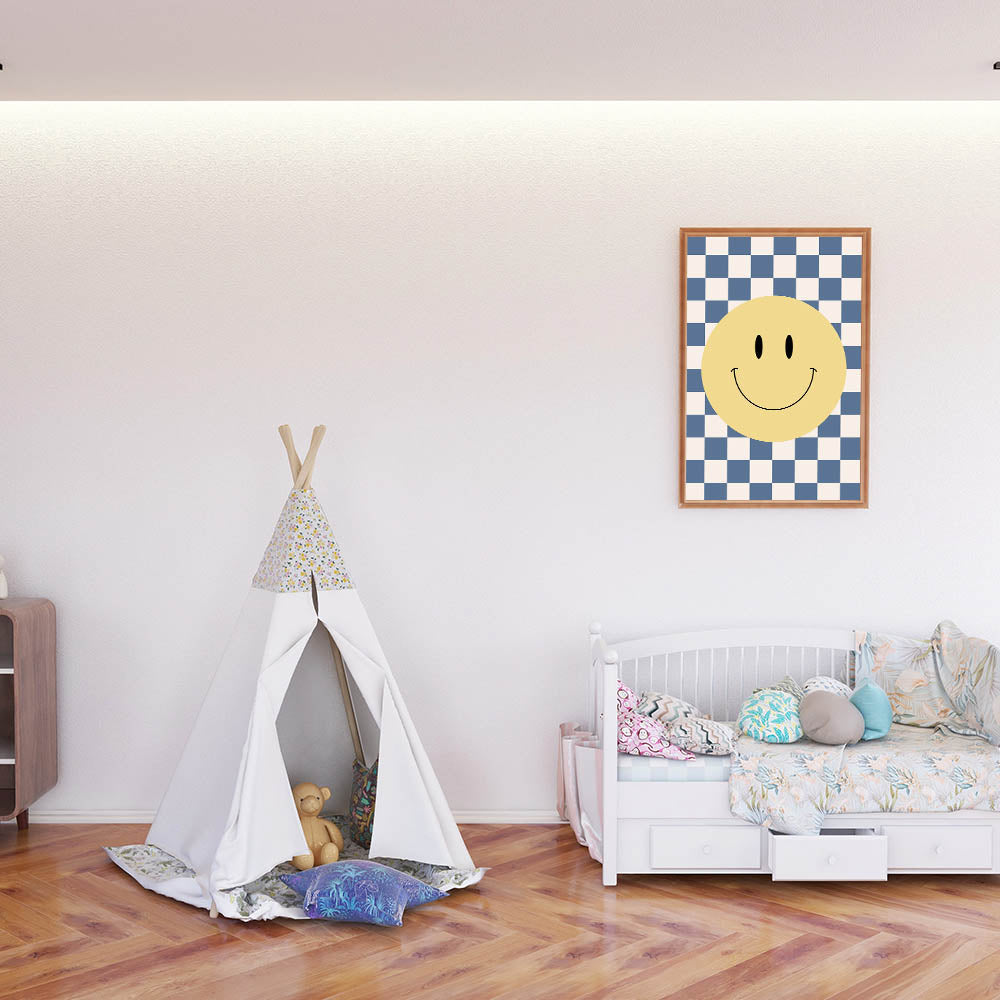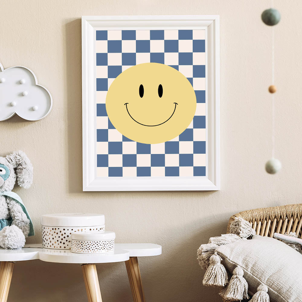 Bring joy and positivity to your child’s space with this fun and playful smiley face wall art. Featuring a vibrant yellow smiley face on a blue-and-white checkerboard background, this design adds a bold, energetic, and modern touch to any boys' bedroom, nursery, or playroom. The cheerful design is perfect for inspiring happiness and creativity in kids while complementing a stylish and contemporary decor theme.