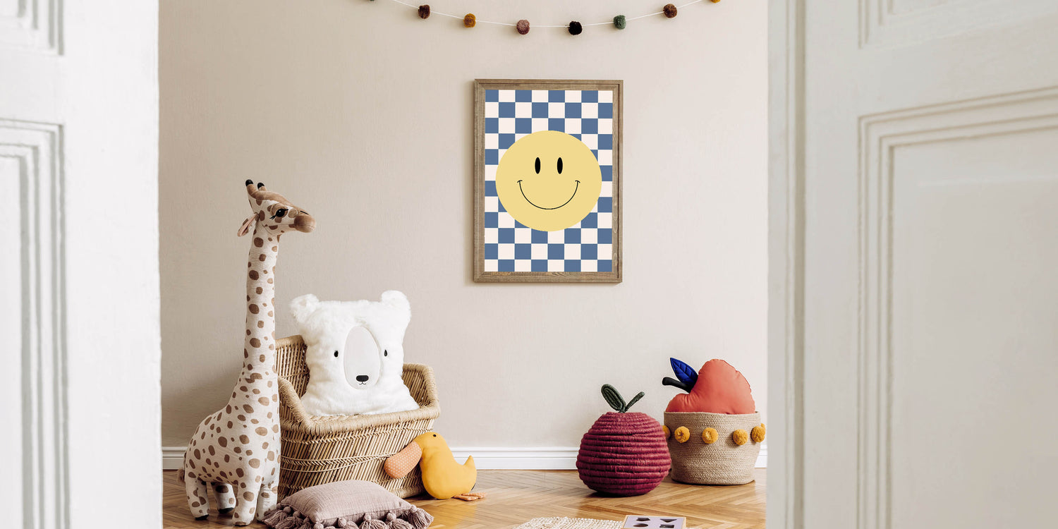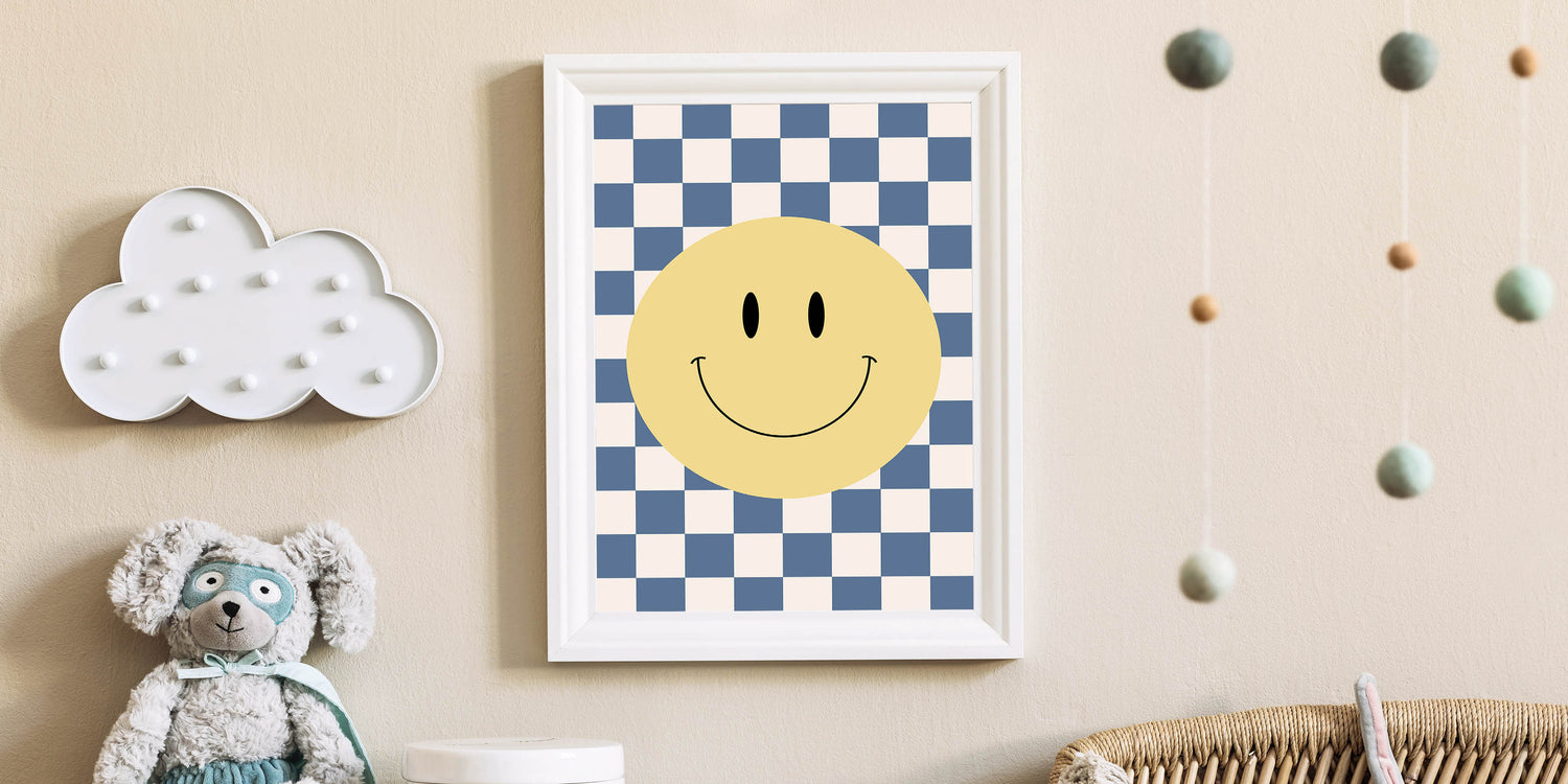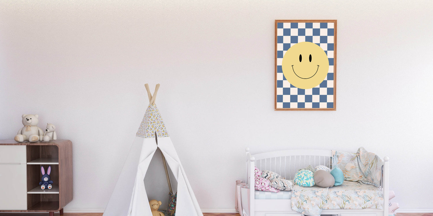 Bring joy and positivity to your child’s space with this fun and playful smiley face wall art. Featuring a vibrant yellow smiley face on a blue-and-white checkerboard background, this design adds a bold, energetic, and modern touch to any boys' bedroom, nursery, or playroom. The cheerful design is perfect for inspiring happiness and creativity in kids while complementing a stylish and contemporary decor theme.