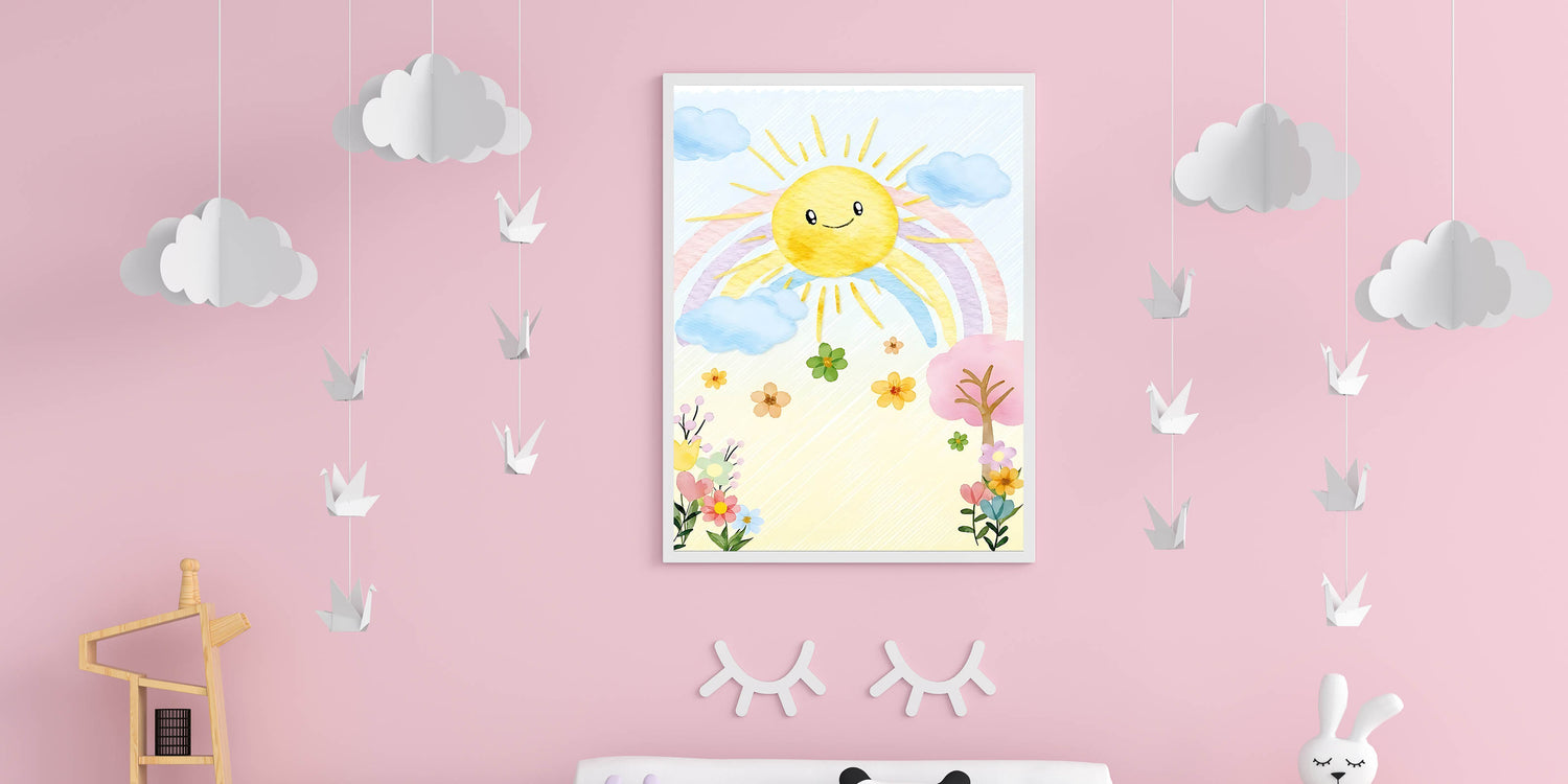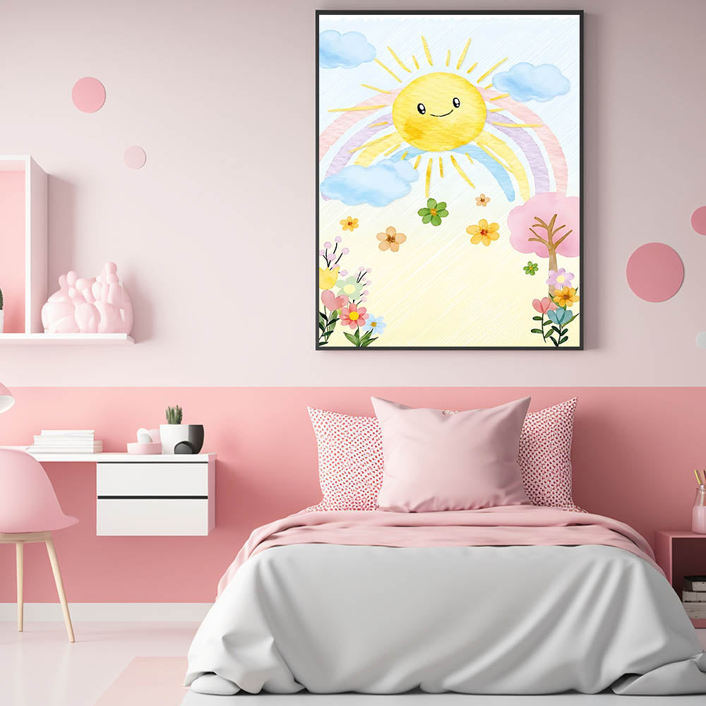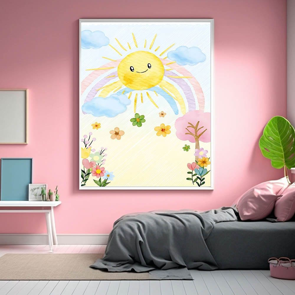 Brighten your child’s space with this cheerful smiling sun watercolor print, designed to bring warmth and happiness to any nursery, playroom, or kids' bedroom. Featuring a glowing yellow sun with a happy face, pastel rainbow, fluffy clouds, and vibrant blooming flowers, this children's wall décor piece creates a playful and uplifting atmosphere.