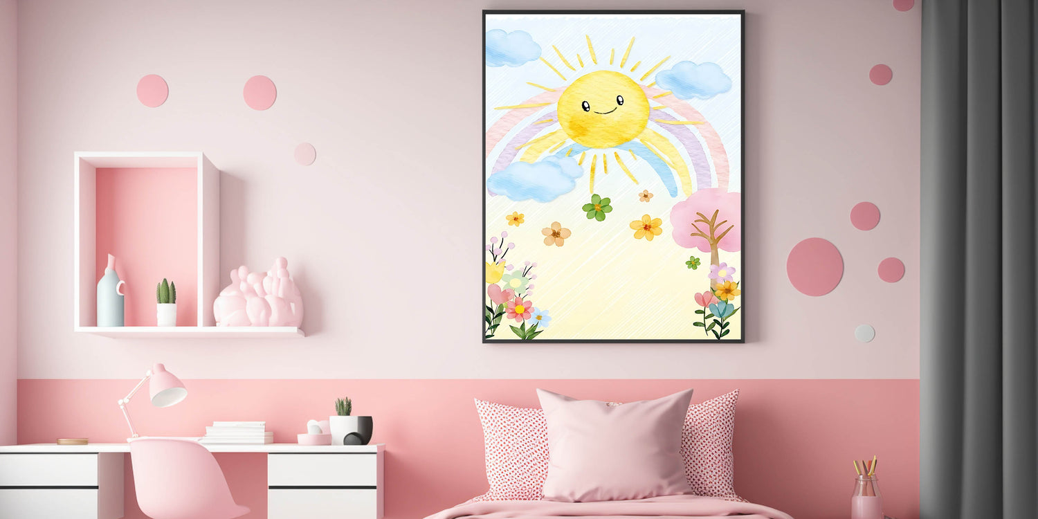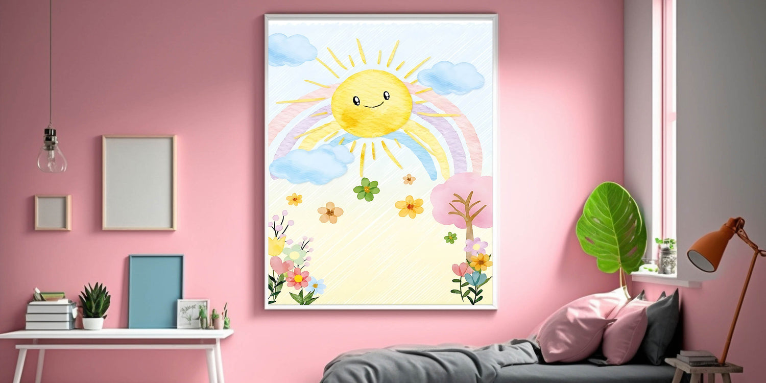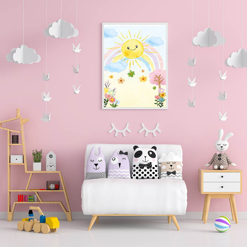 Brighten your child’s space with this cheerful smiling sun watercolor print, designed to bring warmth and happiness to any nursery, playroom, or kids' bedroom. Featuring a glowing yellow sun with a happy face, pastel rainbow, fluffy clouds, and vibrant blooming flowers, this children's wall décor piece creates a playful and uplifting atmosphere.