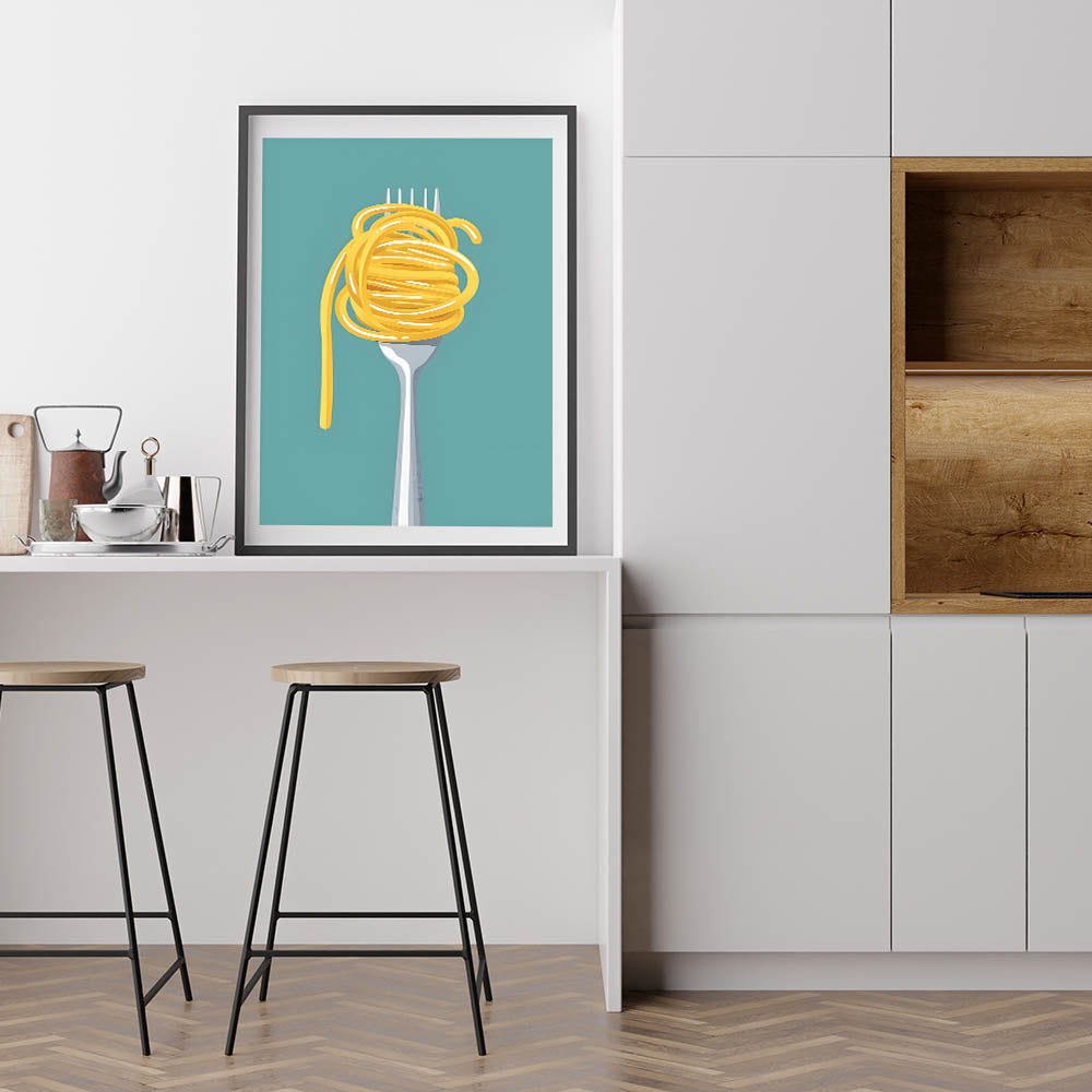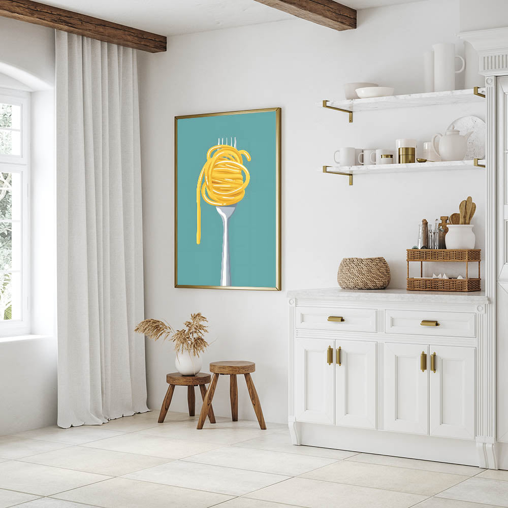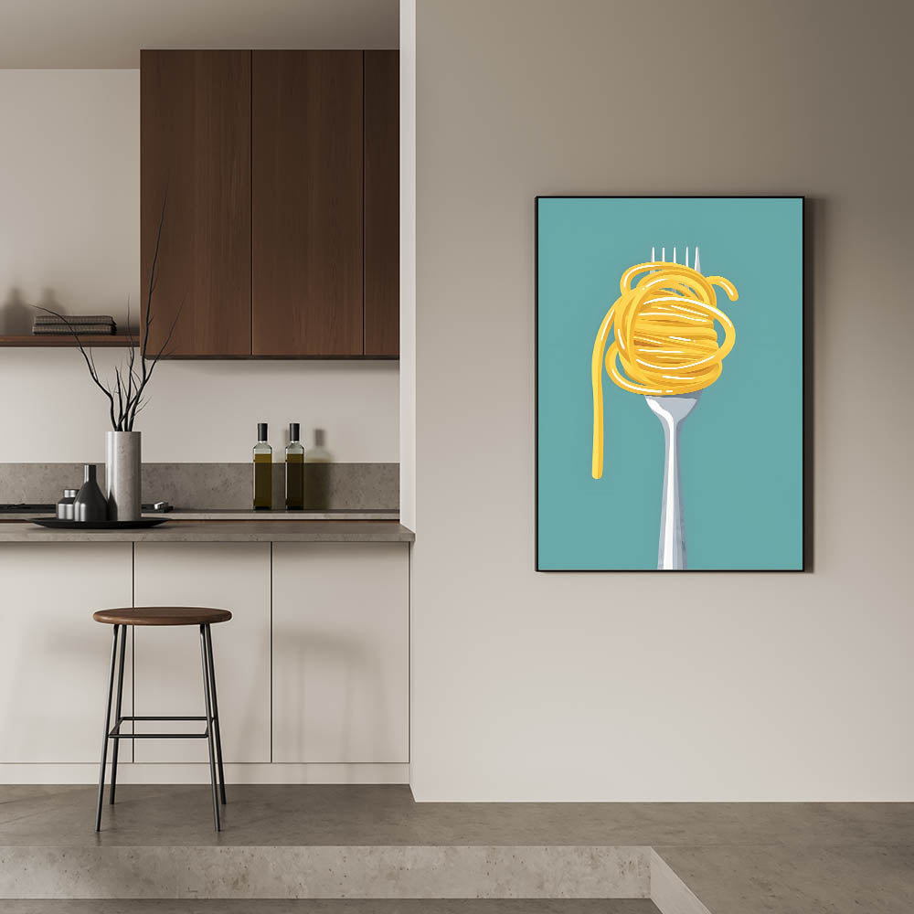 Add a modern and playful twist to your kitchen decor with this eye-catching Spaghetti Fork Wall Art. Featuring a vibrant illustration of golden spaghetti twirled around a sleek silver fork against a teal background, this Food-Themed Art Print brings energy and style to any space. Perfect for pasta lovers, chefs, and modern interiors, this piece is a must-have addition to your Kitchen Wall Decor collection.
