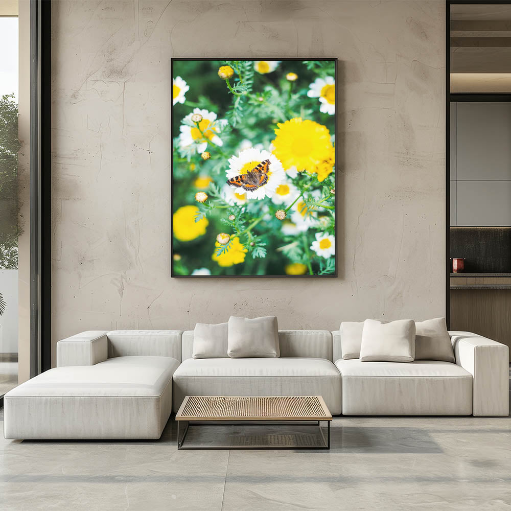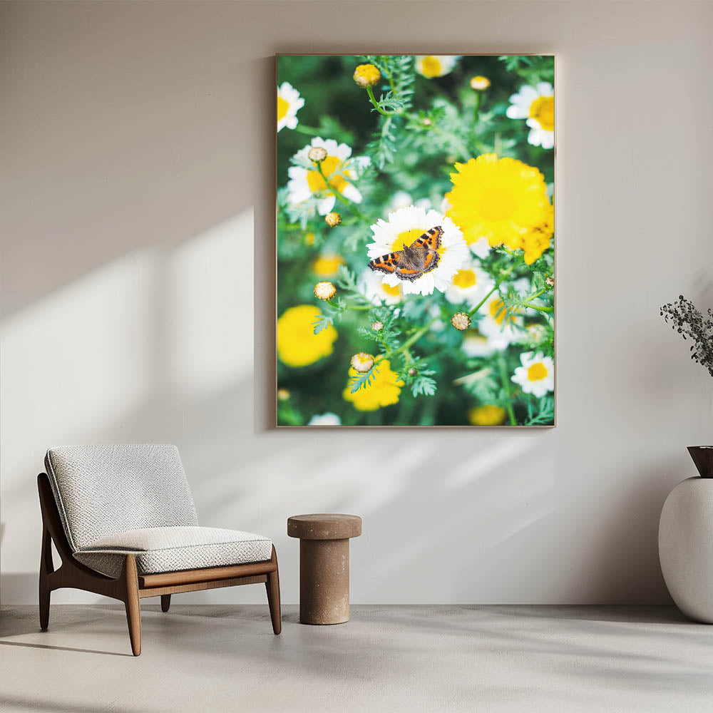 Embrace the beauty of nature with this stunning spring canvas art, featuring a vibrant butterfly delicately resting on blooming wild daisies. This botanical wall art captures the essence of spring, where bright yellow and white flowers contrast beautifully against the deep green foliage. The intricate details of the butterfly’s wings add a sense of movement and life, making this piece a perfect focal point for any floral and nature-inspired space.