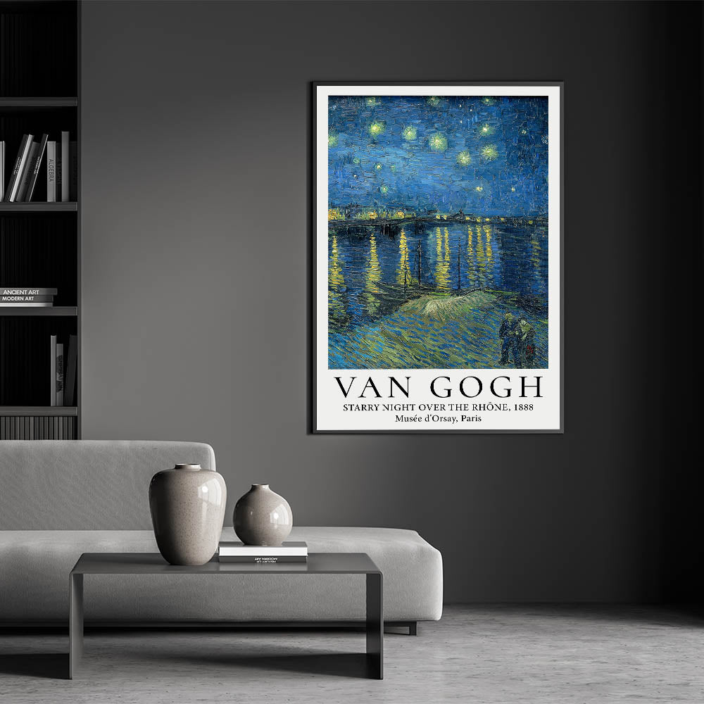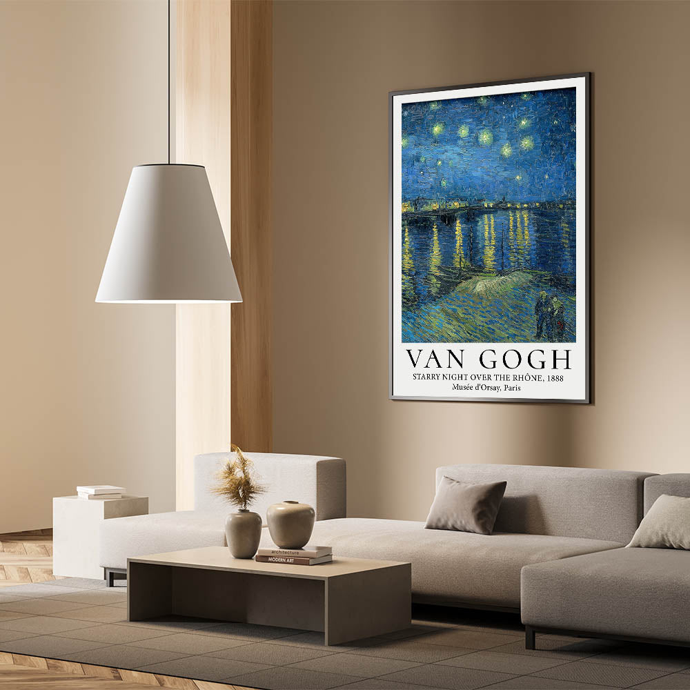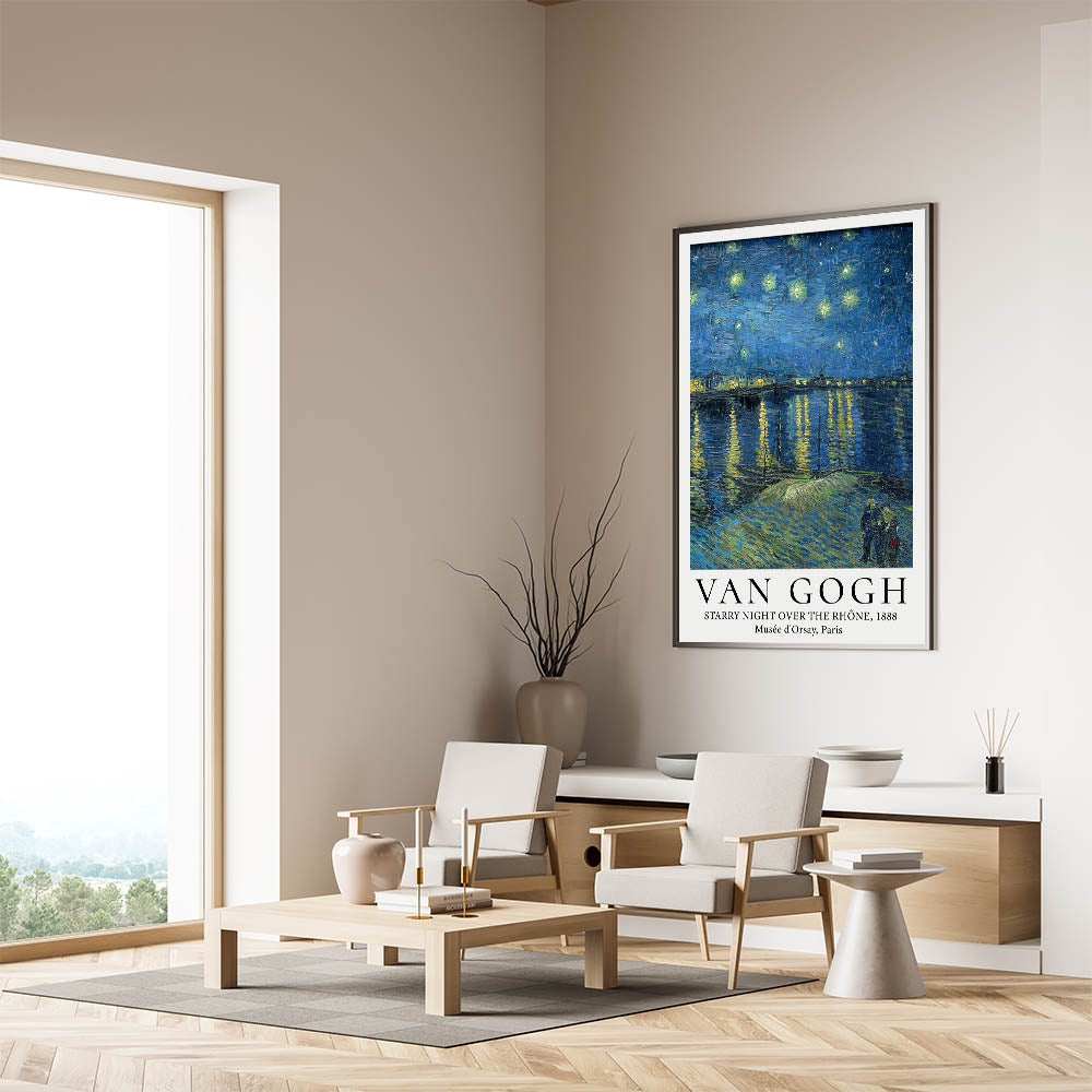 Immerse yourself in the tranquility of Starry Night wall art with Starry Night Over the Rhône. This captivating poster features one of Van Gogh's most iconic nighttime scenes, showcasing shimmering stars reflected in the Rhône River and a couple strolling along the banks. The blend of deep blues and golden yellows captures Van Gogh’s signature style and evokes a sense of serenity and wonder.