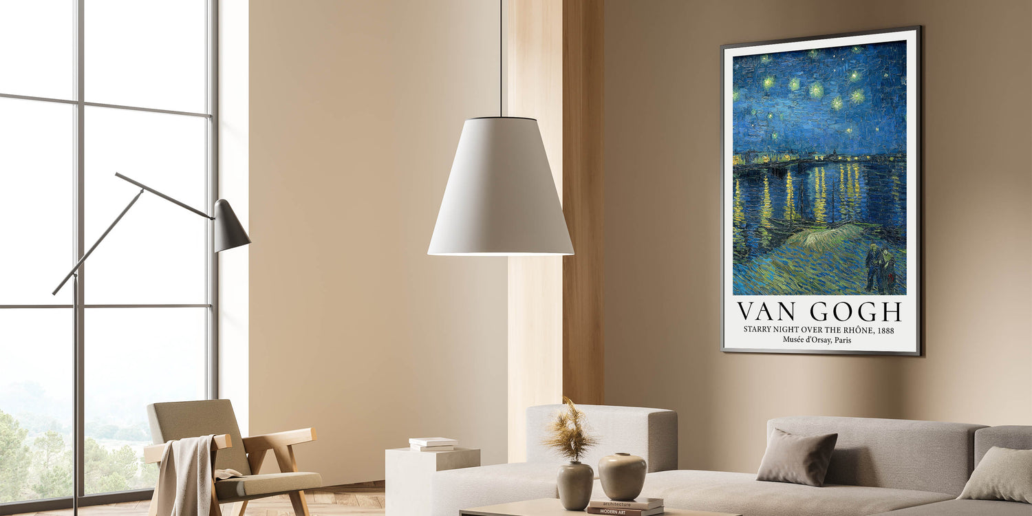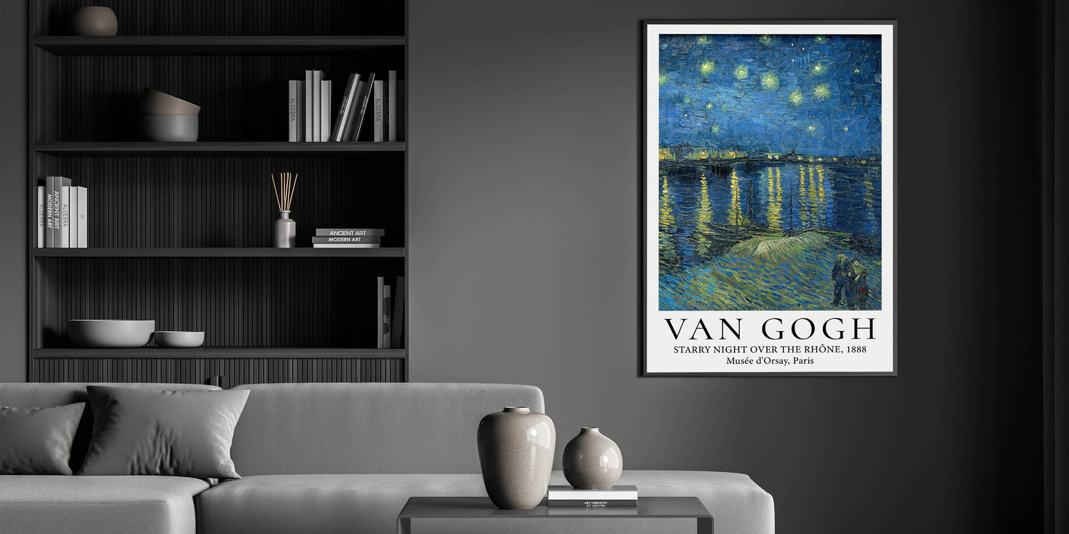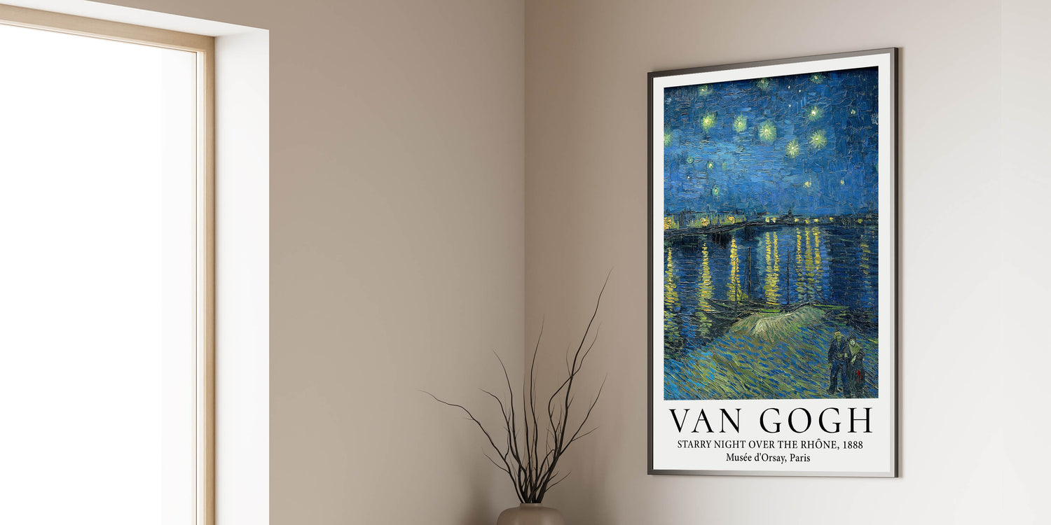 Immerse yourself in the tranquility of Starry Night wall art with Starry Night Over the Rhône. This captivating poster features one of Van Gogh's most iconic nighttime scenes, showcasing shimmering stars reflected in the Rhône River and a couple strolling along the banks. The blend of deep blues and golden yellows captures Van Gogh’s signature style and evokes a sense of serenity and wonder.
