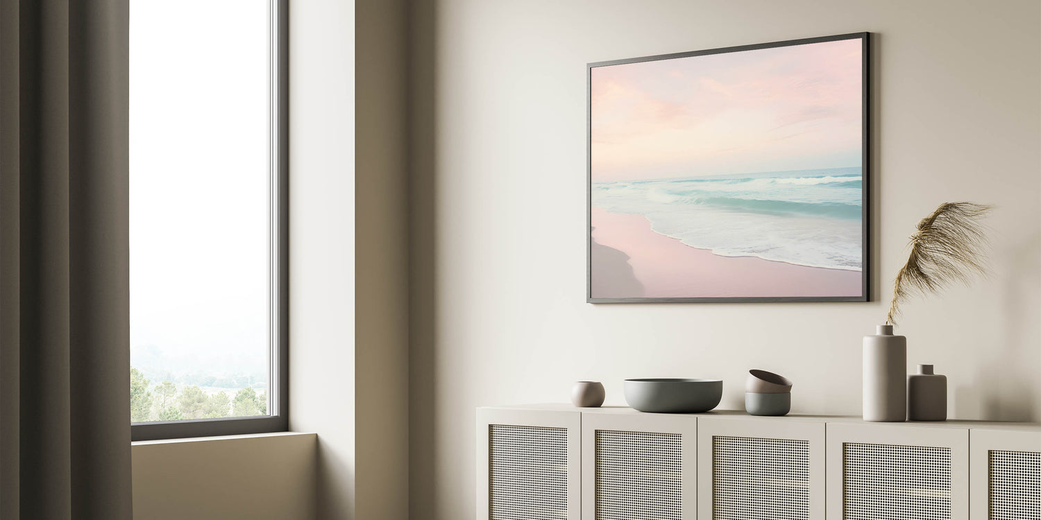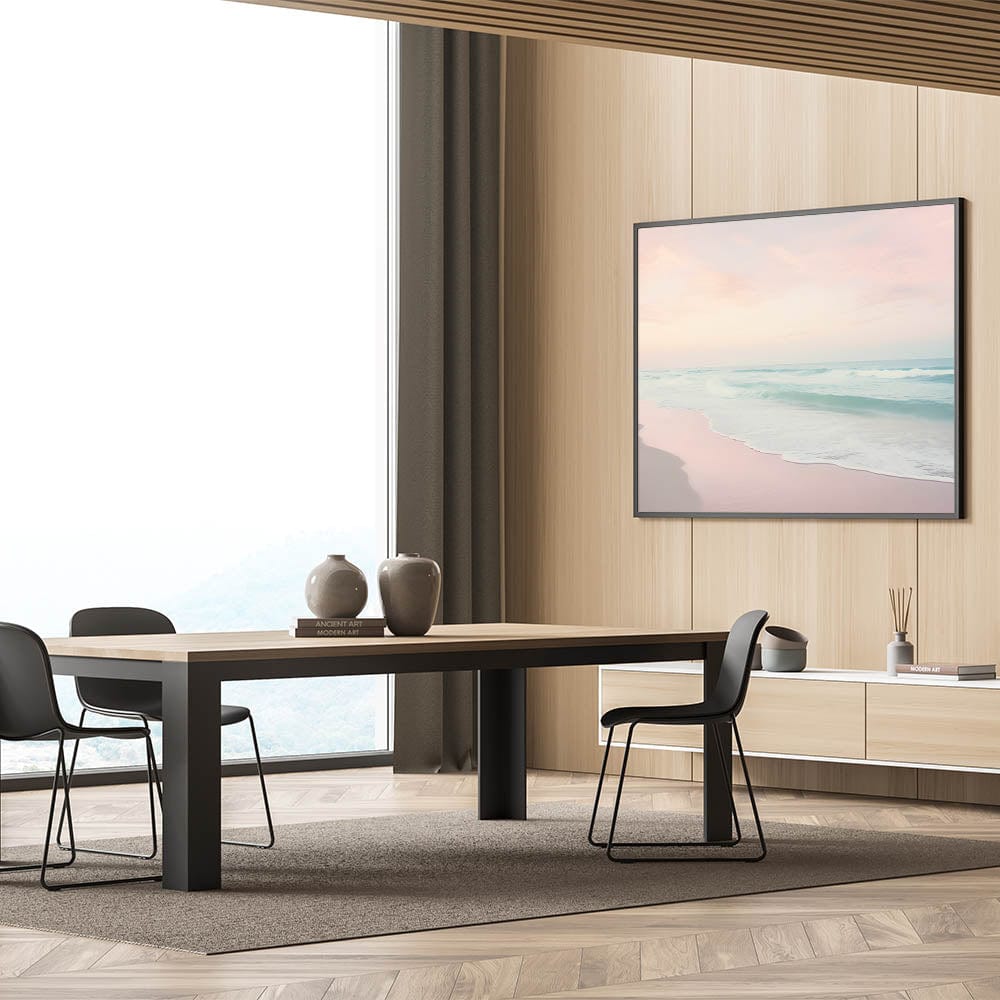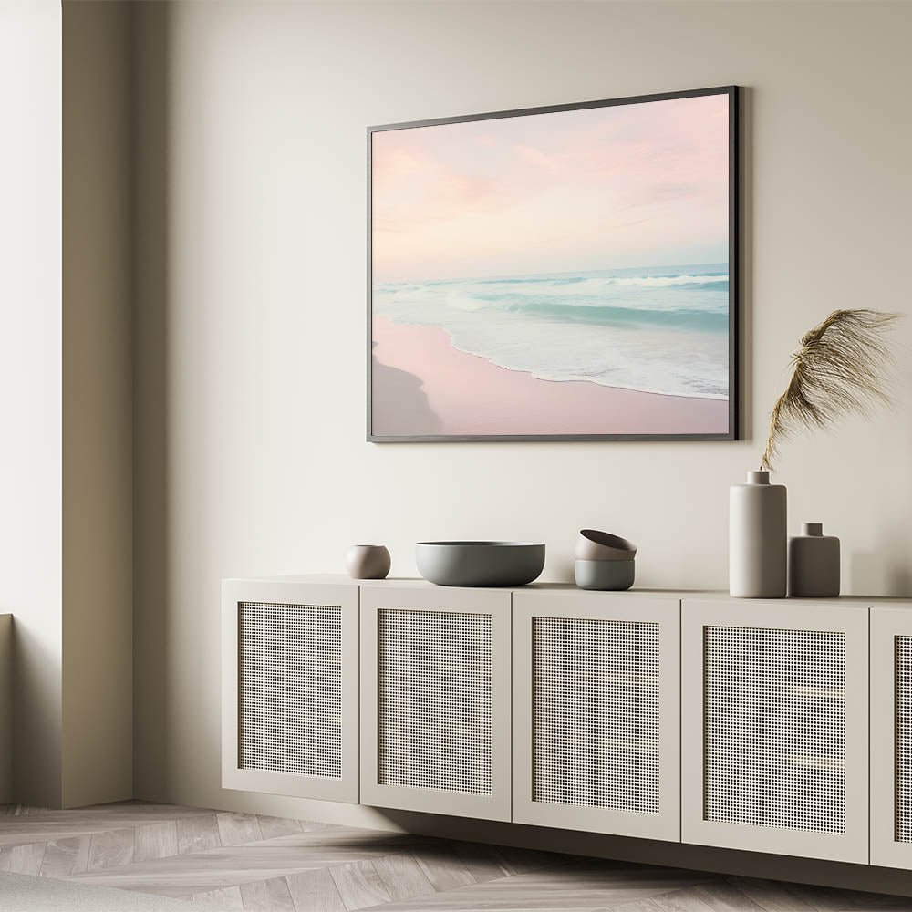 Capture the tranquil beauty of a summer shoreline with this Summer Scenery Canvas featuring a serene beach and soft pastel sky. The artwork embodies the calm essence of bright summer colors, making it perfect for creating a relaxing summer landscape in any room.