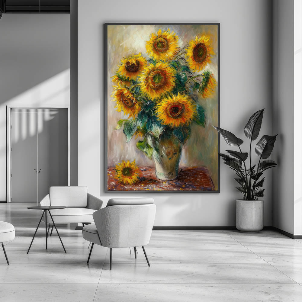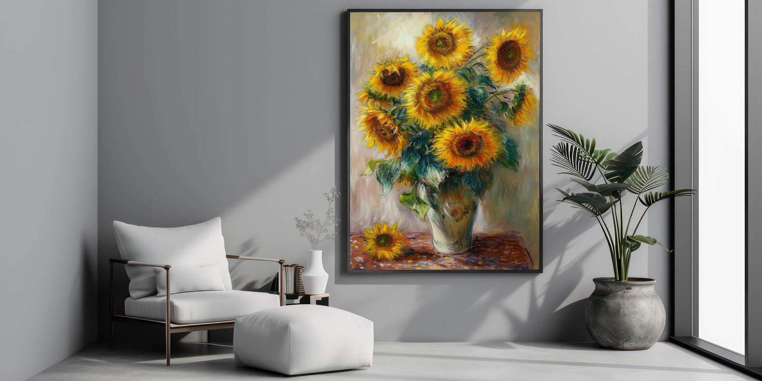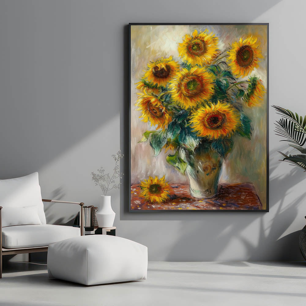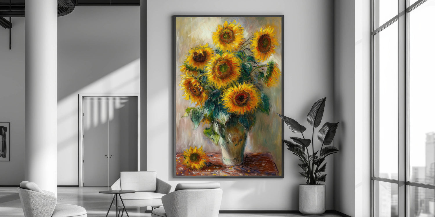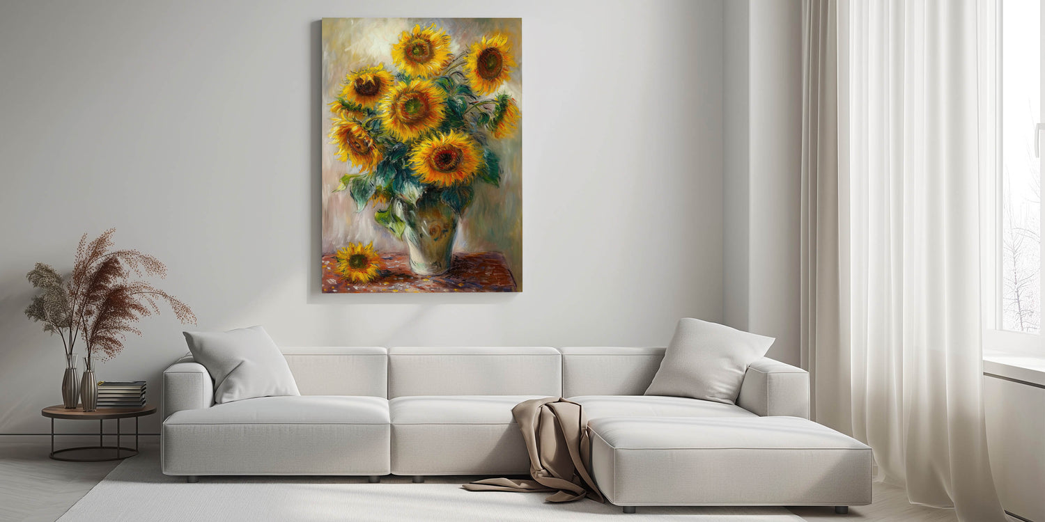 Brighten your home with the radiant beauty of sunflowers in this stunning floral wall art. Featuring golden sunflowers in a rustic vase, this modern wall art adds warmth and elegance to any space. The vibrant yellow petals, rich green leaves, and dynamic brushstrokes create a contemporary wall art masterpiece that enhances your living room wall décor.