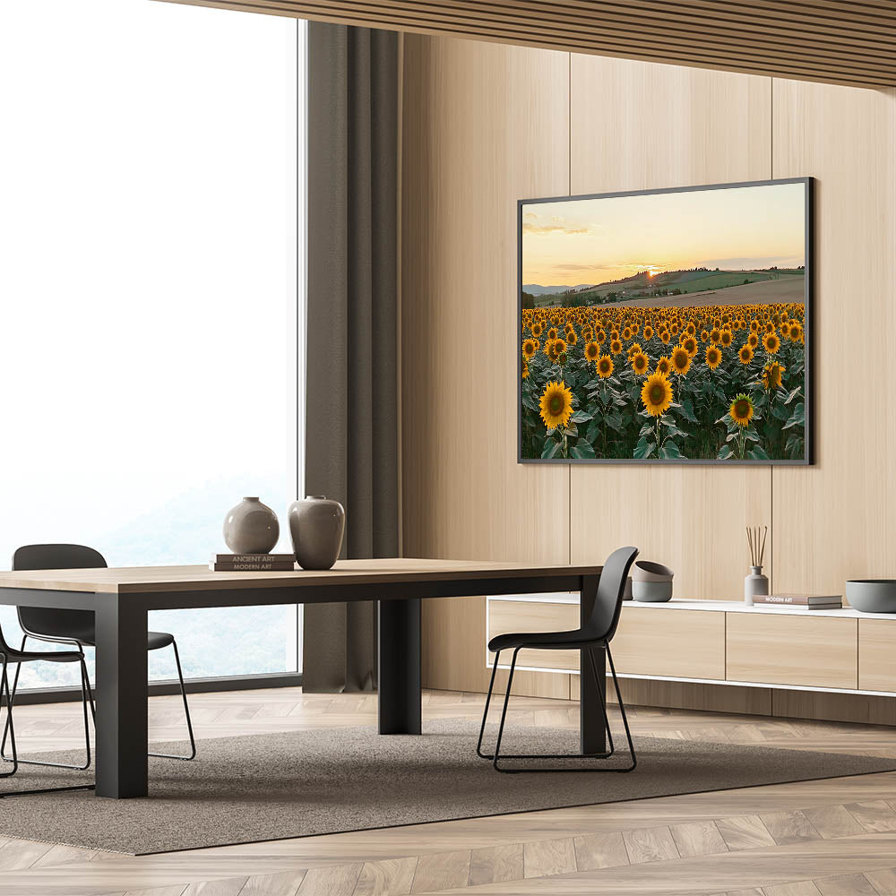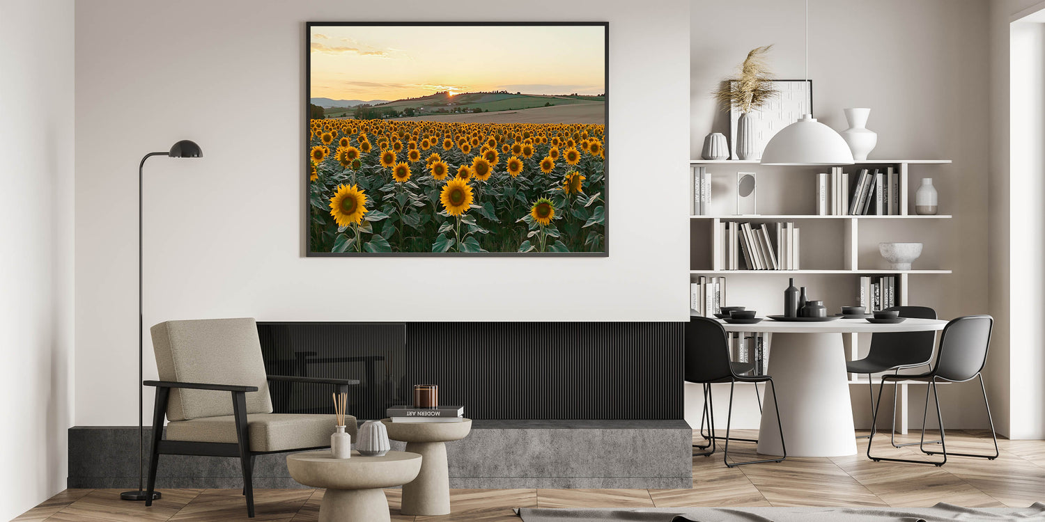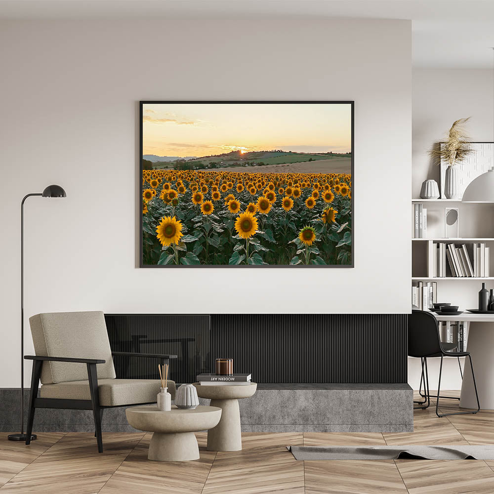 Bring the warmth and charm of the countryside into your space with this Sunflower Field at Sunset Wall Art. This breathtaking artwork captures a vibrant field of sunflowers basking in the golden glow of the setting sun, with rolling hills in the background. The vibrant yellow blooms and serene landscape create a cheerful and calming atmosphere, perfect for rustic farmhouse decor or nature-inspired interiors.