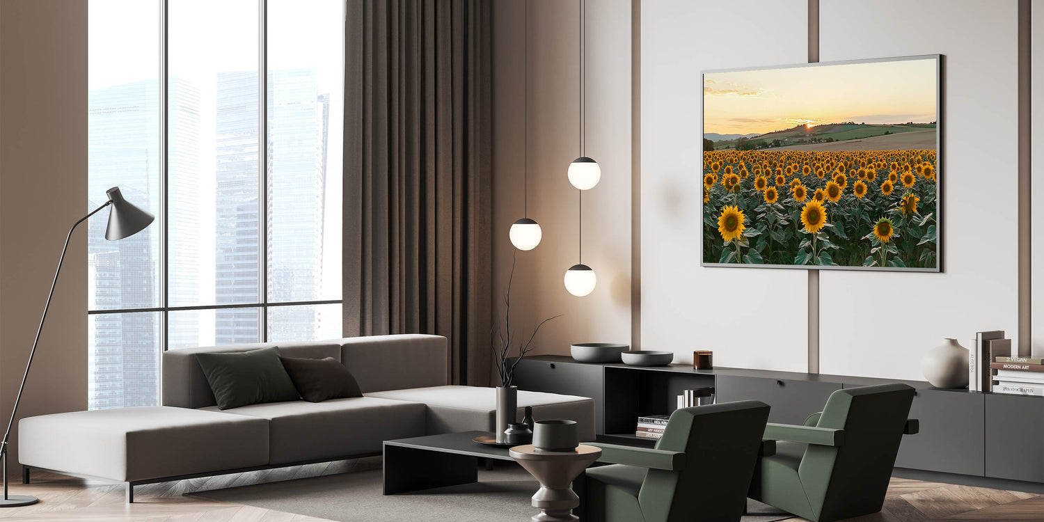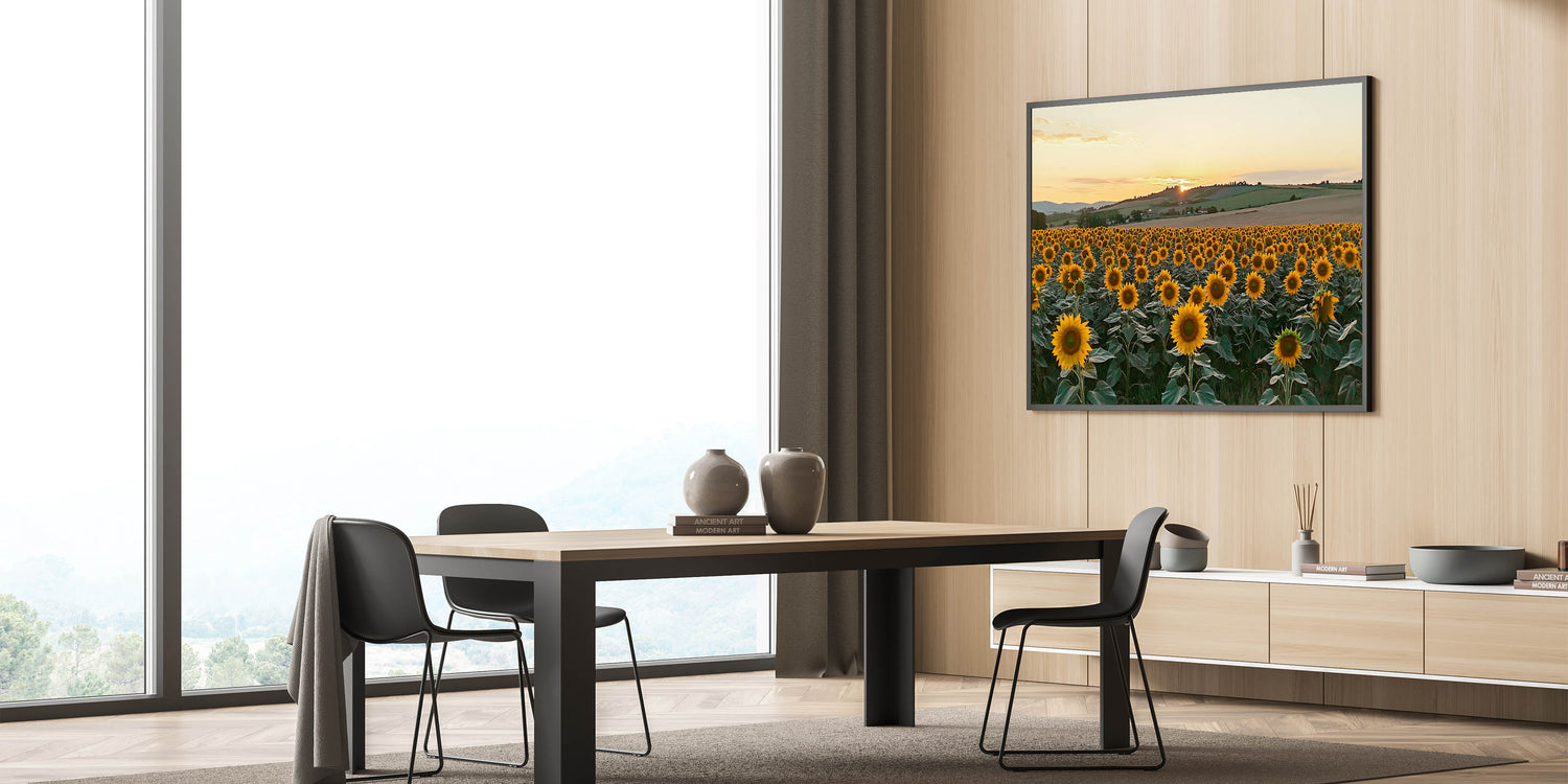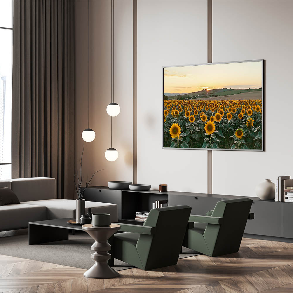 Bring the warmth and charm of the countryside into your space with this Sunflower Field at Sunset Wall Art. This breathtaking artwork captures a vibrant field of sunflowers basking in the golden glow of the setting sun, with rolling hills in the background. The vibrant yellow blooms and serene landscape create a cheerful and calming atmosphere, perfect for rustic farmhouse decor or nature-inspired interiors.