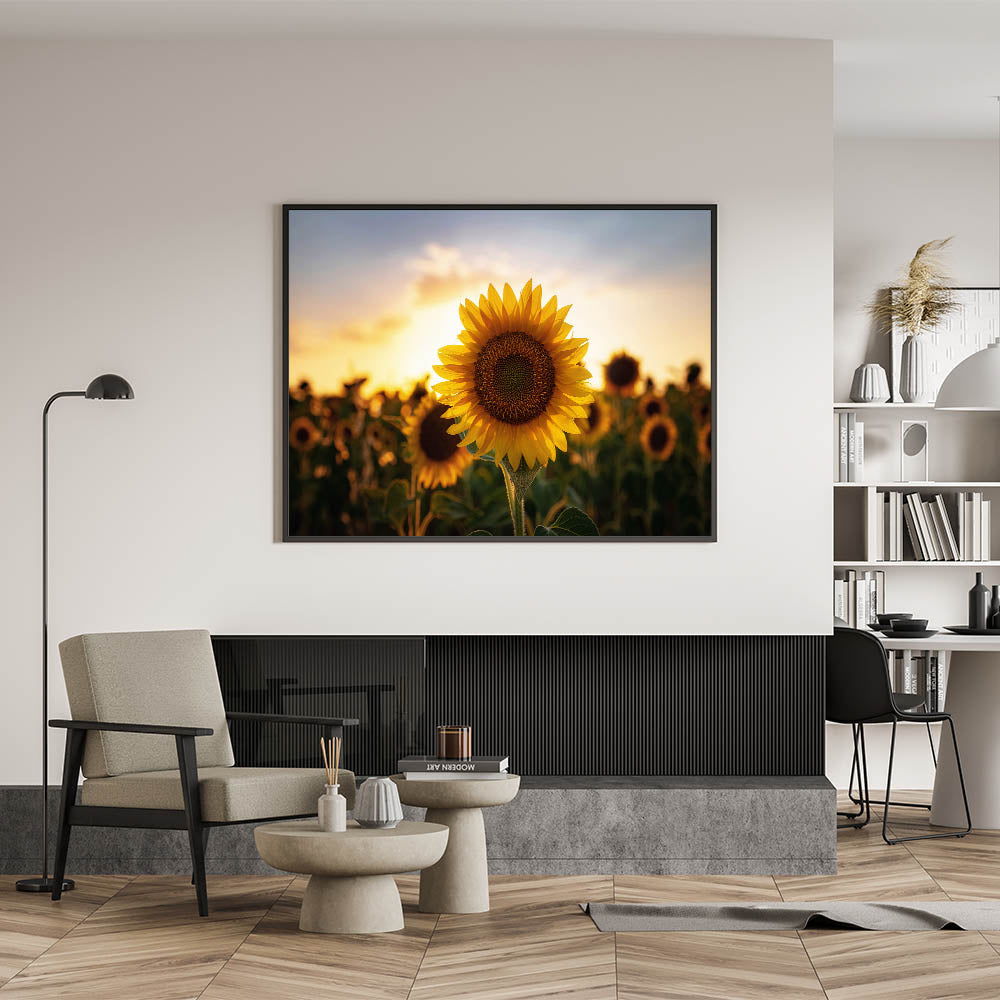 Bring the stunning beauty of Kansas to your space with this captivating sunflower wall art. Taken during a peaceful sunset in a Kansas sunflower field, this piece showcases the vibrant yellows of the sunflower against a glowing sky. Perfect for nature enthusiasts, this Kansas wall art will add warmth and a touch of nature to any room.