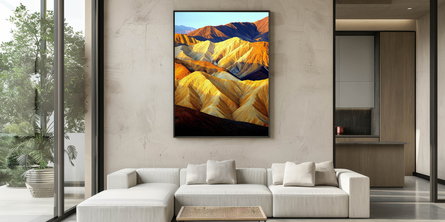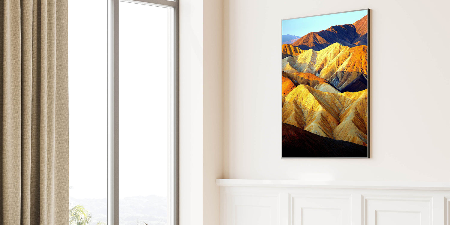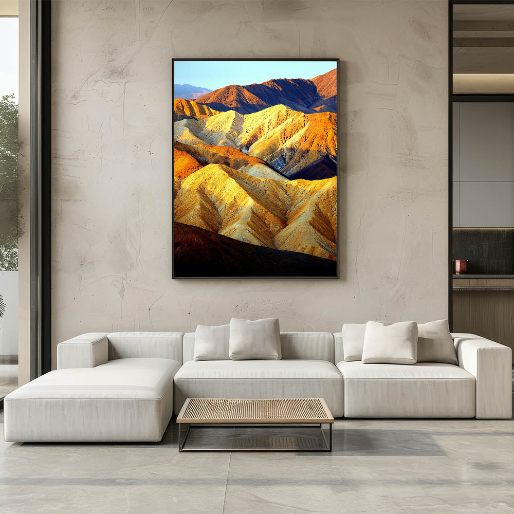 Bring the warmth and majesty of the desert into your home with this stunning Sunlit Desert Ridges artwork. The play of golden sunlight and deep shadows across the rugged peaks creates a breathtaking visual experience, capturing the essence of desert beauty. This wall art exudes depth and vibrancy, making it a captivating centerpiece for any room.