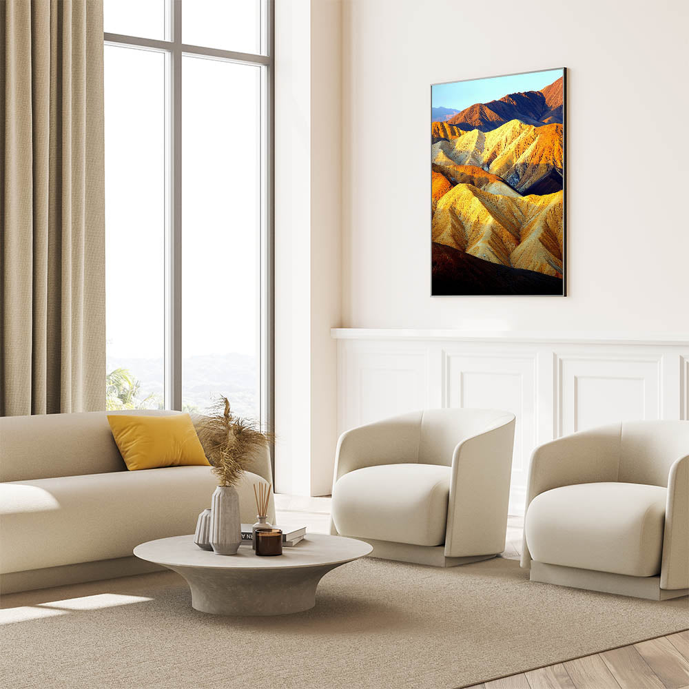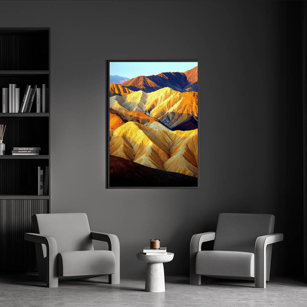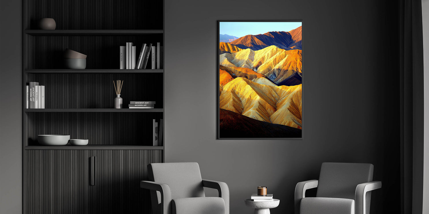 Bring the warmth and majesty of the desert into your home with this stunning Sunlit Desert Ridges artwork. The play of golden sunlight and deep shadows across the rugged peaks creates a breathtaking visual experience, capturing the essence of desert beauty. This wall art exudes depth and vibrancy, making it a captivating centerpiece for any room.