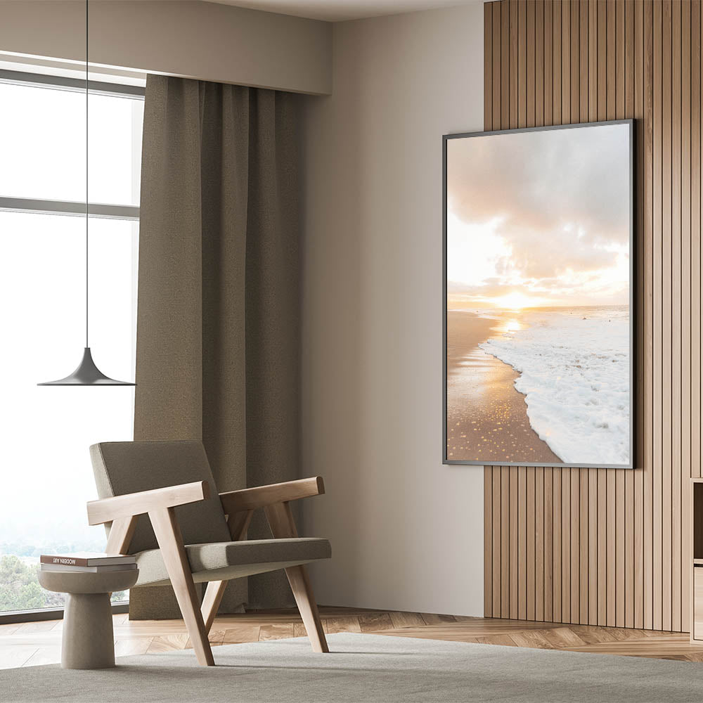 Bring the magic of a golden sunset into your home with this breathtaking sunset canvas art. Featuring foamy waves gently lapping the shoreline under a glowing sunset sky, this artwork beautifully captures the tranquility of relaxing summer landscapes. Warm tones of gold, beige, and soft gray create a soothing, vacation-inspired scene that radiates summer serenity and coastal charm.