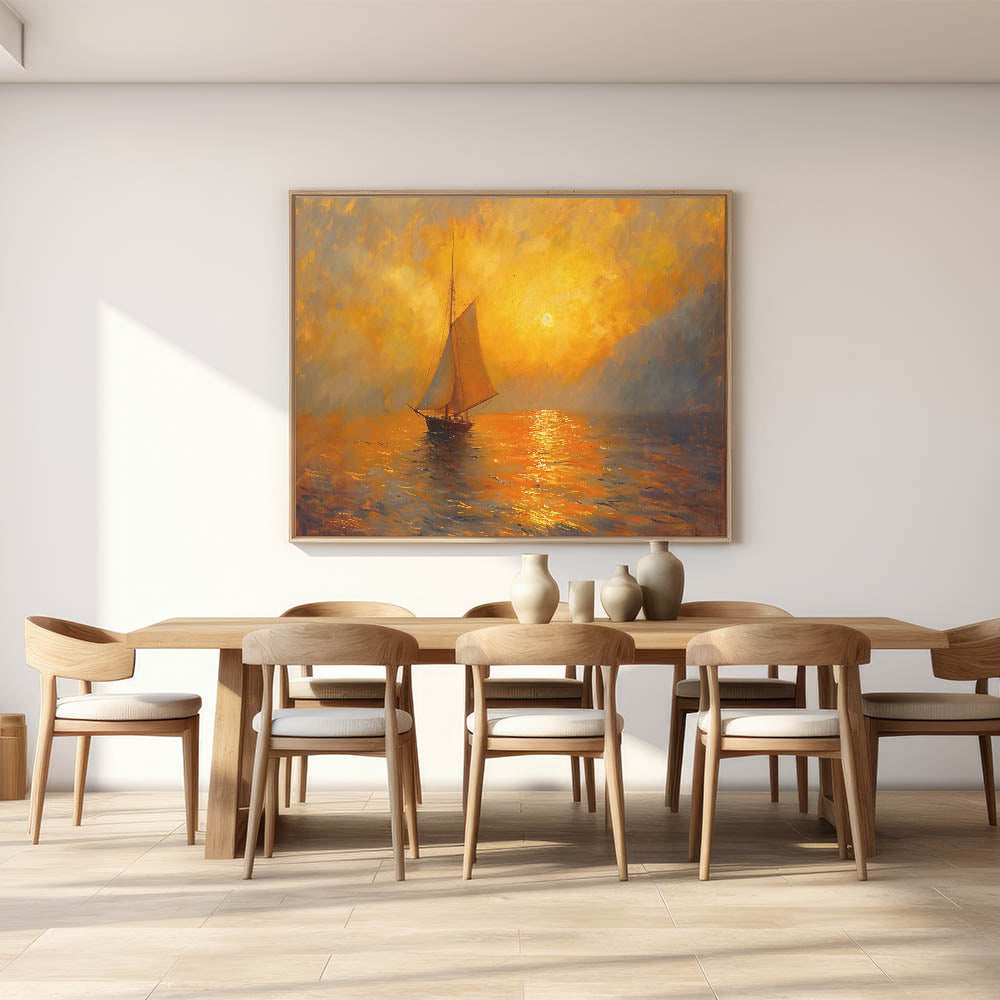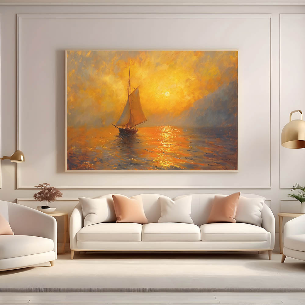 Capture the magic of the open sea at sunset with this breathtaking abstract canvas art. Featuring a lone sailboat gliding across a fiery, golden ocean, this artwork brings warmth and serenity to any space. The intense shades of orange, yellow, and warm blue blend beautifully to create a glowing sunset, making this piece a stunning focal point for living rooms, bedrooms, or offices.