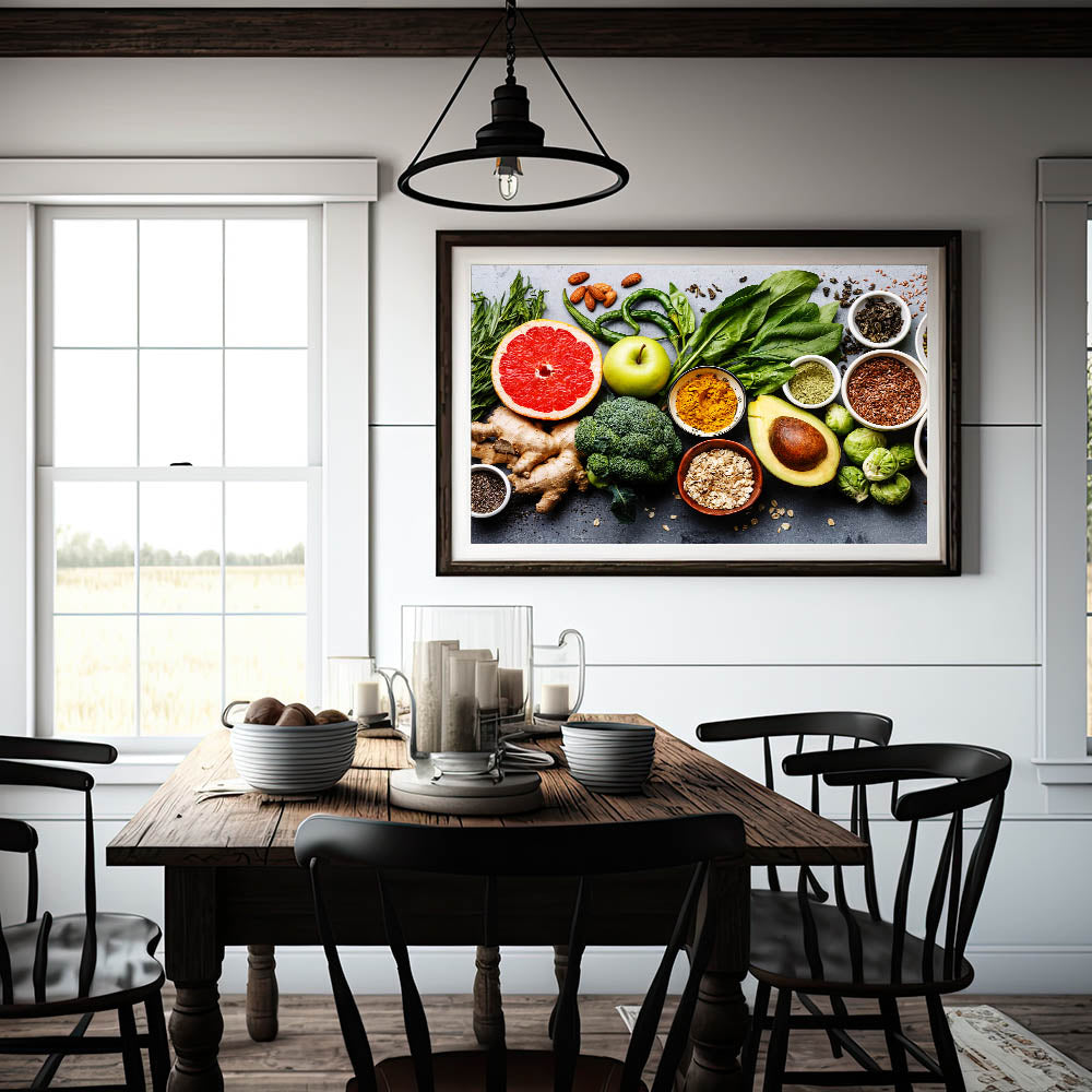 Brighten your kitchen wall decor with this modern kitchen art, featuring a stunning arrangement of fresh superfoods, vegetables, and spices. This artwork showcases a vibrant mix of avocados, grapefruit, spinach, turmeric, ginger, flax seeds, and broccoli, representing health, vitality, and natural nourishment. The fresh green hues, bold citrus tones, and rustic textures create a lively and refreshing aesthetic, perfect for healthy lifestyle enthusiasts and food lovers.