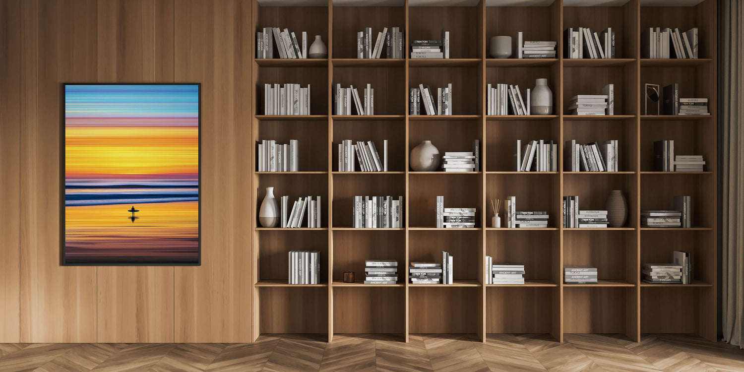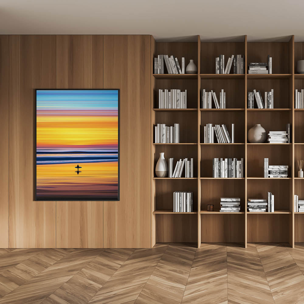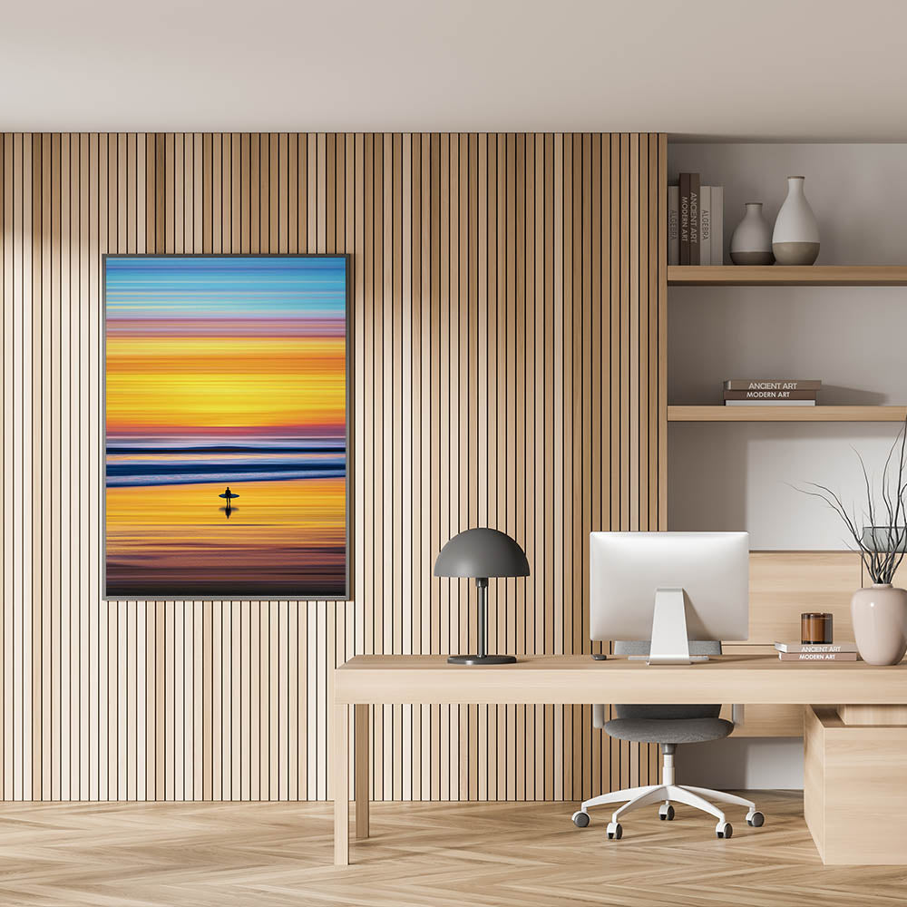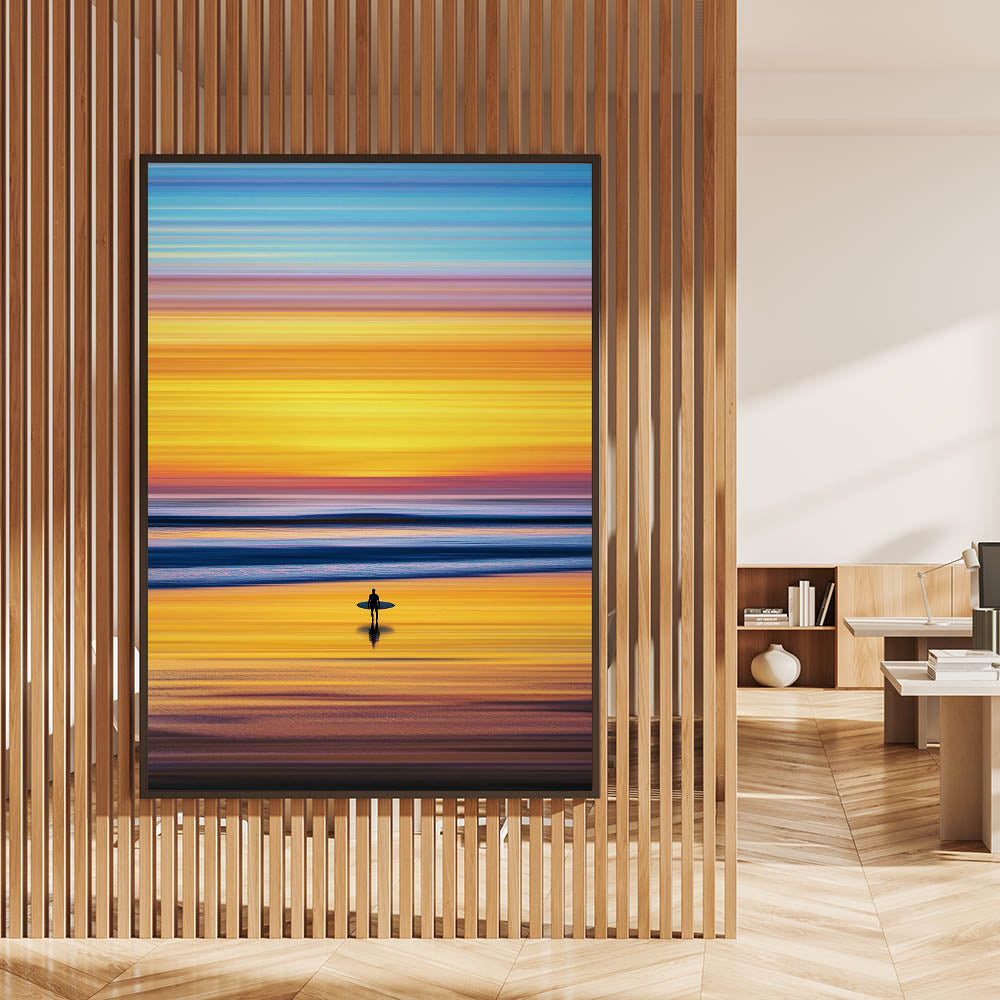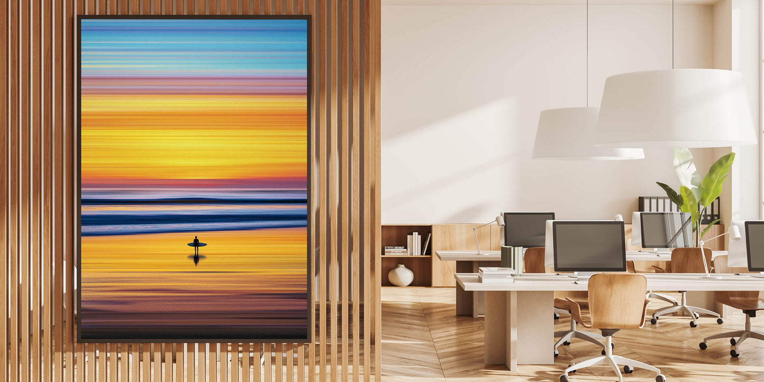 Bring energy and inspiration to your workspace with this modern office art, featuring a surfer silhouetted against a golden sunset. The stunning horizontal streaks of blue, yellow, and orange create a dynamic and artistic composition, making this piece an ideal choice for contemporary office décor in creative spaces, conference rooms, and corporate offices.