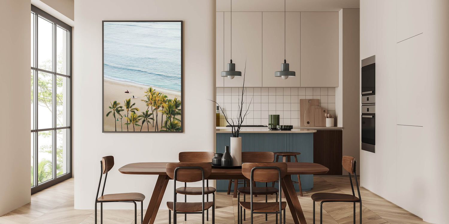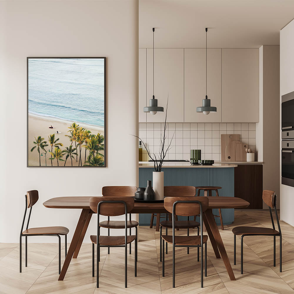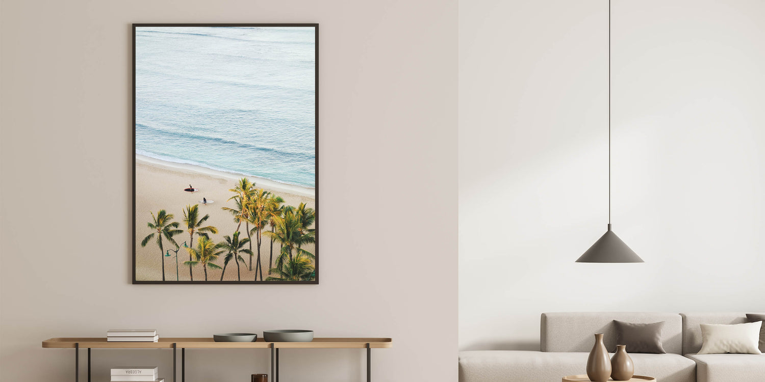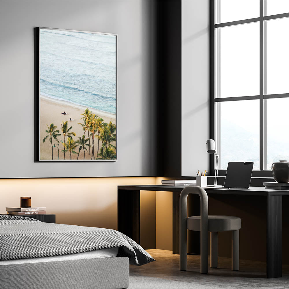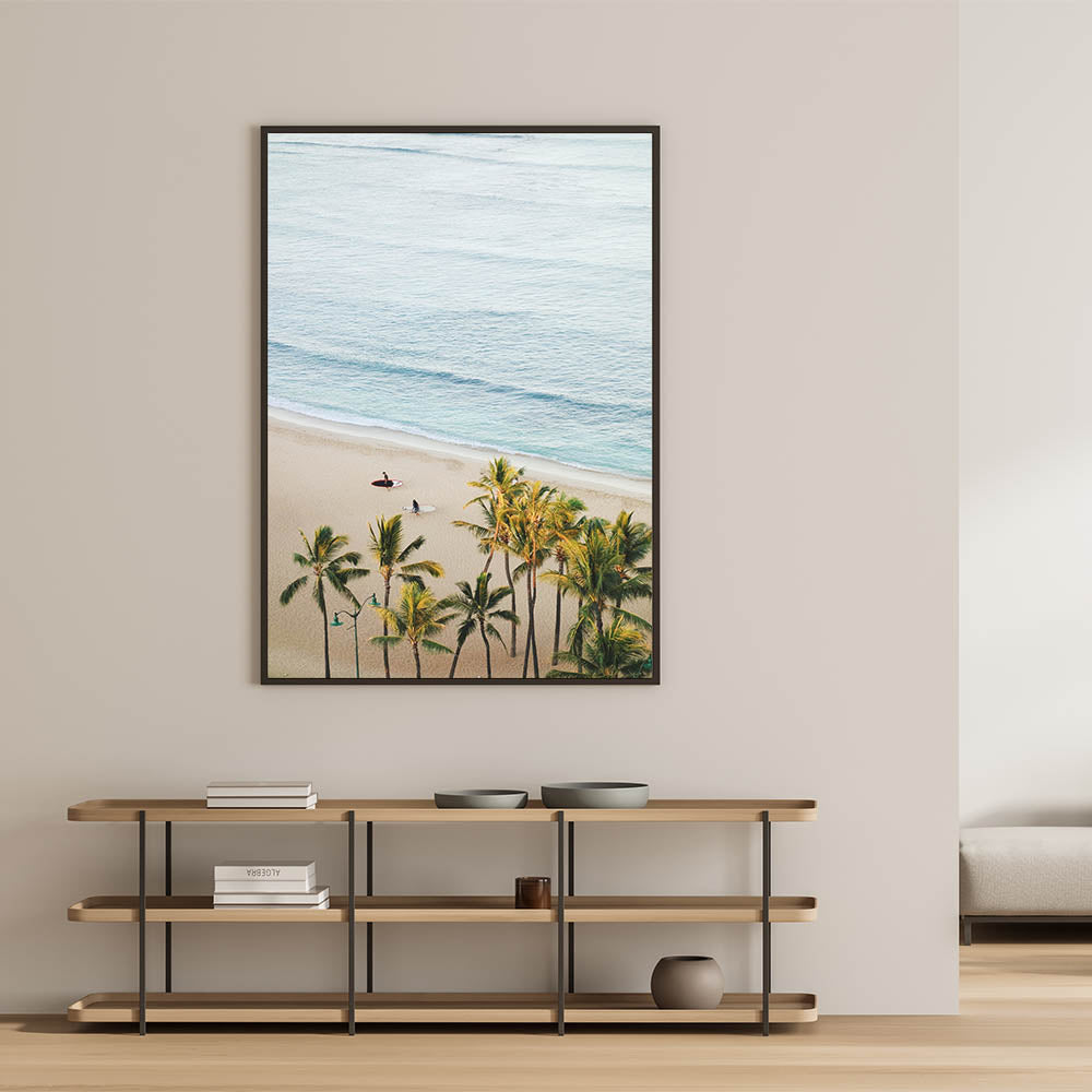 Bring the peaceful charm of a tropical paradise into your home with this summer wall art featuring an aerial view of surfers on a sandy beach surrounded by lush palm trees. The gentle waves and golden sands make this summer canvas art a perfect addition to coastal-inspired interiors, beach homes, and relaxation spaces. Whether you’re a surf lover or simply enjoy the tranquility of the ocean, this beach wall art will enhance any room.