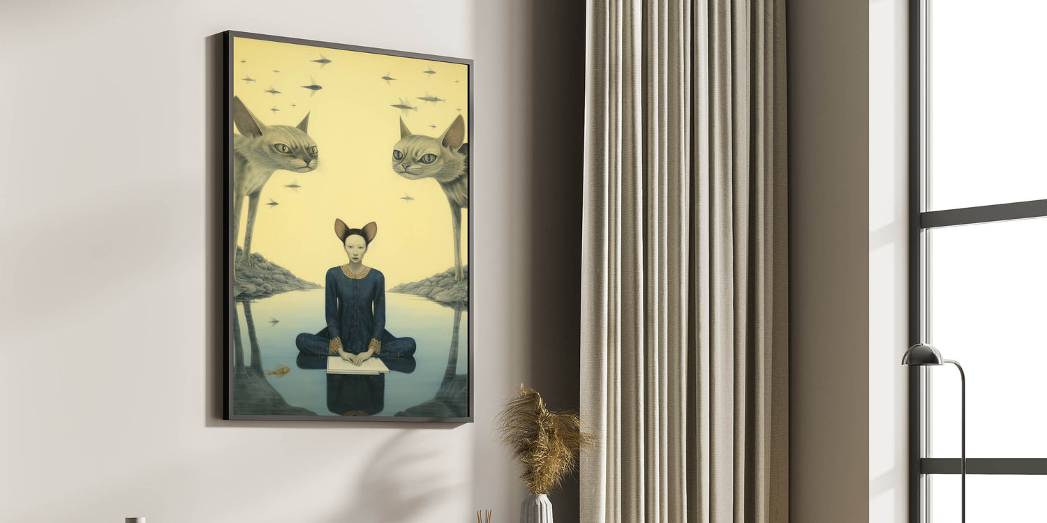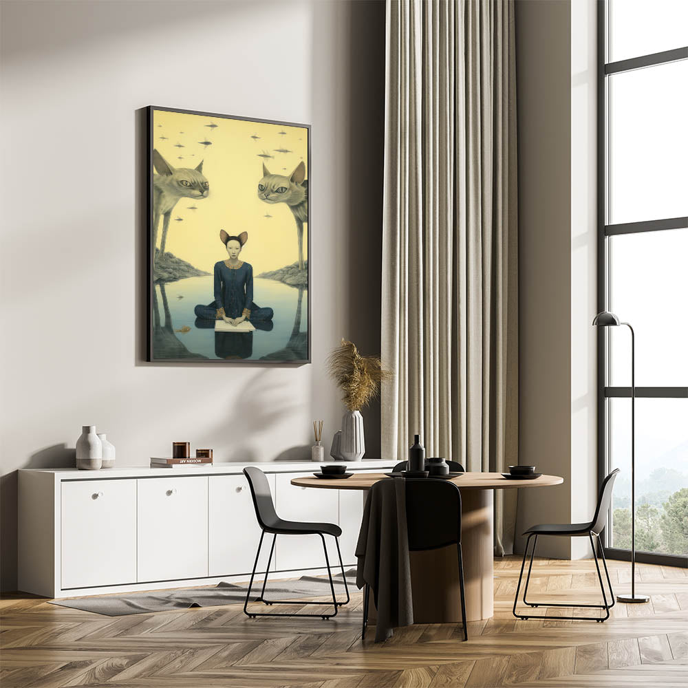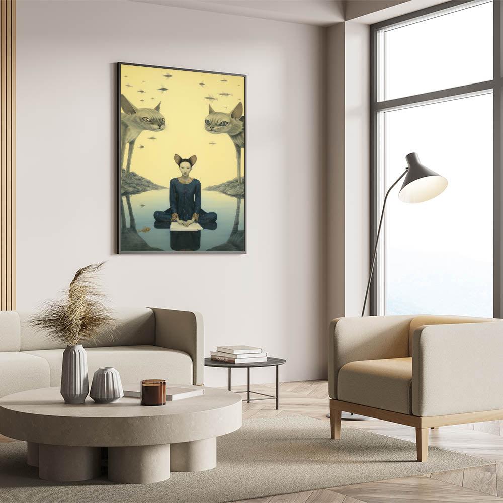 Dive into the world of surrealism with this electric wall art, featuring a mystical scene of a meditative figure surrounded by two large, otherworldly cats. The dreamlike atmosphere is amplified by the soft yellow backdrop, complemented by the figure’s deep blue attire and the fantastical birds in the sky. This unique electric artwork captivates the viewer with its blend of serenity and whimsy, perfect for those who love imaginative, abstract designs.