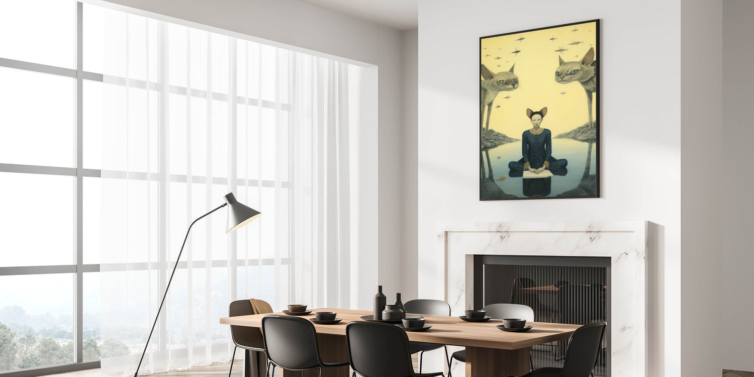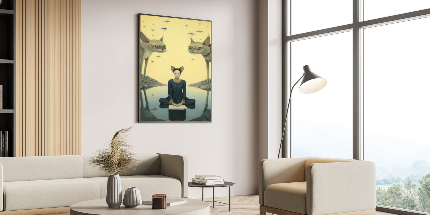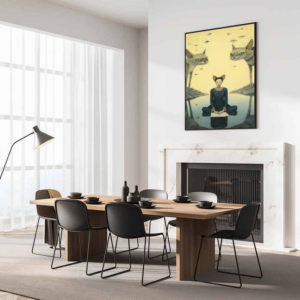 Dive into the world of surrealism with this electric wall art, featuring a mystical scene of a meditative figure surrounded by two large, otherworldly cats. The dreamlike atmosphere is amplified by the soft yellow backdrop, complemented by the figure’s deep blue attire and the fantastical birds in the sky. This unique electric artwork captivates the viewer with its blend of serenity and whimsy, perfect for those who love imaginative, abstract designs.