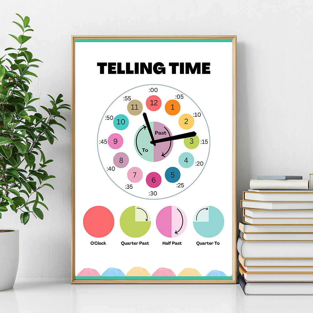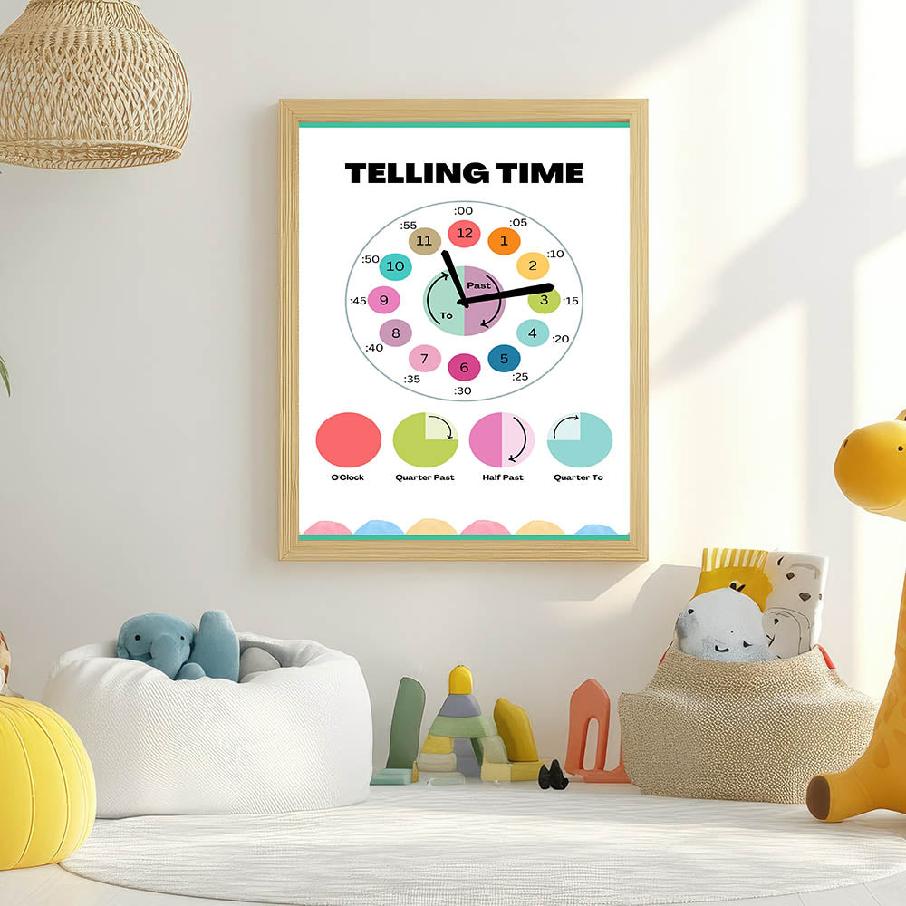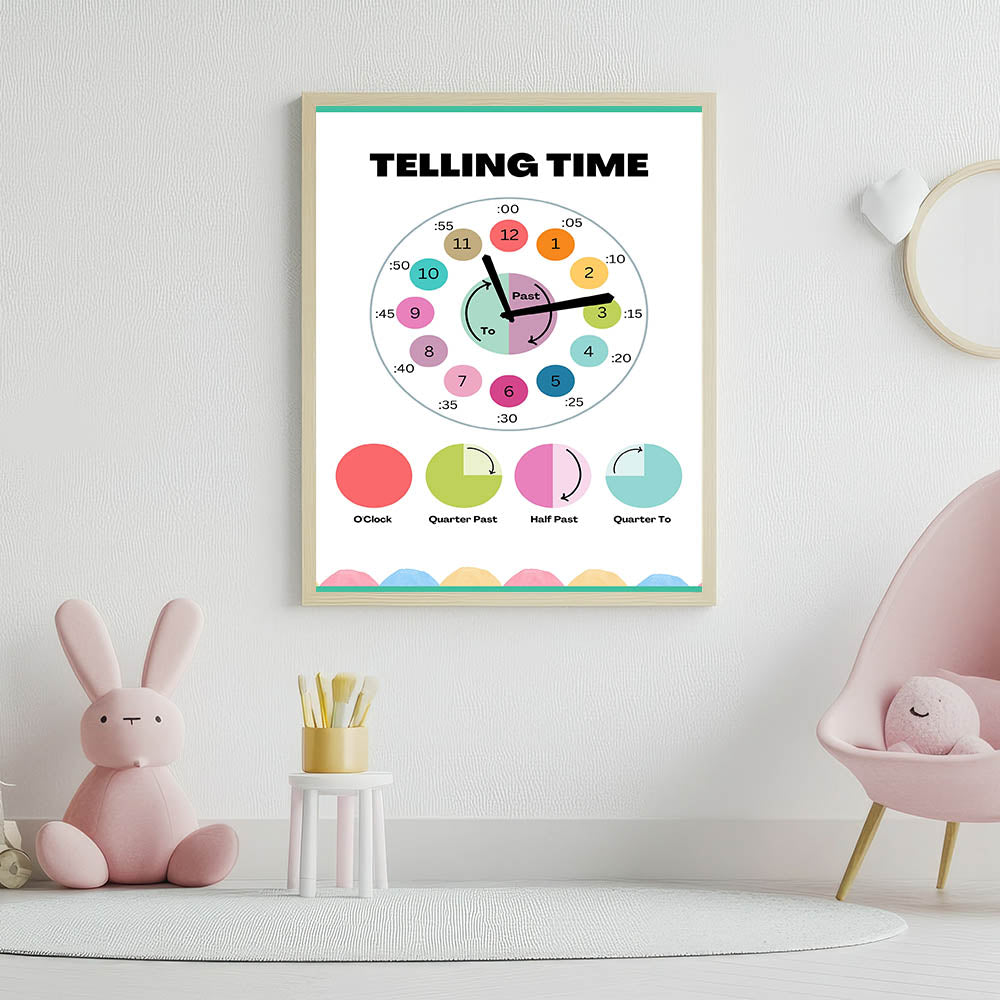 Telling Time Kids Educational Wall Art – Clock Learning Poster