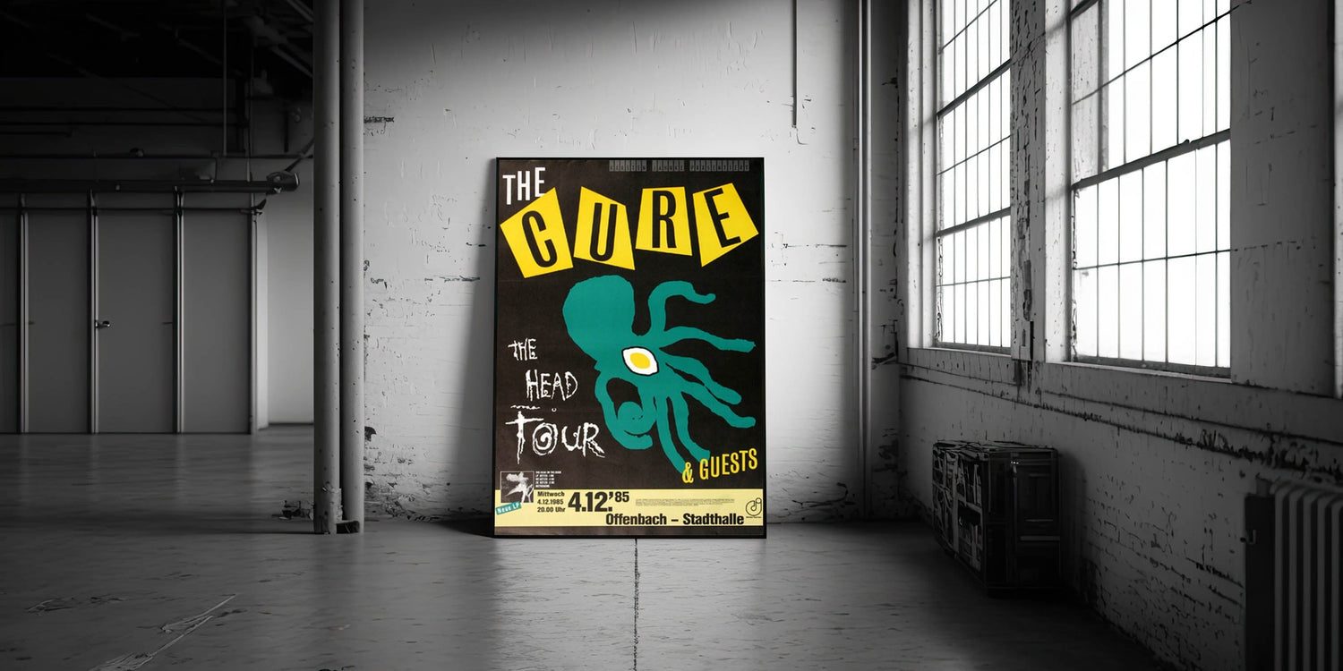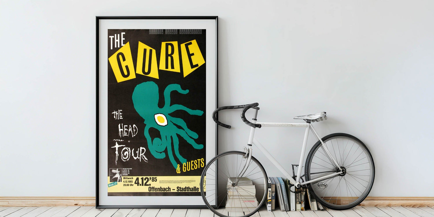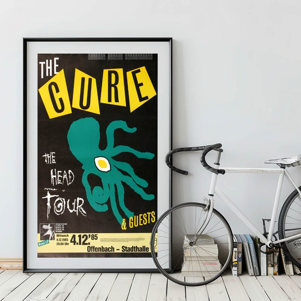 Step back to the iconic '80s with this vintage The Cure "The Head Tour" 1985 concert poster. Featuring a striking design of an abstract octopus and bold yellow and black typography, this poster captures the eerie and atmospheric energy of The Cure during their "The Head Tour." The bold graphics, including the quirky, graphic octopus and the energetic yellow accents, make this a standout piece for fans of gothic and alternative rock.
