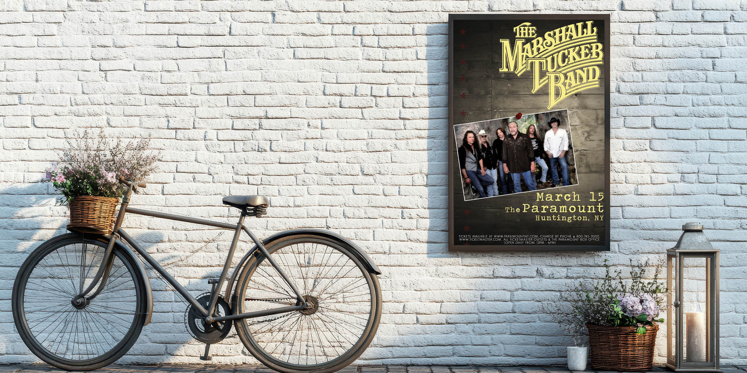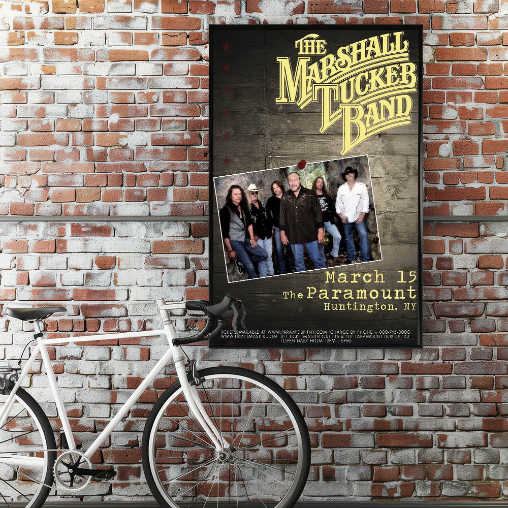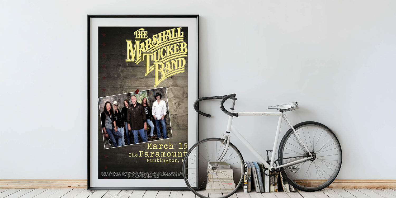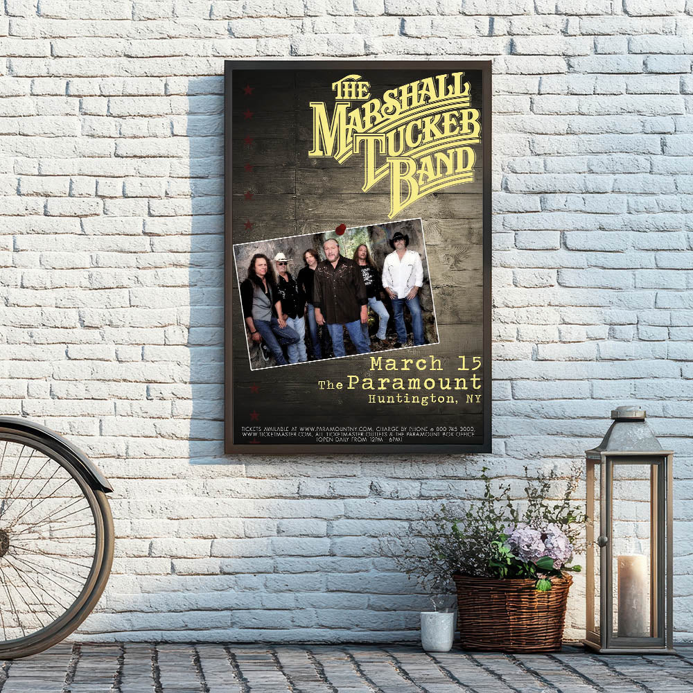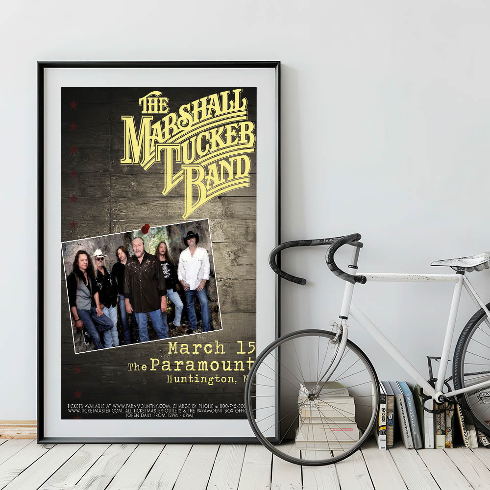 This vintage concert poster features The Marshall Tucker Band’s 2016 performance at The Paramount in Huntington, NY. Set against a rustic wooden background, the design features the band’s iconic logo in bold yellow letters and a group photo of the legendary Southern rock band. This nostalgic print is a perfect tribute to one of the most influential Southern rock bands. The warm earthy tones and vintage typography give this poster a timeless, classic appeal for any music lover or fan of Southern rock.
