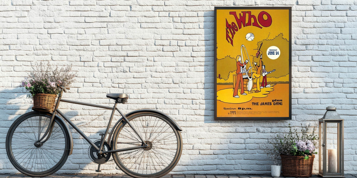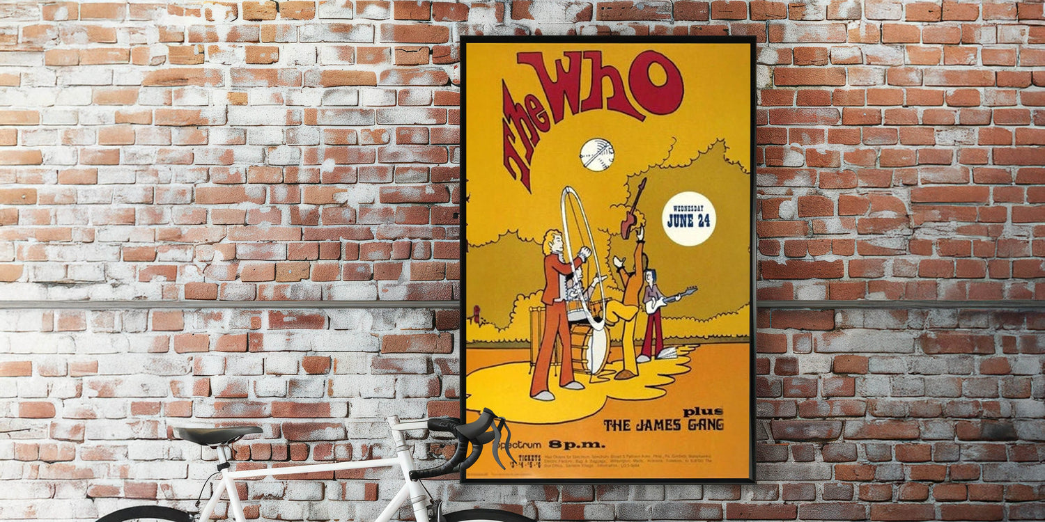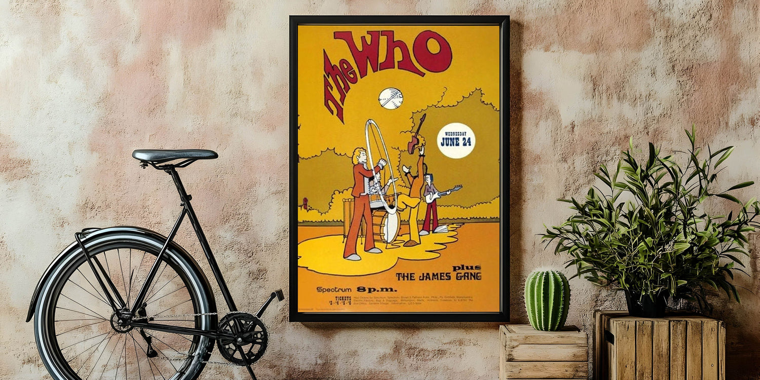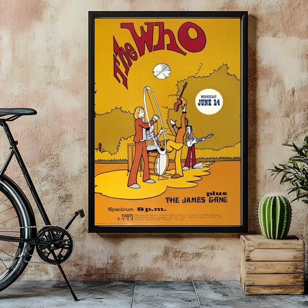 Celebrate The Who with this fun and vibrant 1969 concert poster, featuring their legendary performance at the Spectrum, plus The James Gang. The animated design, with bold yellow and red tones, captures the playful energy of the era. This unique retro poster brings together rock and cartoon-inspired art for a fun and colorful tribute to one of the biggest bands of the 1960s.