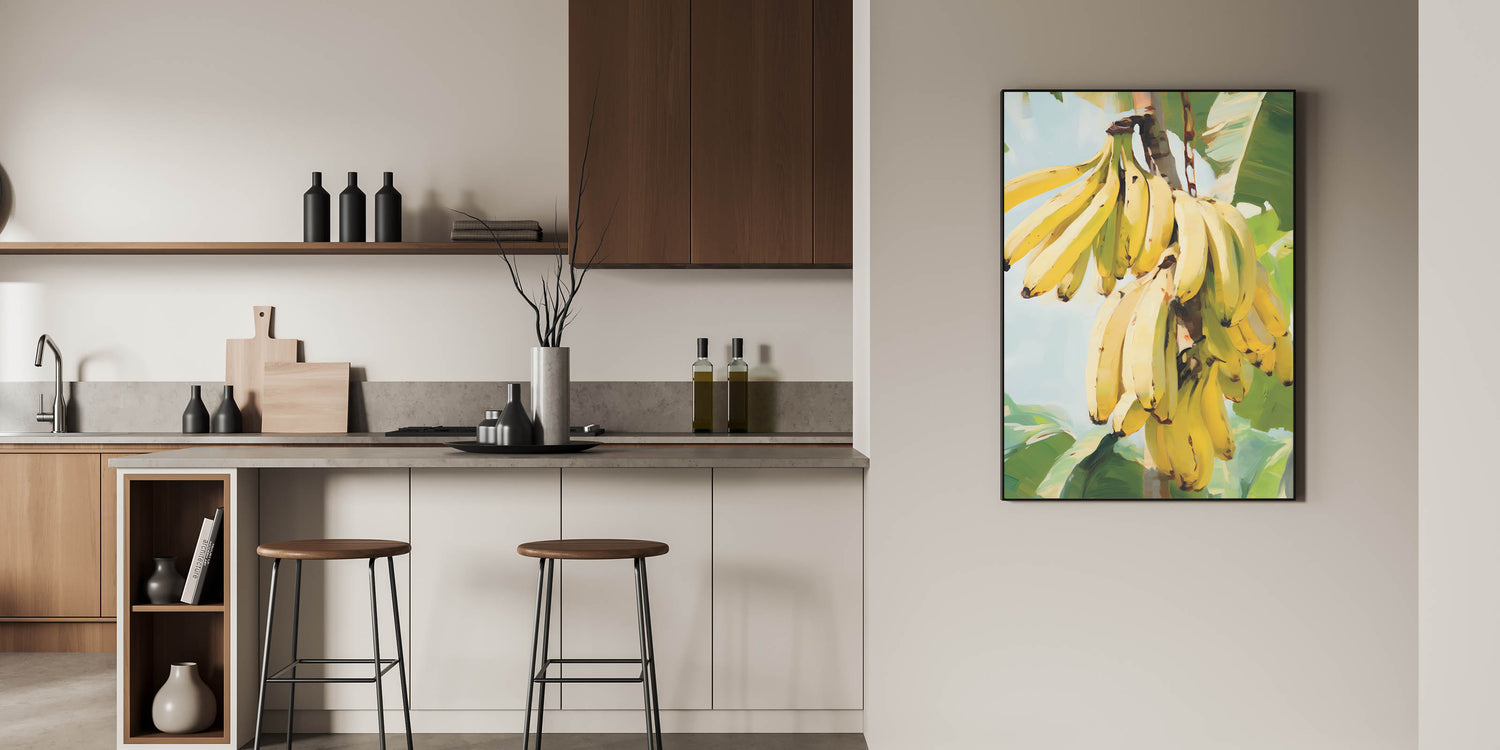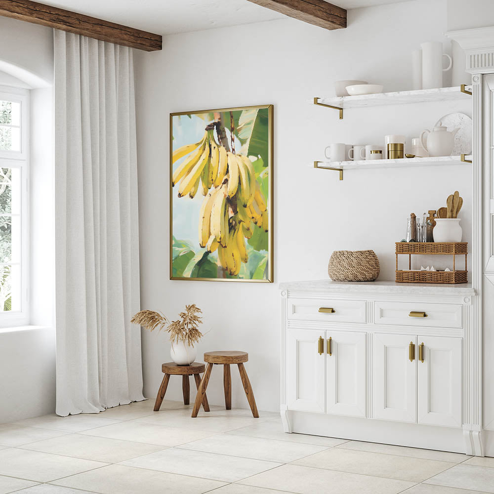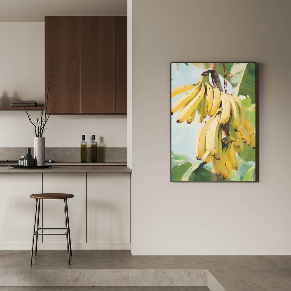 Brighten your space with this fruit canvas art, featuring a stunning artistic depiction of ripe bananas on a tree, surrounded by lush green leaves. The vibrant yellow and fresh green hues, set against a soft sky blue backdrop, create a refreshing and tropical aesthetic. This fruit photography art is perfect for kitchen fruit decor, bringing warmth and a lively atmosphere to any space. Whether you love a modern, coastal, or tropical-inspired style, this fruit-themed wall art adds a vibrant, natural touch.
