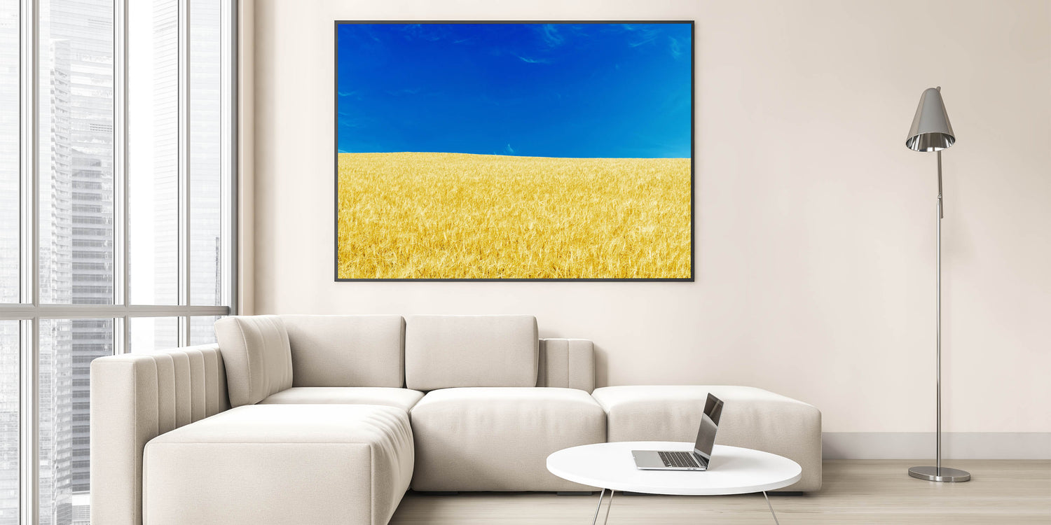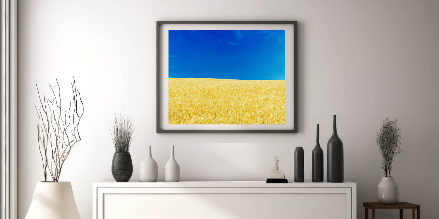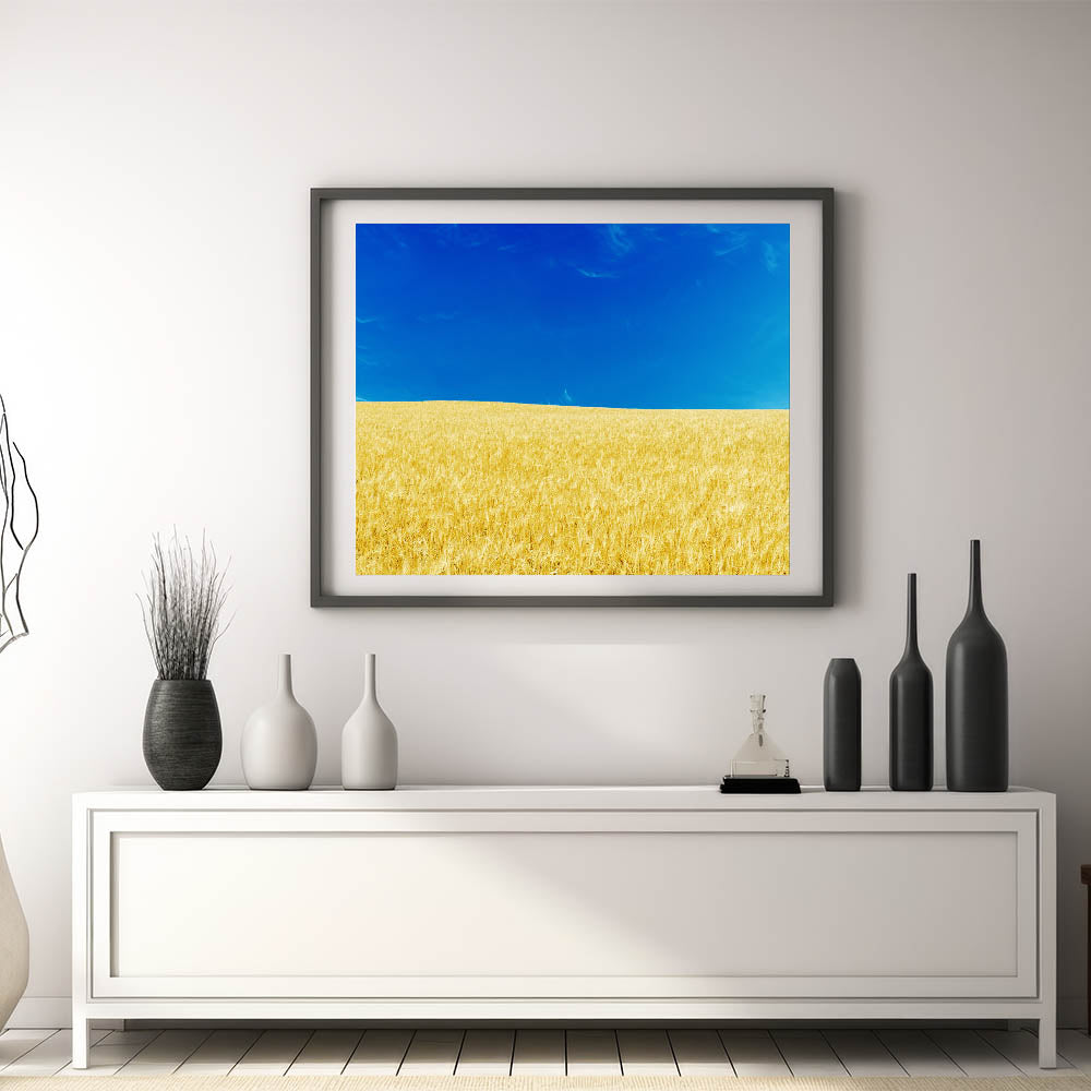 Celebrate the vibrant beauty of Ukraine with this breathtaking Ukraine Wall Art, showcasing a golden wheat field under a vivid blue sky. This minimalist yet powerful composition captures the essence of Ukraine's agricultural landscape, creating a striking visual balance between the bright yellow wheat and the serene blue sky. This artwork is perfect for adding a touch of nature and tranquility to your home or office.
