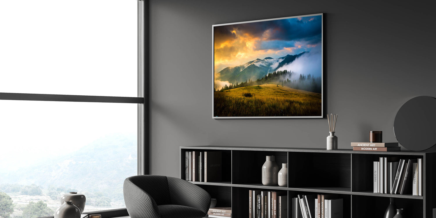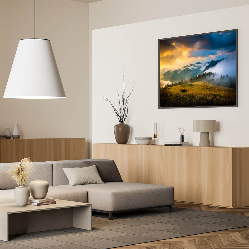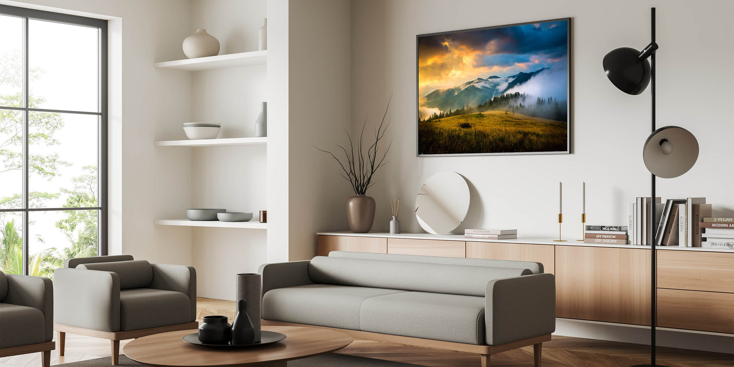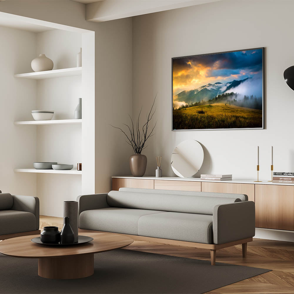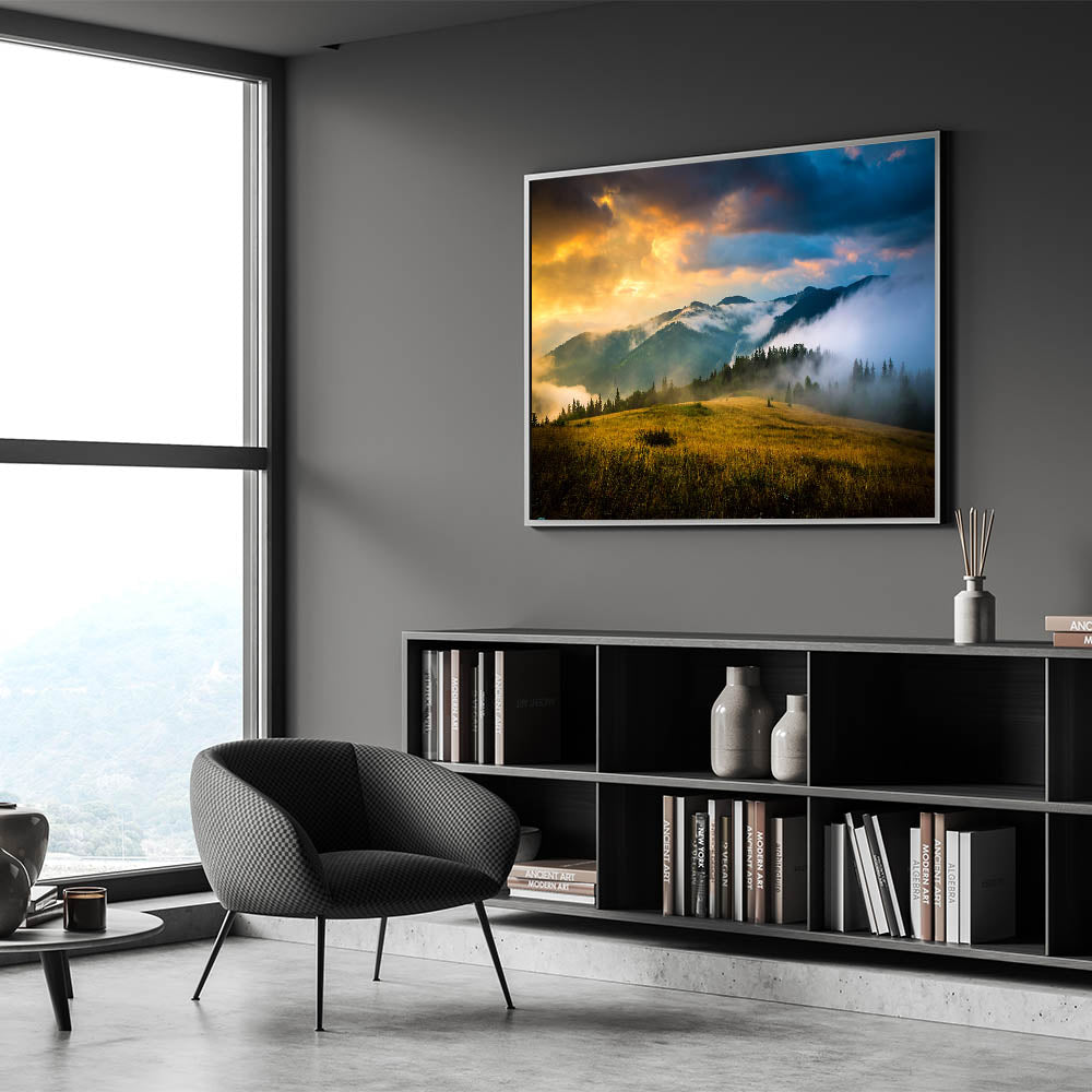 Bring the awe-inspiring beauty of the Ukrainian mountains into your home with this Ukrainian Landscape Art. This artwork showcases a tranquil scene of mist rolling over the hills under a fiery sunset, creating a breathtaking view of Ukraine's natural splendor. Perfect for any setting, this piece embodies the raw, untamed beauty of Eastern Europe’s landscapes.